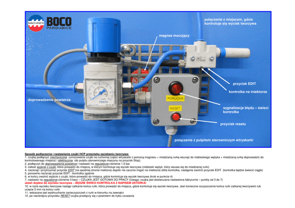 poł czenie z miejscem, gdzie kontroluje si wyciek tworzywa magnes mocuj cy przycisk EDIT kontrolka na iniektorze doprowadzenie powietrza sygnalizacja bł du – wieci kontrolka przycisk resetu poł czenie z pulpitem sterowniczym wtryskarki Sposób podł czenia i nastawienia czujki HCP przeciwko zaciekaniu tworzywa: 1. czujk podł czy mechanicznie (umocowanie czujki na ruchomej cz ci wtryskarki z pomoc magnesu + miedzian rurk wsun do niebieskiego w yka + miedzian rurk doprowadzi do kontrolowanego miejsca) i elektrycznie (do pulpitu sterowniczego maszyny na przycisk Stop). 2. podł czy do doprowadzenia powietrza i nastawi na regulatorze ci nienie 1,5 bar 3. zatka wyj cie z czujki, które prowadzi do miejsca, w którym kontroluje si wyciek tworzywa (niebieski w yk, który wsuwa si do miedzianej rurki) 4. nacisn i przytrzyma przycisk EDIT (na spodniej stronie iniektora) dopóki nie zacznie miga na iniektorze ółta kontrolka, nast pnie zwolni przycisk EDIT (kontrolka b dzie wieci ci gle) 5. ponownie nacisn przycisk EDIT - kontrolka zga nie 6. w ko cu zwolni wyj cie z czujki, które prowadzi do miejsca, gdzie kontroluje si wyciek tworzywa (krok w punkcie 4) 7. nastawi na regulatorze ci nienie 3 bary – CZUJKA JEST GOTOWA DO PRACY (Uwaga: czujka jest dostarczana nastawiona fabrycznie – punkty od 3 do 7) Je eli dojdzie do wycieku tworzywa – B DZIE WIECI KONTROLKA Z NAPISEM USTERKA! 10. w razie wycieku tworzywa nast pi zatkanie ko ca rurki, która prowadzi do miejsca, gdzie kontroluje si wyciek tworzywa. Jest konieczne oczyszczenie ko ca rurki zatkanej tworzywem lub uci cie 5 mm na ko cu rurki 11. wskazane jest wydmuchanie zanieczyszcze z rurki w kierunku na zewn trz 12. po naci ni ciu przycisku RESET czujka przeł czy si z powrotem do trybu czuwania