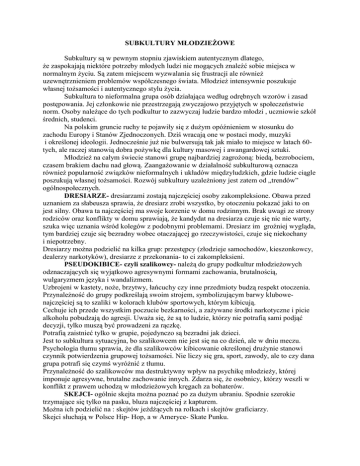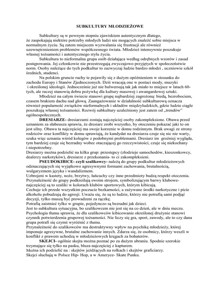 SUBKULTURY MŁODZIEśOWE Subkultury są w pewnym stopniu zjawiskiem autentycznym dlatego, Ŝe zaspokajają niektóre potrzeby młodych ludzi nie mogących znaleźć sobie miejsca w normalnym Ŝyciu. Są zatem miejscem wyzwalania się frustracji ale równieŜ uzewnętrznieniem problemów współczesnego świata. MłodzieŜ intensywnie poszukuje własnej toŜsamości i autentycznego stylu Ŝycia. Subkultura to nieformalna grupa osób działająca według odrębnych wzorów i zasad postępowania. Jej członkowie nie przestrzegają zwyczajowo przyjętych w społeczeństwie norm. Osoby naleŜące do tych podkultur to zazwyczaj ludzie bardzo młodzi , uczniowie szkół średnich, studenci. Na polskim gruncie ruchy te pojawiły się z duŜym opóźnieniem w stosunku do zachodu Europy i Stanów Zjednoczonych. Dziś wracają one w postaci mody, muzyki i określonej ideologii. Jednocześnie juŜ nie bulwersują tak jak miało to miejsce w latach 60tych, ale raczej stanowią dobra poŜywkę dla kultury masowej i awangardowej sztuki. MłodzieŜ na całym świecie stanowi grupę najbardziej zagroŜoną: biedą, bezrobociem, czasem brakiem dachu nad głową. ZaangaŜowanie w działalność subkulturową oznacza równieŜ popularność związków nieformalnych i układów międzyludzkich, gdzie ludzie ciągle poszukują własnej toŜsamości. Rozwój subkultury uzaleŜniony jest zatem od „trendów” ogólnospołecznych. DRESIARZE- dresiarzami zostają najczęściej osoby zakompleksione. Obawa przed uznaniem za słabeusza sprawia, Ŝe dresiarz zrobi wszystko, by otoczeniu pokazać jaki to on jest silny. Obawa ta najczęściej ma swoje korzenie w domu rodzinnym. Brak uwagi ze strony rodziców oraz konflikty w domu sprawiają, Ŝe kandydat na dresiarza czuje się nic nie warty, szuka więc uznania wśród kolegów z podobnymi problemami. Dresiarz im groźniej wygląda, tym bardziej czuje się bezradny wobec otaczającej go rzeczywistości, czuje się niekochany i niepotrzebny. Dresiarzy moŜna podzielić na kilka grup: przestępcy (złodzieje samochodów, kieszonkowcy, dealerzy narkotyków), dresiarze z przekonania- to ci zakompleksieni. PSEUDOKIBICE- czyli szalikowcy- naleŜą do grupy podkultur młodzieŜowych odznaczających się wyjątkowo agresywnymi formami zachowania, brutalnością, wulgaryzmem języka i wandalizmem. Uzbrojeni w kastety, noŜe, brzytwy, łańcuchy czy inne przedmioty budzą respekt otoczenia. PrzynaleŜność do grupy podkreślają swoim strojem, symbolizującym barwy klubowenajczęściej są to szaliki w kolorach klubów sportowych, którym kibicują. Cechuje ich przede wszystkim poczucie bezkarności, a zaŜywane środki narkotyczne i picie alkoholu pobudzają do agresji. UwaŜa się, Ŝe są to ludzie, którzy nie potrafią sami podjąć decyzji, tylko muszą być prowadzeni za rączkę. Potrafią zaistnieć tylko w grupie, pojedynczo są bezradni jak dzieci. Jest to subkultura sytuacyjna, bo szalikowcem nie jest się na co dzień, ale w dniu meczu. Psychologia tłumu sprawia, Ŝe dla szalikowców kibicowanie określonej druŜynie stanowi czynnik potwierdzenia grupowej toŜsamości. Nie liczy się gra, sport, zawody, ale to czy dana grupa potrafi się czymś wyróŜnić z tłumu. PrzynaleŜność do szalikowców ma destruktywny wpływ na psychikę młodzieŜy, której imponuje agresywne, brutalne zachowanie innych. Zdarza się, Ŝe osobnicy, którzy weszli w konflikt z prawem uchodzą w młodzieŜowych kręgach za bohaterów. SKEJCI- ogólnie skejta moŜna poznać po za duŜym ubraniu. Spodnie szerokie trzymające się tylko na pasku, bluza najczęściej z kapturem. MoŜna ich podzielić na : skejtów jeŜdŜących na rolkach i skejtów graficiarzy. Skejci słuchają w Polsce Hip- Hop, a w Ameryce- Skate Punku. Graficiarze nocami podpisują się na ścianach bloków, lub pociągach. Ogólnie nie lubiani przez społeczeństwo subkulturowe, uwaŜani za wandali. GRACZE- jak kaŜdy, gracze szukają ucieczki od rzeczywistości, tyle Ŝe nie w alkohol lub narkotyki ale w gry komputerowe. Są najbardziej pokojową subkulturą ze wszystkich wymienionych. Swoją agresję wyładowują w grach komputerowych przenosząc się do innego świata. Graczy moŜna podzielić na dwie grupy: PeCeciarzy ( mają własny komputer w domu, a kiedy nie grają w domu robią to w specjalnych gralniach. PeCeciarze w przyszłości przeradzają się w informatyków) i Konsolowców (to posiadacze PlayStation, charakteryzuje ich większy fanatyzm względem gier niŜ PeCeciarzy, to konsolowcy grają 8 godzin dziennie, a czasami zarywają nawet pół nocy. HIPPISI- inaczej- Dzieci Kwiaty-ruch, który charakteryzuje się tym, Ŝe na transparentach wypisywano znane dziś hasła: wolnej miłości, powrotu do natury, pacyfizmu, dostępu do narkotyków, tolerancji w zakresie wyboru sposobu Ŝycia, zachowania i ubioru. Wtedy teŜ po raz pierwszy zamanifestowano stosunek do narkotyków, rozdawano bezpłatne papierosy z marihuaną i LSD. Długowłosi i ekstrawagancko ubrani stanowili wstydliwy problem. Dziś w młodzieŜowym slangu zwie się ich „pacyfistami”, lub „jezuskami”- ze względu na długie włosy noszone bez grzywki, które bezładnie opadały na czoło. ROLLERZY I TEDSI- wyłonili się w latach 50-tych jako sympatycy muzyki Elvisa Presleya. Propagowali model twardego faceta, kopiowali fryzury Presleya. Ubierali się w kurtki z aksamitnymi kołnierzykami, wysokie buty i wąskie spodnie. KILERZY- po angielsku morderca lub zabójca. Znani głównie w USA i Anglii. Włosy malowali w kolorze popielatym, a wargi w kolorze czarnym. UwaŜali się za czcicieli śmierci. ROCKERSI- pojawili się w latach 50-tych w USA, niektórzy z rodowodem przestępczym. Noszą czarne kurtki skórzane, a ich ulubionym zajęciem jest jazda na cięŜkim motorze typu Harley Davidson. Są uczestnikami burd ulicznych i napadów rabunkowych. W Anglii i USA nazywano ich „krwawymi diabłami”, a w Niemczech „małpie łby”, 