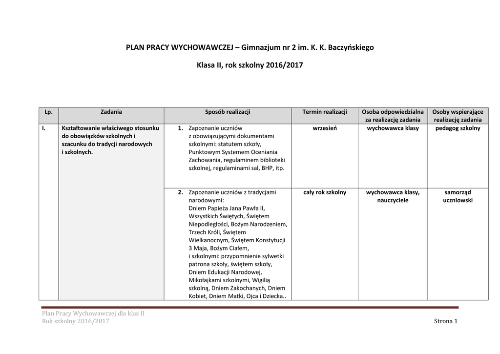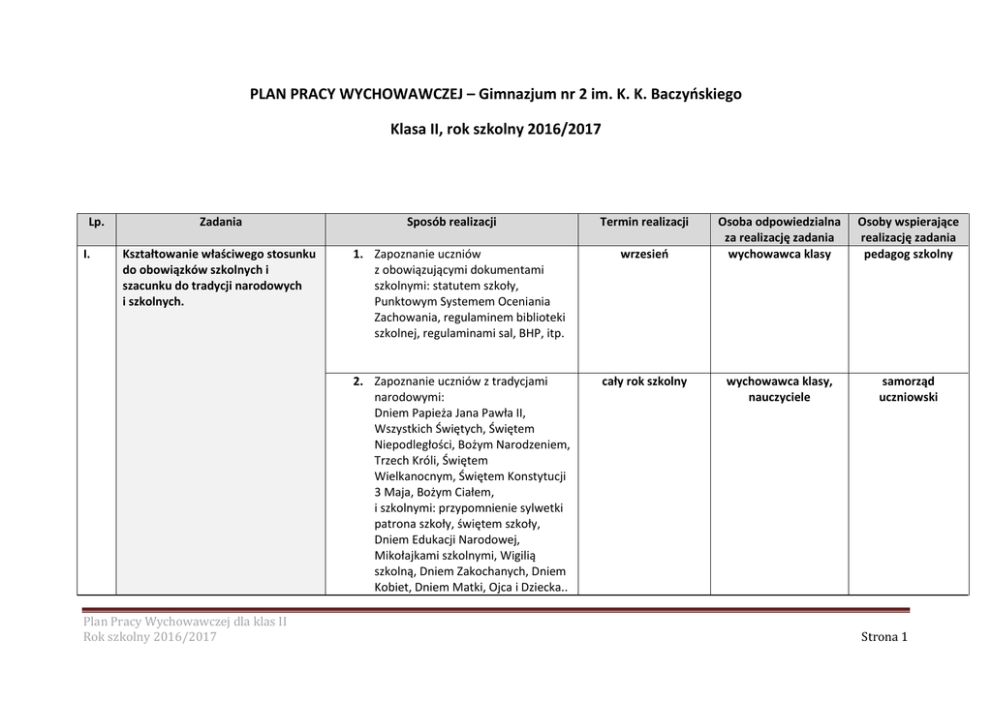 PLAN PRACY WYCHOWAWCZEJ – Gimnazjum nr 2 im. K. K.