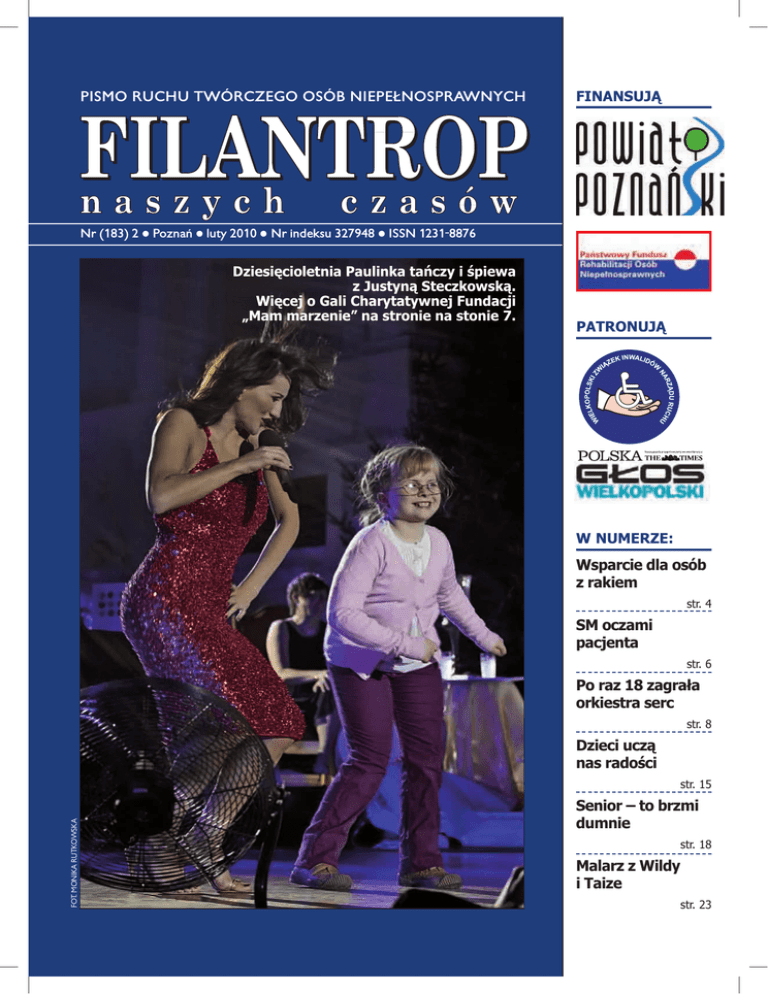 PISMO RUCHU TWÓRCZEGO OSÓB NIEPEŁNOSPRAWNYCH FINANSUJĄ Nr (183) 2 Poznań luty 2010 Nr indeksu 327948 ISSN 1231-8876 Dziesięcioletnia Paulinka tańczy i śpiewa z Justyną Steczkowską. Więcej o Gali Charytatywnej Fundacji „Mam marzenie” na stronie na stonie 7. PATRONUJĄ W NUMERZE: Wsparcie dla osób z rakiem str. 4 SM oczami pacjenta str. 6 Po raz 18 zagrała orkiestra serc str. 8 Dzieci uczą nas radości FOT. MONIKA RUTKOWSKA str. 15 Senior – to brzmi dumnie str. 18 Malarz z Wildy i Taize str. 23 2 STRONA LUTY 2010 KSIĄŻKA DLA DZIECI I MŁODZIEŻY W „Dąbrówce” IX Poznańskie Spotkania Targowe 19-21 LUTY MTP PAWILON 5 Książka dla dziecka, ta najpiękniejsza, barwna jak motyl, powstaje z miłości do dziecka i z tęsknoty... za własnym dzieciństwem. Raduje oczy i budzi ciepło również w dorosłym sercu. Dlatego tak chętnie ją kupujemy, oglądamy i czytamy naszym milusińskim. Jaką radość sprawia nam widok zasłuchanej małej buzi i dziecięca prośba – ...jeszcze, jeszcze nie przerywaj, poczytaj jeszcze! W dniach od 19 do 21 lutego zapraszamy do pawilonu 5 MTP (wejście od ul. Bukowskiej). W tym największym pawilonie będą się odbywały po raz dziewiąty targi KSIĄŻKA DLA DZIECI oraz Targi Edukacyjne i Salon Wyposażenia Szkolnego (w piątek i sobotę w godzinach od 10 do 18 oraz w niedzielę w godzinach od 10 do 14). Dzieci, młodzież, rodziców i opiekunów oraz wszystkich miłośników pięknych książek i dobrej literatury, również edukacyjnej, zachęcamy do odwiedzenia ekspozycji. Najlepsze polskie wydawnictwa pokażą swoje nowości, a wśród nich nowy przekład Księgi dżungli z cudownymi ilustracjami Józefa Wilkonia. Będzie się można osobiście spotkać z ulubionymi twórcami. Zobaczyć nie tylko wyjątkowo w tym roku bogate wystawy poświęcone ilustracji i sztuce książki, ale również niezwykłe Wilkoniowe rzeźby. Porozmawiać ze specjalistami, znawcami psychologii i rozwoju wieku dziecięcego. Dla młodych miłośników książek przewidziane są warsztaty, gry, zabawy, konkursy z nagrodami, a także pokazy filmów animowanych. Wstęp wolny. W „wigilię” targów zapraszamy do Pałacu Działyńskich na Czwartek Literacki poświęcony Maciejowi Wojtyszce – twórcy Bromby, Glusia, Fikandra i całego tego znakomitego towarzystwa. Gościem Honorowym targów książki jest Litwa. Na Targach znajdą się też książki Fundacji Pomocy Osobom Niepełnosprawnym „Filantrop”, dla swoich humanitarnych i terapeutycznych wartości szczególnie przez profesor Irenę Obuchowską zalecane bibliotekom szkolnym – jako lektura dla młodzieży. Serdecznie zapraszam w imieniu organizatorów: Polskiego Towarzystwa Wydawców Książek, Międzynarodowych Targów Poznańskich i Centrum Kultury „Zamek” OLCHA SIKORSKA KOMISARZ TARGÓW Działo się u nas wiele… W 2009 roku działo się u nas wiele w Stowarzyszeniu Przyjaciół Dzieci Specjalnej Troski w Swarzędzu. Rozpoczęliśmy terapię naszych najmłodszych podopiecznych, a to dzięki Państwa wpłatom 1% podatku dochodowego, zaangażowaniu rodziców i pomocy władz. Obecnie najmłodsze dzieci mogą korzystać z kolorowego i specjalistycznego sprzętu rehabilitacyjnego i specjalnie dla nich organizowanych przez naszych terapeutów ćwiczeń. Korzystają również z hipoterapii, jeżdżąc w namiocie zakupionym z wymienionych wpłat. Kontynuowaliśmy wszystkie dotychczasowe działania: rehabilitację ruchową, hipoterapię, dogoterapię, ćwiczenia z logopedą i psychologiem, zajęcia na basenie i hydromasaż. Pielgrzymowaliśmy do Lednicy i Gostynia. Zwiedzaliśmy Warszawę i Niepokalanów. Wybraliśmy się na dłuższą wycieczkę, w czasie której moczyliśmy nogi na plażach w Sianożętach, Kołobrzegu i Międzyzdrojach. Nasza koleżanka Agata miała okazję z bliska przyjrzeć się pracy posłów i z nimi porozmawiać. Bawiliśmy się też w Skrzetuszewie. Pojechaliśmy tam zrywać śliwki i smażyć powidła na zaproszenie klubu Patria. Na miejscu było wiele innych atrakcji i naszych starych znajomych. Mieliśmy okazję pochwalić się naszymi umiejętnościami artystycznymi na imprezach organizowanych w naszej okolicy. Braliśmy udział w kiermaszach prac plastycznych, czarowaliśmy publiczność w bibliotece, zachwycaliśmy się występami przedszkolaków i oni naszymi chyba też. Były półkolonie rehabilitacyjne z hipoterapią w Gruszczynie, Zielony Warsztat, Bal z Mikołajami, spotkania świąteczne. Na te spotkania zapraszaliśmy naszych przyjaciół i wszystkich znajomych z innych Stowarzyszeń. Oprócz przeżyć artystycznych zadbaliśmy o kondycję fizyczną. Szczególnie mokrzy byliśmy na Powiatowej Olimpiadzie Sportowej w Gruszczynie. Na szczęście w tym roku nie od deszczu. Nie może zabraknąć wspomnień o Anielskim Śpiewograniu. W tym roku chyba szczególnie szeroko otwarły się okna w niebie i wszystkie Anioły słuchały piosenek do nich słanych przez nas i naszych gości. Pod koniec roku dołączyły do nas szczególnie piękne anioły. Panie z Lions Club`u Patria w Poznaniu zorganizowały koncert charytatywny, na którym wystąpiła Ewa Bem. Pomagała nam bardzo Halinka Benedyk. Dzięki niej i jej koleżankom nasi podopieczni pojadą na turnusy rehabilitacyjne. Grono naszych przyjaciół poszerzyło się o firmę BASF ze Śremu i BLUM ze Swarzędza. Dziękujemy władzom gminy, powiatu i województwa, Spółdzielni Mieszkaniowej, naszym kochanym darczyńcom i wszystkim, którzy wsparli nas wpłacając 1% podatku. Do dnia dzisiejszego wpłynęła kwota 136 tysięcy złotych. na S pektakl teatralny, słodki poczęstunek i wizyta Świętego Mikołaja. To główne atrakcje, jakie czekały na dzieciaki podczas tradycyjnej imprezy świątecznej zorganizowanej przez piątkowską filię Miejskiego Ośrodka Pomocy Rodzinie w Poznaniu. Ubiegłooroczne spotkanie było w pewnym sensie wyjątkowe. Po raz pierwszy odbyło się bowiem w dawnej sali kinowej, dawnego