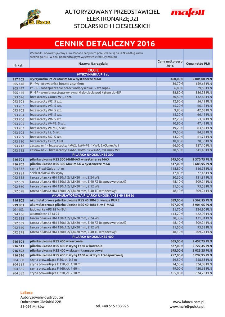 AUTORYZOWANY PRZEDSTAWICIEL ELEKTRONARZĘDZI STOLARSKICH I CIESIELSKICH CENNIK DETALICZNY 2016 W cenniku obowiązują ceny euro. Podane ceny euro przeliczane są na PLN według kursu średniego NBP w dniu poprzedzającym wystawienie faktury zakupu. Nazwa Narzędzia Nr kat. Ceny netto euro 2016 Cena netto PLN CIĘCIE 917 103 205 448 205 447 205 446 093 676 093 701 093 702 093 703 093 704 093 706 093 705 093 707 093 708 093 709 093 710 093 712 093 713 916 701 916 702 204 372 093 281 092 558 092 559 092 560 092 578 916 802 919 801 094453 094 436 092 558 092 559 092 560 092 578 916 501 916 511 916 502 916 516 204 380 204 381 204 365 204 382 WYRZYNARKA P 1 cc wyrzynarka P1 cc MaxiMAX w systenerze MAX P1-PA - prowadnica boczna z cyrklem P1-SS - zabezpieczenie przeciwodpryskowe, 5 szt./opak. P1-SP - wymienna stopa wyrzynarki do cięcia pod kątem do 45º brzeszczoty CUnex W1, 2 szt. brzeszczoty W2, 5 szt. brzeszczoty W3, 5 szt. brzeszczoty W4, 5 szt. brzeszczoty W5, 5 szt. brzeszczoty W6, 5 szt. brzeszczoty W+P2, 5 szt. brzeszczoty W+M2, 5 szt. brzeszczoty L2, 5 szt. brzeszczoty M2, 5 szt. brzeszczoty E+F2, 1 szt. zestaw nr 1 - brzeszczoty: 4xW2, 1xW+P2, 1xW4, 2xCUnex W1 zestaw nr 2 - brzeszczoty: 4xM2, 1xW6, 1xW+M2, 2xCUnex W1 PILARKA UKOŚNA KSS 300 pilarka ukośna KSS 300 MidiMAX w systenerze MAX pilarka ukośna KSS 300 MaxiMAX w systenerze MAX szyna Flexi-Guide 1,4 m ścisk stolarski do szyny tarcza pilarska HM 120x1,2/1,8x20 mm, Z 24 WZ tarcza pilarska HM 120x1,2/1,8x20 mm, Z 40 FZ (trapezowo-płaski) tarcza pilarska HM 120x1,2/1,8x20 mm, Z 12 WZ tarcza pilarska HM 120x1,2/1,8x20 mm, Z 40 TR (trapezowy) AKUMULATOROWA PILARKA UKOŚNA KSS 40 18M bl akumulatorowa pilarka ukośna KSS 40 18M bl wersja PURE akumulatorowa pilarka ukośna KSS 40 18M bl w T-MAX ładowarka APS 18 M (EU) akumulator 18 M 94 tarcza pilarska HM 120x1,2/1,8x20 mm, Z 24 WZ tarcza pilarska HM 120x1,2/1,8x20 mm, Z 40 FZ (trapezowo-płaski) tarcza pilarska HM 120x1,2/1,8x20 mm, Z 12 WZ tarcza pilarska HM 120x1,2/1,8x20 mm, Z 40 TR (trapezowy) PILARKA UKOŚNA KSS 400 pilarka ukośna KSS 400 w kartonie pilarka ukośna KSS 400 z szyną F160 w kartonie pilarka ukośna KSS 400 w skrzyni transportowej pilarka ukośna KSS 400 z szyną F160 w skrzyni transportowej szyna prowadząca F 80, dł. 0,8 m szyna prowadząca F 110, dł. 1,10 m szyna prowadząca F 160, dł. 1,60 m szyna prowadząca F 210, dł. 2,10 m LaBoca Autoryzowany dystrybutor Dobroszów Oleśnicki 22B 55-095 Mirków tel. +48 515 133 925 460,00 € 36,70 € 6,80 € 88,80 € 30,50 € 12,90 € 15,20 € 9,80 € 15,20 € 12,20 € 10,90 € 19,20 € 19,50 € 14,20 € 18,00 € 66,00 € 78,50 € 2 001,00 PLN 159,65 PLN 29,58 PLN 386,28 PLN 132,68 PLN 56,12 PLN 66,12 PLN 42,63 PLN 66,12 PLN 53,07 PLN 47,42 PLN 83,52 PLN 84,83 PLN 61,77 PLN 78,30 PLN 287,10 PLN 341,48 PLN 545,00 € 617,00 € 118,80 € 17,80 € 30,30 € 48,10 € 21,50 € 48,10 € 2 370,75 PLN 2 683,95 PLN 516,78 PLN 77,43 PLN 131,81 PLN 209,24 PLN 93,53 PLN 209,24 PLN 589,00 € 897,00 € 51,70 € 143,20 € 30,30 € 48,10 € 21,50 € 48,10 € 2 562,15 PLN 3 901,95 PLN 224,90 PLN 622,92 PLN 131,81 PLN 209,24 PLN 93,53 PLN 209,24 PLN 565,00 € 627,00 € 695,00 € 757,00 € 59,50 € 74,50 € 99,00 € 155,00 € 2 457,75 PLN 2 727,45 PLN 3 023,25 PLN 3 292,95 PLN 258,83 PLN 324,08 PLN 430,65 PLN 674,25 PLN www.laboca.com.pl www.mafell-polska.pl AUTORYZOWANY PRZEDSTAWICIEL ELEKTRONARZĘDZI STOLARSKICH I CIESIELSKICH 204 383 204 363 205 357 204 770 205 276 204 626 204 805 204 749 205 400 204 376 204 375 205 399 204 378 203 214 201 451 204 240 092 552 092 533 092 539 918 401 094412 204 380 204 381 204 365 204 382 204 383 204 363 205 357 204 770 205 276 204 626 204 805 204 749 205 400 204 376 204 375 205 399 204 378 203 214 201 451 204 240 092 552 092 533 092 539 092 565 919 101 919 102 919 501 204 380 204 381 204 365 204 382 szyna prowadząca F 310, dł. 3,10 m łącznik szyn F-VS szyna do cięcią pod kątem F-WA szyna Aerofix F-AF 1 komplet z 2 adapterami (dolny i górny) elastyczny wąż FXS L, aż do 3,2 m dł. torba na szyny F 160 dla szyn do 1,6 m zestaw szyn z torbą: 2xF160 + F-VS + 2xF-SZ 100MM + 1 torba zestaw szyn z torbą: F80 + F160 + F-WA + F-VS + 2xF-SZ 100MM + 1 torba nakładka zabezpieczająca do szyny F-EK, 2 szt. guma antypoślizgowa F-HP 6,8 M – dł. 6.8 m zabezpieczenie przeciwodpryskowe F-SS 3,4 M – dł. 3.4 m ścisk stolarski do szyny F-SZ 100MM (2 szt.) prowadnica / szyna prowadząca 770 prowadnica równoległa rączka w kształcie grzybka ze śrubą mocujcą skrzynia transportowa tarcza pilarska HM 160x1,2/1,8x20 mm, Z 32 WZ tarcza pilarska HM 160x1,2/1,8x20 mm, Z 24 WZ tarcza pilarska HM 160x1,2/1,8x20 mm, Z 16 WZ AKUMULATOROWA PILARKA UKOŚNA KSS 400 / 36V akumulatorowa pilarka ukośna KSS 400 / 36V w skrzyni akumulator akku 36V, 144 Wh Li-Ion szyna prowadząca F 80, dł. 0,8 m szyna prowadząca F 110, dł. 1,10 m szyna prowadząca F 160, dł. 1,60 m szyna prowadząca F 210, dł. 2,10 m szyna prowadząca F 310, dł. 3,10 m łącznik szyn F-VS szyna do cięcią pod kątem F-WA Szyna Aerofix F-AF 1 komplet Elastyczny wąż FXS L, aż do 3,2 m długi torba na szyny F 160 dla szyn do 1,6 m zestaw szyn z torbą: 2xF160 + F-VS + 2xF-SZ 100MM + 1 torba zestaw szyn z torbą: F80 + F160 + F-WA + F-VS + 2xF-SZ 100MM + 1 torba nakładka zabezpieczająca do szyny F-EK, 2 szt. guma antypoślizgowa F-HP 6,8 M – dł. 6.8 m zabezpieczenie przeciwodpryskowe F-SS 3,4 M – dł. 3.4 m ścisk stolarski do szyny F-SZ 100MM (2 szt.) prowadnica / szyna prowadząca 770 prowadnica równoległa rączka w kształcie grzybka ze śrubą mocujcą skrzynia transportowa tarcza pilarska HM 160x1,2/1,8x20 mm, Z 32 WZ tarcza pilarska HM 160x1,2/1,8x20 mm, Z 24 WZ tarcza pilarska HM 160x1,2/1,8x20 mm, Z 16 WZ tarcza pilarska HM 160x1,1/1,6x20 mm, Z 16 FZ/FA, wersja idealna do aku PILARKA UKOŚNA KSS 60 pilarka ukośna KSS 60 cc pilarka ukośna KSS 60 cc z walizką akumulatorowa pilarka u