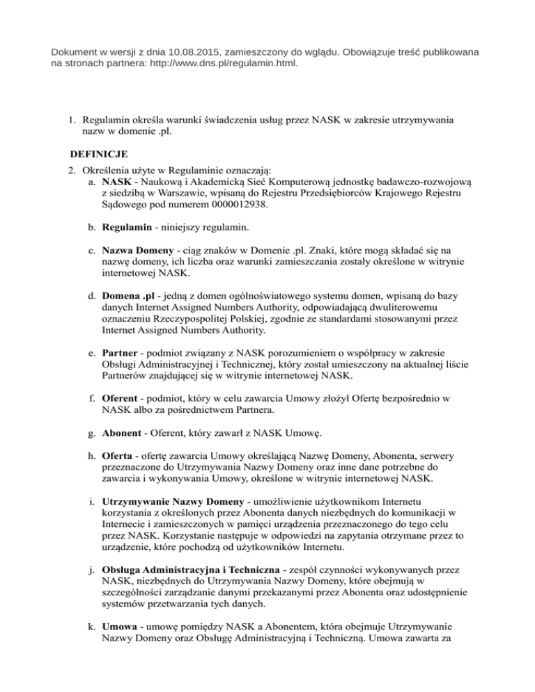 Dokument w wersji z dnia 10.08.2015, zamieszczony do wglądu. Obowiązuje treść publikowana na stronach partnera: http://www.dns.pl/regulamin.html. 1. Regulamin określa warunki świadczenia usług przez NASK w zakresie utrzymywania nazw w domenie .pl. DEFINICJE 2. Określenia użyte w Regulaminie oznaczają: a. NASK - Naukową i Akademicką Sieć Komputerową jednostkę badawczo-rozwojową z siedzibą w Warszawie, wpisaną do Rejestru Przedsiębiorców Krajowego Rejestru Sądowego pod numerem 0000012938. b. Regulamin - niniejszy regulamin. c. Nazwa Domeny - ciąg znaków w Domenie .pl. Znaki, które mogą składać się na nazwę domeny, ich liczba oraz warunki zamieszczania zostały określone w witrynie internetowej NASK. d. Domena .pl - jedną z domen ogólnoświatowego systemu domen, wpisaną do bazy danych Internet Assigned Numbers Authority, odpowiadającą dwuliterowemu oznaczeniu Rzeczypospolitej Polskiej, zgodnie ze standardami stosowanymi przez Internet Assigned Numbers Authority. e. Partner - podmiot związany z NASK porozumieniem o współpracy w zakresie Obsługi Administracyjnej i Technicznej, który został umieszczony na aktualnej liście Partnerów znajdującej się w witrynie internetowej NASK. f. Oferent - podmiot, który w celu zawarcia Umowy złożył Ofertę bezpośrednio w NASK albo za pośrednictwem Partnera. g. Abonent - Oferent, który zawarł z NASK Umowę. h. Oferta - ofertę zawarcia Umowy określającą Nazwę Domeny, Abonenta, serwery przeznaczone do Utrzymywania Nazwy Domeny oraz inne dane potrzebne do zawarcia i wykonywania Umowy, określone w witrynie internetowej NASK. i. Utrzymywanie Nazwy Domeny - umożliwienie użytkownikom Internetu korzystania z określonych przez Abonenta danych niezbędnych do komunikacji w Internecie i zamieszczonych w pamięci urządzenia przeznaczonego do tego celu przez NASK. Korzystanie następuje w odpowiedzi na zapytania otrzymane przez to urządzenie, które pochodzą od użytkowników Internetu. j. Obsługa Administracyjna i Techniczna - zespół czynności wykonywanych przez NASK, niezbędnych do Utrzymywania Nazwy Domeny, które obejmują w szczególności zarządzanie danymi przekazanymi przez Abonenta oraz udostępnienie systemów przetwarzania tych danych. k. Umowa - umowę pomiędzy NASK a Abonentem, która obejmuje Utrzymywanie Nazwy Domeny oraz Obsługę Administracyjną i Techniczną. Umowa zawarta za pośrednictwem Partnera obejmuje tylko Utrzymywanie Nazwy Domeny, natomiast świadczenia NASK dotyczące Obsługi Administracyjnej i Technicznej reguluje odrębne porozumienie, zawarte pomiędzy NASK a Partnerem. l. Cennik - zestawienie opłat za świadczenia NASK oraz określenie sposobu ich naliczania, opublikowane w witrynie internetowej NASK. m. Zmiana Abonenta - przeniesienie całości przysługujących Abonentowi praw i obciążajacych Abonenta obowiązków na podstawie Umowy, na osobę trzecią. n. Spór - podjęcie przez osobę trzecią przed Sądem Polubownym lub innym sądem, przewidzianych prawem działań zmierzających do ochrony jej praw, które mogły zostać naruszone przez Abonenta w wyniku zawarcia lub wykonywania Umowy. o. Zmiana Delegacji - zmianę danych o serwerach przeznaczonych do Utrzymywania Nazwy Domeny. p. Sąd Polubowny - jeden ze stałych sądów polubownych działających przy instytucjach, które łączą z NASK porozumienia o współpracy w zakresie rozstrzygania Sporów, wskazane w witrynie internetowej NASK. ZAWARCIE UMOWY 3. Umowa pomiędzy NASK a Abonentem zostaje zawarta w chwili przyjęcia przez NASK Oferty, nie później jednak niż w chwili rozpoczęcia Utrzymywania Nazwy Domeny. Ofertę składaną bezpośrednio w NASK, Abonent przekazuje przez witrynę internetową NASK i dodatkowo w formie pisemnej. Oferta składana za pośrednictwem Partnera, niezależnie od formy, w jakiej została złożona Partnerowi, zostaje przesłana przez Partnera do NASK w formie ustalonej pomiędzy NASK a Partnerem w odrębnym porozumieniu. 4. Przez złożenie Oferty Oferent zapewnia, że dane w niej zawarte są prawidłowe, a złożenie Oferty i wykonywanie Umowy nie powoduje naruszenia praw osób trzecich lub przepisów prawa. NASK może zażądać dodatkowych dokumentów, dotyczących danych wskazanych w treści Oferty. 5. NASK nie dokonuje badania czy zawierając lub wykonując Umowę Abonent narusza prawa osób trzecich lub jakiekolwiek przepisy prawa. Zawarcie Umowy nie oznacza przyznania Abonentowi jakichkolwiek praw związanych z Nazwą Domeny, poza wynikającymi wyraźnie z Umowy, ani uznania, że Oferta lub wykonywanie przez Abonenta Umowy nie narusza praw osób trzecich. 6. NASK może odmówić przyjęcia Oferty w szczególności, gdy: a. Oferent nie spełnił warunków technicznych określonych w witrynie internetowej NASK, b. NASK jest związana umową o Utrzymywanie tej samej Nazwy Domeny, która została wskazana w Ofercie, albo trwa proces zawierania takiej umowy, chyba że Oferta stanowiła opcję w rozumieniu odrębnego regulaminu, opublikowanego w witrynie internetowej NASK, c. Oferta dotyczy Nazwy Domeny odpowiadającej nazwie województwa, powiatu, gminy lub miejscowości w Domenie .pl, chyba że Oferentem jest właściwa jednostka samorządu terytorialnego albo Skarb Państwa reprezentowany przez właściwy organ administracji, d. w przypadku Oferty składanej bezpośrednio w NASK, treść Oferty pisemnej różni się w stosunku do jej wersji złożonej przez witrynę internetową NASK, e. w przypadku Oferty składanej bezpośrednio w NASK, nie doręczono wersji pisemnej Oferty, w terminie siedmiu dni od złożenia Oferty przez witrynę internetową NASK, f. w przypadku Oferty składanej bezpośrednio w NASK, Oferent trzykrotnie złożył przez witrynę internetową NASK Ofertę dotyczącą tej samej Nazwy Domeny, bez doręczenia jej wersji pisemnej, g. nie usunięto błędów Oferty w terminie wyznaczonym przez NASK, h. nie doręczono dodatkowych dokumentów, dotyczącyc
