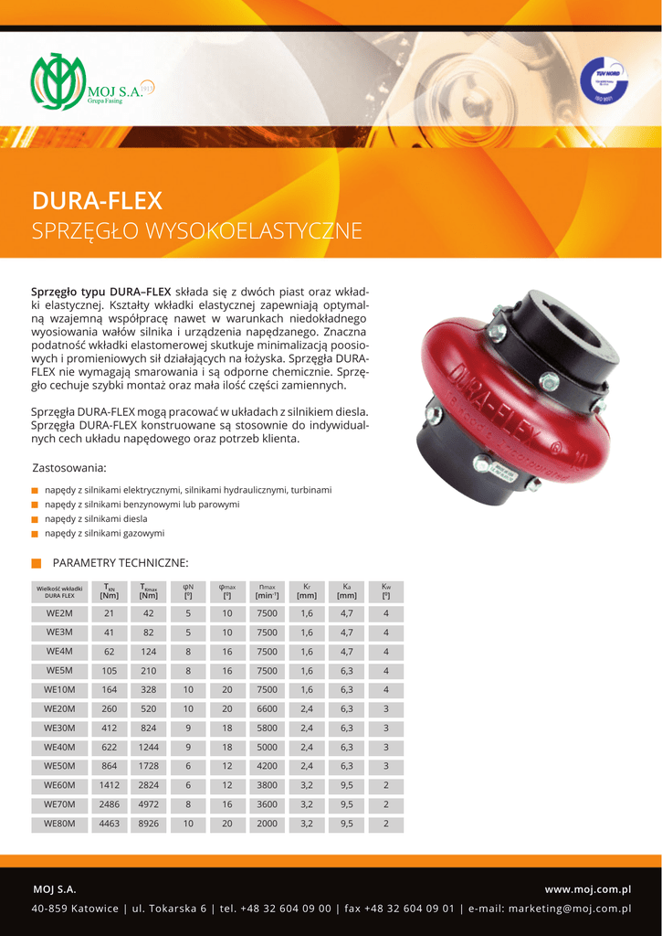 DURA-FLEX SPRZĘGŁO WYSOKOELASTYCZNE Sprzęgło typu DURA–FLEX składa się z dwóch piast oraz wkładki elastycznej. Kształty wkładki elastycznej zapewniają optymalną wzajemną współpracę nawet w warunkach niedokładnego wyosiowania wałów silnika i urządzenia napędzanego. Znaczna podatność wkładki elastomerowej skutkuje minimalizacją poosiowych i promieniowych sił działających na łożyska. Sprzęgła DURAFLEX nie wymagają smarowania i są odporne chemicznie. Sprzęgło cechuje szybki montaż oraz mała ilość części zamiennych. Sprzęgła DURA-FLEX mogą pracować w układach z silnikiem diesla. Sprzęgła DURA-FLEX konstruowane są stosownie do indywidualnych cech układu napędowego oraz potrzeb klienta. Zastosowania: napędy z silnikami elektrycznymi, silnikami hydraulicznymi, turbinami napędy z silnikami benzynowymi lub parowymi napędy z silnikami diesla napędy z silnikami gazowymi PARAMETRY TECHNICZNE: Wielkość wkładki DURA FLEX TKN [Nm] TKmax [Nm] φN [0] φmax [0] nmax [min-1] Kr [mm] Ka [mm] Kw [0] WE2M 21 42 5 10 7500 1,6 4,7 4 WE3M 41 82 5 10 7500 1,6 4,7 4 WE4M 62 124 8 16 7500 1,6 4,7 4 WE5M 105 210 8 16 7500 1,6 6,3 4 WE10M 164 328 10 20 7500 1,6 6,3 4 WE20M 260 520 10 20 6600 2,4 6,3 3 WE30M 412 824 9 18 5800 2,4 6,3 3 WE40M 622 1244 9 18 5000 2,4 6,3 3 WE50M 864 1728 6 12 4200 2,4 6,3 3 WE60M 1412 2824 6 12 3800 3,2 9,5 2 WE70M 2486 4972 8 16 3600 3,2 9,5 2 WE80M 4463 8926 10 20 2000 3,2 9,5 2 MOJ S.A. www.moj.com.pl 40-859 Katowice | ul. Tokarska 6 | tel. +48 32 604 09 00 | fax +48 32 604 09 01 | e-mail: [email protected] DUAL SPRZĘGŁO WYSOKOELASTYCZNE Sprzęgło typu DUAL składa się z dwóch piast oraz wkładki elastycznej. Kształty wkładki elastycznej zapewniają optymalną wzajemną współpracę nawet w warunkach niedokładnego wyosiowania wałów silnika i urządzenia napędzanego. Znaczna podatność wkładki elastomerowej skutkuje minimalizacją poosiowych i promieniowych sił działających na łożyska, kompensuje drgania układu napędowego. Sprzęgła DUAL mogą być stosowane w podziemnych zakładach górniczych, w przestrzeniach zagrożonych wybuchem metanu i pyłu węglowego. Sprzęgła DUAL konstruowane są stosownie do indywidualnych cech układu napędowego oraz potrzeb klienta. PARAMETRY TECHNICZNE: Wielkość wkładki DUAL TKN [Nm] TKmax [Nm] φN [0] φmax [0] nmax [min-1] Kr [mm] Ka [mm] Kw [0] 002 21 42 5 10 7500 1,6 4,7 4 003 41 82 5 10 7500 1,6 4,7 4 004 62 124 8 16 7500 1,6 4,7 4 005 105 210 8 16 7500 1,6 6,3 4 010 164 328 10 20 7500 1,6 6,3 4 020 260 520 10 20 6600 2,4 6,3 3 030 412 824 9 18 5800 2,4 6,3 3 040 622 1244 9 18 5000 2,4 6,3 3 050 864 1728 6 12 4200 2,4 6,3 3 060 1412 2824 6 12 3800 3,2 9,5 2 070 2486 4972 8 16 3600 3,2 9,5 2 080 4463 8926 10 20 2000 3,2 9,5 2 100 9605 19210 11 22 1900 4,8 15 1,5 120 19210 38400 10 20 1800 4,8 15 1,5 140 38400 76840 10 20 1500 4,8 15 1,5 I M2 MOJ S.A. www.moj.com.pl 40-859 Katowice | ul. Tokarska 6 | tel. +48 32 604 09 00 | fax +48 32 604 09 01 | e-mail: [email protected] SET SPRZĘGŁA WYSOKOELASTYCZNE Sprzęgła wysokoelastyczne typu SET charakteryzują się możliwością dużej kompensacji gwałtownych, krótkotrwałych wzrostów obciążenia ponad nominalną wartość przenoszonego momentu obrotowego, a jednocześnie zabezpieczają cały zespół napędowy. W razie stałego zablokowania maszyny napędzanej przy pracującym silniku nastąpi zerwanie segmentu elastycznego, który pełni rolę bezpiecznika. Zwiększoną elastyczność sprzęgieł typu SET uzyskano poprzez zastosowanie dwóch elementów elastycznych: wkładki i segmentu. Piasta nakładana na wał przekładni jest połączona za pomocą śrub z „segmentem elastycznym” oraz tarczą kłową, która poprzez „wkładkę elastyczną” przenosi moment obrotowy na piastę osadzoną na wale silnika. Wkładka elastyczna jest swobodną w układzie, w związku z czym sprzęgło jest w tym miejscu rozłączne, co ma kapitalne znaczenie podczas zabudowy w napędzie, nie wymaga rozkręcenia połączeń śrubowych wykonanych podczas montażu w fabryce. WARUNKI PRACY WKŁADKI ELASTYCZNEJ: Praca w środowisku o pH 5÷12 w zakresie temperatur od - 40°C do +100°C. Odporność na chemikalia, w tym na: popularne rozpuszczalniki, benzyny, oleje i smary, kwas siarkowy i solny, ług sodowy, słoną wodę. Zastosowania: Podstawowym zastosowaniem sprzęgieł wysokoelastycznych typu SET jest połączenie silnika elektrycznego z wałem przekładni w napędach przenośników taśmowych i zgrzebłowych, sprężarek, pomp, wentylatorów i w innych maszynach i urządzeniach. Strona napędzająca (silnika) Strona napędzana (przekładni) Segment elastyczny Wkładka elastyczna ATEX I M2 MOJ S.A. www.moj.com.pl 40-859 Katowice | ul. Tokarska 6 | tel. +48 32 604 09 00 | fax +48 32 604 09 01 | e-mail: [email protected] PARAMETRY FIZYCZNE SPRZĘGIEŁ PHYSICAL PARAMETERS OF COUPLINGS SET TYP SPRZĘGŁA / TYPE OF COUPLING DANE TECHNICZNE SPRZĘGŁA WYSOKOELASTYCZNE TECHNICAL DATA SET 100 SET 132 SET 200 SET 315 SET 500 SET 750 Moc przenoszona przy prędkości 1500 [ kW/obr/min ] / Power transmitted with speed 1500 [ kW/rpm ] 55 - 100 132 200 315 500 750 Moment obrotowy znamionowy Nominal rotational torque [ Nm ] 1 080 1 080 2 300 4 600 6 400 8 500 6 900 13 800 19 200 25 500 PARAMETRY TECHNICZNE: Moment obrotowy dynamiczny Dynamic rotational torque 3 240 [ Nm ] Sprzęgło typu SET (wielkość mechaniczna) Odkształcenie kątowe sprzęgła Moc przenoszona (1500 Moment znamionowy Moment dynamiczny Jednostki przy momencie nominalnym Angle distortion of the coupling with a nominal torque obr./min.) TKN [ o ] ok. 8,0 kW Odkształcenie kątowe sprzęgła przy momencie maksymalnym Angle distortion of the coupling with a maximal torque TK max [ o ] Nm ok. 18,5 Nm Odchyłka montażowa poosiowa ( dla miejsca zabudowy ) Post-axial mounting misalignment Odkształcenie kątowe sprzęgła przy momencie ) ( for the housing location nominalnym d