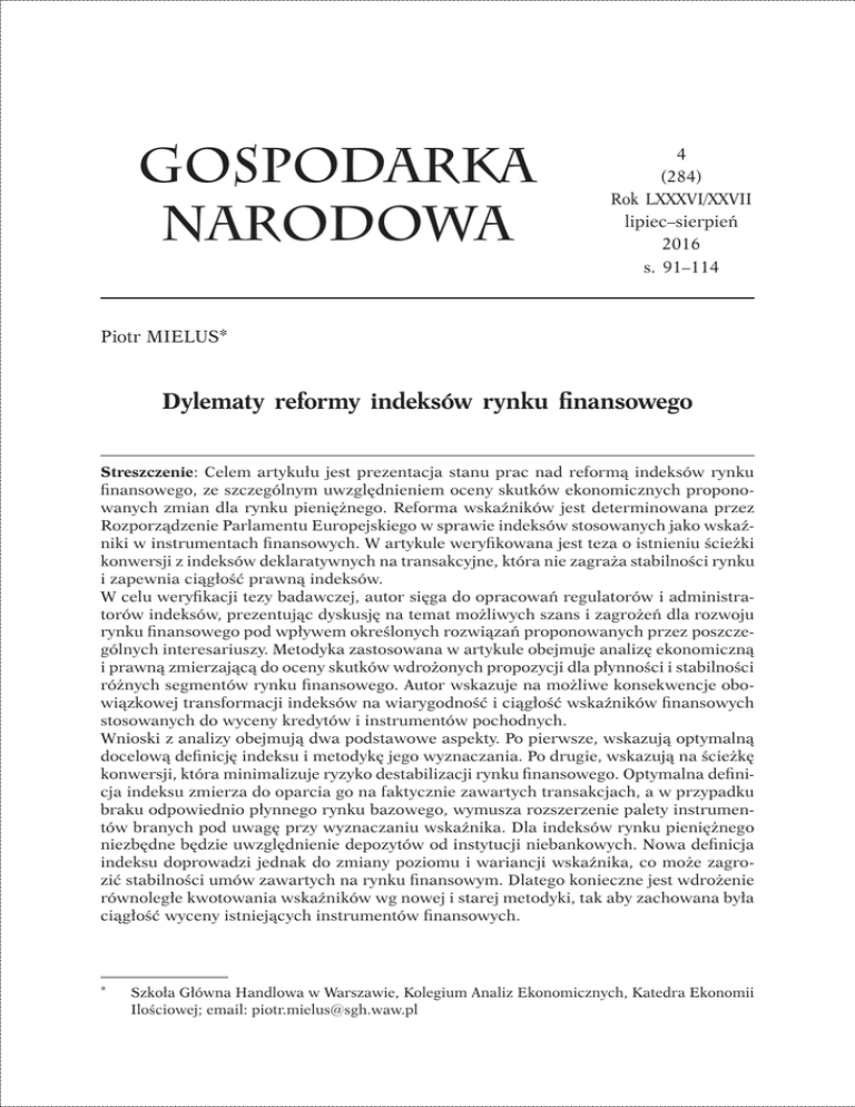 91 Piotr Mielus, Dylematy reformy indeksów rynku finansowego Gospodarka narodowa 4 (284) Rok LXXXVI/XXVII lipiec–sierpień 2016 s. 91–114 Piotr MIELUS* Dylematy reformy indeksów rynku finansowego Streszczenie: Celem artykułu jest prezentacja stanu prac nad reformą indeksów rynku finansowego, ze szczególnym uwzględnieniem oceny skutków ekonomicznych proponowanych zmian dla rynku pieniężnego. Reforma wskaźników jest determinowana przez Rozporządzenie Parlamentu Europejskiego w sprawie indeksów stosowanych jako wskaźniki w instrumentach finansowych. W artykule weryfikowana jest teza o istnieniu ścieżki konwersji z indeksów deklaratywnych na transakcyjne, która nie zagraża stabilności rynku i zapewnia ciągłość prawną indeksów. W celu weryfikacji tezy badawczej, autor sięga do opracowań regulatorów i administratorów indeksów, prezentując dyskusję na temat możliwych szans i zagrożeń dla rozwoju rynku finansowego pod wpływem określonych rozwiązań proponowanych przez poszczególnych interesariuszy. Metodyka zastosowana w artykule obejmuje analizę ekonomiczną i prawną zmierzającą do oceny skutków wdrożonych propozycji dla płynności i stabilności różnych segmentów rynku finansowego. Autor wskazuje na możliwe konsekwencje obowiązkowej transformacji indeksów na wiarygodność i ciągłość wskaźników finansowych stosowanych do wyceny kredytów i instrumentów pochodnych. Wnioski z analizy obejmują dwa podstawowe aspekty. Po pierwsze, wskazują optymalną docelową definicję indeksu i metodykę jego wyznaczania. Po drugie, wskazują na ścieżkę konwersji, która minimalizuje ryzyko destabilizacji rynku finansowego. Optymalna definicja indeksu zmierza do oparcia go na faktycznie zawartych transakcjach, a w przypadku braku odpowiednio płynnego rynku bazowego, wymusza rozszerzenie palety instrumentów branych pod uwagę przy wyznaczaniu wskaźnika. Dla indeksów rynku pieniężnego niezbędne będzie uwzględnienie depozytów od instytucji niebankowych. Nowa definicja indeksu doprowadzi jednak do zmiany poziomu i wariancji wskaźnika, co może zagrozić stabilności umów zawartych na rynku finansowym. Dlatego konieczne jest wdrożenie równoległe kwotowania wskaźników wg nowej i starej metodyki, tak aby zachowana była ciągłość wyceny istniejących instrumentów finansowych. * Szkoła Główna Handlowa w Warszawie, Kolegium Analiz Ekonomicznych, Katedra Ekonomii Ilościowej; email: [email protected] 92 GOSPODARKA NARODOWA nr 4/2016 Słowa kluczowe: indeksy rynku finansowego, rynek pieniężny, koszt finansowania, ryzyko bazowe Kody klasyfikacji JEL: G01, G14, G15 Artykuł nadesłany 5 lutego 2016 r., zaakceptowany 6 lipca 2016 r. Wprowadzenie Indeksem rynku finansowego nazywamy wskaźnik, który jest wyznaczany na podstawie cen obserwowanych na rynku finansowym. Wskaźnik ten ma charakter informacyjny oraz może być wykorzystywany do określania wielkości przepływów finansowych przy rozliczaniu transakcji zawartych na rynku finansowym. Znaczenie makroekonomiczne indeksów rynku finansowego polega na tym, że stanowią one punkt odniesienia dla instrumentów finansowych oferowanych na rynku. Relacja pomiędzy indeksem a instrumentami finansowymi jest trojakiego rodzaju. Po pierwsze, determinują one wysokość przepływów dla instrumentów finansowych (np. stopy typu IBOR określają wysokość odsetek w zmiennoprocentowych kredytach hipotecznych, wyznaczają wielkość kuponu w zmiennokuponowych obligacjach skarbowych, determinują przepływy w transakcjach swapowych oraz kwotę rozliczenia dla kontraktów terminowych). Po drugie, wpływają na wycenę portfeli, ponieważ są wykorzystywane jako składniki cen determinujących wartość aktywów finansowych. Po trzecie, posiadają funkcję informacyjną, stanowiąc swoisty barometr rynku zawierający syntetyczną i obiektywną informację o poziomie np. stóp procentowych w gospodarce. Indeksy można podzielić w zależności od aktywa referencyjnego, do którego się odnoszą. Wyróżniamy następujące rodzaje indeksów: • indeksy akcyjne, odnoszące się do regulowanego rynku papierów udziałowych, stanowiące podstawowy indeks wyznaczający aktualną wartość określonego rynku giełdowego; • indeksy rynku pieniężnego, bazujące na niezabezpieczonych terminowych depozytach międzybankowych; • indeksy rynku walutowego (fixingi walutowe), wyznaczające bieżącą wartość walut obcych względem waluty krajowej; • indeksy towarowe, określające referencyjną wartość określonych towarów (metali, surowców, produktów rolnych itd.). Najważniejsze dla gospodarki, ze względu na wielkość rynku referencyjnego, są indeksy rynku pieniężnego. Indeksy te pełnią ważne funkcje ekonomiczne. Po pierwsze, informują, jaki jest obiektywny poziom stóp procentowych odnoszących się do ściśle zdefiniowanego rodzaju aktywów. Po drugie, pozwalają na określenie wysokości przepływów finansowych dla instrumentów opartych Piotr Mielus, Dylematy reformy indeksów rynku finansowego 93 na indeksie (kredytów, obligacji, swapów)1. Po trzecie, na podstawie cen instrumentów pochodnych opartych na indeksie, umożliwiają określenie prognozowanego przez uczestników rynku kierunku i zakresu zmian krzywych dochodowości. Po czwarte wreszcie, dzięki ujednoliceniu stóp referencyjnych stosowanych w instrumentach pochodnych, zwiększają płynność na rynku derywatów, ułatwiając tym samym zabezpieczenie przed zmianami stóp procentowych. Ważną rolą indeksów jest możliwość konstruowania opartych na nich produktów, które minimalizują ekspozycję uczestników rynku na ryzyko rynkowe. Ryzyko rynkowe wiąże się z niekorzystną zmianą wyceny pozycji bilansowych i pozabilansowych. Zmiana wyceny może pochodzić z dwóch źródeł: albo poprzez zmianę wysokości oczekiwanych przepływów, albo poprzez zmianę wartości bieżącej netto należności i zobow