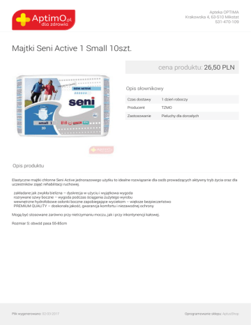 Apteka OPTIMA Krakowska 4, 63-510 Mikstat 531-470-109 Majtki Seni Active 1 Small 10szt. cena produktu: 26,50 PLN Opis słownikowy Czas dostawy 1 dzień roboczy Producent TZMO Zastosowanie Pieluchy dla dorosłych Opis produktu Elastyczne majtki chłonne Seni Active jednorazowego użytku to idealne rozwiązanie dla osób prowadzących aktywny tryb życia oraz dla uczestników zajęć rehabilitacji ruchowej. zakładane jak zwykła bielizna – dyskrecja w użyciu i wyjątkowa wygoda rozrywane szwy boczne – wygoda podczas ściągania zużytego wyrobu wewnętrzne hydrofobowe osłonki boczne zapobiegające wyciekom – większe bezpieczeństwo PREMIUM QUALITY – doskonała jakość, gwarancja komfortu i niezawodnej ochrony Mogą być stosowane zarówno przy nietrzymaniu moczu, jak i przy inkontynencji kałowej. Rozmiar S: obwód pasa 55-85cm Plik wygenerowano: 02-03-2017 Powered by TCPDF (www.tcpdf.org) Oprogramowanie sklepu: AptusShop