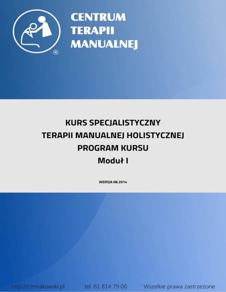 KURS SPECJALISTYCZNY TERAPII MANUALNEJ HOLISTYCZNEJ PROGRAM KURSU Moduł I WERSJA 08.2014 Spis treści Igłoterapia łącznotkankowych pól punktów spustowych............................................................................................3 Zespoły więzadeł stawu krzyżowo-biodrowego............................................................................................................4 Zespół zaburzeń czynności stawu biodrowego............................................................................................................6 Zespół zaburzeń czynności stawów stopy i deformacje stopy...................................................................................9 Objawy zaburzeń czynności stóp.................................................................................................................................10 Postępowanie w wadach stóp......................................................................................................................................11 Postępowanie w stanach dolegliwości bólowych i innych w rejonie stóp...............................................................12 Terapia edukacyjna......................................................................................................................................... 12 Autoterapia chorych z zaburzeniami czynności stawu biodrowego oraz w stanach przed i pooperacyjnych.. .13 © Centrum Terapii Manualnej. www.ctmrakowski.pl 2 Igłoterapia łącznotkankowych pól punktów spustowych wg Rakowskiego. Zespoły więzadeł stawu krzyżowo-biodrowego. Zespół zaburzeń czynności stawu biodrowego oraz kolanowego. Zespół zaburzeń czynności stawów stopy i deformacje stopy. 4 dni - 48 godzin dydaktycznych Terapii Manualnej Holistycznej, w tym: • 33 godziny terapii manualnej • 9 godzin autoterapii • 6 godzin terapii edukacyjnej Igłoterapia łącznotkankowych pól punktów spustowych 1. Historia powstania i rozwoju igłoterapii (i-ter) wg Rakowskiego. 2. Podstawowe cechy igłoterapii jako zabiegu odruchowego. 3. Obszary zastosowania igłoterapii. 4. Wskazania i przeciwwskazania do wykonywania igłoterapii. 5. Przygotowanie zabiegu igłoterapii • przygotowanie pacjenta • przygotowanie i dobór sprzętu • aseptyka i antyseptyka • zasady bezpieczeństwa. 6. Technika i zasady wykonywania igłoterapii • dobór pól punktów spustowych do wykonywania i-ter • praca igłą • rola ręki pomagającej • zasada znikania bólu • opracowanie igłą pola punktów spustowych. 7. Zalety i wady igłoterapii. 8. Praktyczne wykonywanie igłoterapii pól punktów spustowych poszczególnych struktur łącznotkankowych • igłoterapia pól punktów spustowych (pps) więzadeł stawu krzyżowobiodrowego: © Centrum Terapii Manualnej. www.ctmrakowski.pl 3 • • • i-ter pps więzadła krzyżowo-guzowego i wyrostka sierpowatego • i-ter pps więzadła krzyżowo-biodrowego • i-ter pps więzadła biodrowo-lędźwiowego igłoterapia pól punktów spustowych (pps) segmentu ruchowego kręgosłupa L i Th: • i-ter pps więzadła międzykolcowego • i-ter pps więzadła nadkolcowego • i-ter pps przyczepów torebki stawowej stawu międzywyrostko-wego • i-ter pps więzadła nadkolcowego kości krzyżowej • i-ter pps przyczepów torebki stawowej stawu żebrowo-poprzecznego igłoterapia pól punktów spustowych (pps) krętarza większego: • i-ter pps przyczepu ścięgna mięśnia gruszkowatego • i-ter pps okostnej krętarza większego • i-ter pps reprezentantów ssrk szyjnego leżących na kresie karkowej górnej • i-ter pps m. biodrowo-żebrowego • i-ter pps systemu żuchwowo-gnykowo-czaszkowego • i-ter pps stawu piszczelowo-strzałkowego bliższego • i-ter pps stawu barkowo-obojczykowego • i-ter pps innych struktur łącznotkankowych narządu ruchu jako indywidualne dostępy do aferencji. 9. Podsumowanie. Zespoły więzadeł stawu krzyżowo-biodrowego 1. Staw krzyżowo-biodrowy jako rejon kluczowy ciała 2. Zespół więzadła krzyżowo-guzowego (wkg) • patogeneza CZST więzadła krzyżowo-guzowego • objawy chorobowe czynnościowej zmiany stanu tkanek więzadła krzyżowo-guzowego • stany ostre • bóle kończyny dolnej • objawy pseudo neurologiczne kończyny dolnej © Centrum Terapii Manualnej. www.ctmrakowski.pl 4 • bóle rejonu L/S oraz L • objawy w zespołach dna miednicy (urologiczne, proktologiczne, seksualne, dermatologiczne inne) • inne • badanie czynnościowo zmienionego więzadła krzyżowo-guzowego • terapia czynnościowo zmienionego więzadła krzyżowo-guzowego • interakcje CZST wkg. 3. Zespół więzadeł krzyżowo-biodrowych (wwkb) • patogeneza CZST więzadeł krzyżowo-biodrowych • objawy czynnościowej zmiany stanu tkanek więzadeł krzyżowobiodrowych • bóle miejscowe • ZZSK • zaburzenia miesiączkowania, trudności z zachodzeniem w ciążę, samoistne poronienia, inne • zasłabnięcia, omdlenia, gwałtowne utraty przytomności • zawroty głowy • migreny • inne • badanie CZST wwkb • terapia CZST wwkb oraz ich następstw chorobowych • interakcje CZST wwkb. 4. Zespół więzadła biodrowo-lędźwiowego (wbl) • patogeneza ZCST więzadła biodrowo-lędźwiowego • objawy CZST więzadła biodrowo-lędźwiowego • bóle jądra u mężczyzny • bóle pachwiny • bóle uda w rzucie m. prostego uda czasem obejmujące kolano • bóle L/S w rzucie wbl • bóle pośladka • bóle uda w rzucie m. dwugłowego uda © Centrum Terapii Manualnej. www.ctmrakowski.pl 5 • inne • badanie CZST więzadła biodrowo-lędźwiowego • terapia czynnościowej zmiany stanu więzadła biodrowo-lędźwiowego • interakcje CZST wbl. 5. Podsumowanie. Zespół zaburzeń czynności stawu biodrowego 1. Anatomia i biomechanika, patogeneza dysfunkcji stawu biodrowego • ruchomość stawu biodrowego: • ruchomość fizjologiczna: • • zakresy ruchomości fizjologicznej • pozycja zero