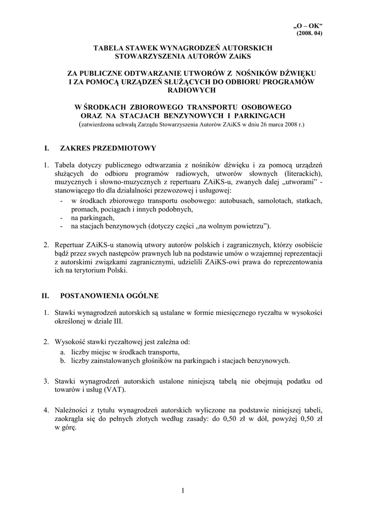 „O – OK” (2008. 04) TABELA STAWEK WYNAGRODZEŃ AUTORSKICH STOWARZYSZENIA AUTORÓW ZAiKS ZA PUBLICZNE ODTWARZANIE UTWORÓW Z NOŚNIKÓW DŹWIĘKU I ZA POMOCĄ URZĄDZEŃ SŁUśĄCYCH DO ODBIORU PROGRAMÓW RADIOWYCH W ŚRODKACH ZBIOROWEGO TRANSPORTU OSOBOWEGO ORAZ NA STACJACH BENZYNOWYCH I PARKINGACH (zatwierdzona uchwałą Zarządu Stowarzyszenia Autorów ZAiKS w dniu 26 marca 2008 r.) I. ZAKRES PRZEDMIOTOWY 1. Tabela dotyczy publicznego odtwarzania z nośników dźwięku i za pomocą urządzeń słuŜących do odbioru programów radiowych, utworów słownych (literackich), muzycznych i słowno-muzycznych z repertuaru ZAiKS-u, zwanych dalej „utworami” stanowiącego tło dla działalności przewozowej i usługowej: - w środkach zbiorowego transportu osobowego: autobusach, samolotach, statkach, promach, pociągach i innych podobnych, - na parkingach, - na stacjach benzynowych (dotyczy części „na wolnym powietrzu”). 2. Repertuar ZAiKS-u stanowią utwory autorów polskich i zagranicznych, którzy osobiście bądź przez swych następców prawnych lub na podstawie umów o wzajemnej reprezentacji z autorskimi związkami zagranicznymi, udzielili ZAiKS-owi prawa do reprezentowania ich na terytorium Polski. II. POSTANOWIENIA OGÓLNE 1. Stawki wynagrodzeń autorskich są ustalane w formie miesięcznego ryczałtu w wysokości określonej w dziale III. 2. Wysokość stawki ryczałtowej jest zaleŜna od: a. liczby miejsc w środkach transportu, b. liczby zainstalowanych głośników na parkingach i stacjach benzynowych. 3. Stawki wynagrodzeń autorskich ustalone niniejszą tabelą nie obejmują podatku od towarów i usług (VAT). 4. NaleŜności z tytułu wynagrodzeń autorskich wyliczone na podstawie niniejszej tabeli, zaokrągla się do pełnych złotych według zasady: do 0,50 zł w dół, powyŜej 0,50 zł w górę. 1 „O – OK” (2008. 04) III. STAWKI 1. Autobusy – stawka za jeden pojazd Liczba miejsc Komunikacja miejska i podmiejska Komunikacja międzymiastowa Komunikacja międzynarodowa i przejazdy autokarem turystycznym w komunikacji krajowej i międzynarodowej do 24 30,75 zł 38,95 zł 46,13 zł od 25 do 60 46,13 zł 58,43 zł 69,70 zł ponad 60 miejsc 61,50 zł 76,88 zł 92,25 zł 2. Samoloty - stawka za jeden samolot Liczba miejsc w samolocie do 100 205,00 zł kaŜde następne rozpoczęte 50 miejsc 102,50 zł 3. Statki - stawka za jeden statek lub prom pasaŜerski Liczba miejsc na statku lub promie do 200 184,50 zł kaŜde następne rozpoczęte 50 miejsc 92,25 zł 4. Pociągi - stawka za jeden skład pociągu osobowego – 102,50 zł 5. Parkingi i stacje benzynowe stawka za jeden obiekt Liczba głośników do 10 głośników 51,25 zł kaŜdy następny głośnik 2,56 zł 2 „O – OK” (2008. 04) IV. PODWYśSZENIE STAWKI PodwyŜszenie stawki do 50 % stawki podstawowej stosuje się dla parkingów i środków zbiorowego transportu osobowego o podwyŜszonym standardzie. V. UPUSTY 1. Upusty stosuje się wyłącznie na podstawie pisemnego wniosku podmiotu publicznie odtwarzającego utwory w następującej wysokości: a. dla kontrahentów, którzy wystąpili do Stowarzyszenia Autorów ZAiKS z wnioskiem o zawarcie umowy przed rozpoczęciem publicznego odtwarzania utworów, bez uprzedniego podjęcia działań przez Stowarzyszenie – upust: - do 10% na okres 1 roku, b. dla kontrahentów, którzy wpłacili wynagrodzenia autorskie z góry (bez moŜliwości zwrotu w przypadku wcześniejszego zakończenia publicznego odtwarzania utworów) – upusty: - do 15% - przy jednorazowej wpłacie za kwartał, - do 20% - przy jednorazowej wpłacie za pół roku, - do 25% - przy jednorazowej wpłacie za rok, c. dla kontrahentów, u których liczba jednostek taboru objętego umowa wynosi: do 20 pojazdów - upust do 10 %, - od 21 do 40 pojazdów - upust 11 %, - od 41 do 60 pojazdów - upust 12 %, - od 61 do 80 pojazdów - upust 13 %, - od 81 do 100 pojazdów - upust 14 %, powyŜej 101 pojazdów - upust 15 %, d. dla członków izb gospodarczych i związków branŜowych - w wysokości określonej w porozumieniu podpisanym ze Stowarzyszeniem Autorów ZAiKS. 2. Łączna kwota upustów nie moŜe przekroczyć 30% naleŜnych wynagrodzeń autorskich. VI. POSTANOWIENIA KOŃCOWE 1. Stawki wynagrodzeń podlegać będą zmianie (waloryzacji) w okresach rocznych na dzień 1 kwietnia, począwszy od dnia 1 kwietnia 2009 roku, z uwzględnieniem średniorocznego wskaźnika cen towarów i usług konsumpcyjnych w poprzednim roku, ogłaszanego przez Prezesa GUS. Waloryzacja na dany rok będzie dokonywana, o ile od ostatniego ustalenia wysokości stawki ceny towarów i usług konsumpcyjnych wzrosną nie mniej, niŜ 1 %. Waloryzacja stawki dokonywana będzie równieŜ w przypadku, gdy w kaŜdym z kolejnych trzech lat wskaźnik, o którym mowa powyŜej będzie, niŜszy niŜ 1%, zaś suma wskaźników za cały okres trzyletni przekroczy 2,5%. 2. W przypadkach nieprzewidzianych w niniejszej Tabeli naleŜy stosować stawki określone w Tabeli dla najbardziej zbliŜonego rodzaju środka transportu lub obiektu. 3. Tabela wchodzi w Ŝycie z dniem 1 kwietnia 2008 r. 3