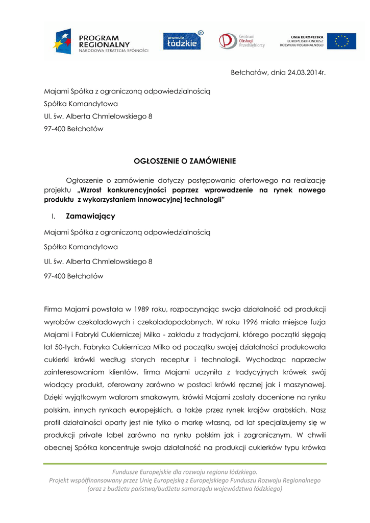 Bełchatów, dnia 24.03.2014r. Majami Spółka z ograniczoną odpowiedzialnością Spółka Komandytowa Ul. św. Alberta Chmielowskiego 8 97-400 Bełchatów OGŁOSZENIE O ZAMÓWIENIE Ogłoszenie o zamówienie dotyczy postępowania ofertowego na realizację projektu „Wzrost konkurencyjności poprzez wprowadzenie na rynek nowego produktu z wykorzystaniem innowacyjnej technologii” I. Zamawiający Majami Spółka z ograniczoną odpowiedzialnością Spółka Komandytowa Ul. św. Alberta Chmielowskiego 8 97-400 Bełchatów Firma Majami powstała w 1989 roku, rozpoczynając swoja działalność od produkcji wyrobów czekoladowych i czekoladopodobnych. W roku 1996 miała miejsce fuzja Majami i Fabryki Cukierniczej Milko - zakładu z tradycjami, którego początki sięgają lat 50-tych. Fabryka Cukiernicza Milko od początku swojej działalności produkowała cukierki krówki według starych receptur i technologii. Wychodząc naprzeciw zainteresowaniom klientów, firma Majami uczyniła z tradycyjnych krówek swój wiodący produkt, oferowany zarówno w postaci krówki ręcznej jak i maszynowej. Dzięki wyjątkowym walorom smakowym, krówki Majami zostały docenione na rynku polskim, innych rynkach europejskich, a także przez rynek krajów arabskich. Nasz profil działalności oparty jest nie tylko o markę własną, od lat specjalizujemy się w produkcji private label zarówno na rynku polskim jak i zagranicznym. W chwili obecnej Spółka koncentruje swoja działalność na produkcji cukierków typu krówka Fundusze Europejskie dla rozwoju regionu łódzkiego. Projekt współfinansowany przez Unię Europejską z Europejskiego Funduszu Rozwoju Regionalnego (oraz z budżetu państwa/budżetu samorządu województwa łódzkiego) oraz ptasie mleczko, starając się łączyć tradycyjny charakter produktów z wymagana przez rynek dynamika działań. W ofercie dostępne są także inne rodzaje produktów, takie jak galaretki w czekoladzie, pianko-galaretki, sosy i kremy do deserów, cukierki typu toffi. Sprzedaż odbywa się w kanale tradycyjnym, w sieciach (takich jak Carrefour, E.Leclerc, Aldi, Makro Cash, Sedal), oraz na rynkach zagranicznych w takich krajach jak Niemcy, Francja, Finlandia, Anglia kraje arabskie. Jesteśmy jedynym zakładem w Polsce produkującym prawie 100 ton krówki ręcznej w ciągu miesiąca. II. Przedmiot ogłoszenia o zamówienie W związku z realizacją projektu, który polega na wprowadzeniu nowego produktu na rynek z wykorzystaniem innowacyjnej technologii produkcji, który pozwoli zmodernizować park maszynowy oraz zwiększy konkurencyjność firmy na rynku składamy ogłoszenie o zamówienie na: Linię automatycznego pakowania – która umożliwi pakowanie produktu – cukierka typu fuge o jednakowej masie netto w torebki typu doypack. Wymagane minimalne parametry: - automat pakujący opakowania o szerokości od 140 do 250mm, wysokości od 200 do 350mm i dnie od 40 do 70mm - zasilanie: energia elektryczna, sprężone powietrze - czujnik znaku graficznego folii opakowaniowej - wykonanie maszyny: stal nierdzewna i aluminium anodowane z atestami dla przemysłu spożywczego - sterowanie: kolorowy, dotykowy panel operatorski - sygnalizacja wszystkich błędów występujących w maszynie - układ wklejania struny w opakowanie - 10-cio głowicowa waga z odrzutem bocznym, zakres ważenia 10-3000g, interfejsy wejść i wyjść do komunikacji z innymi urządzeniami Fundusze Europejskie dla rozwoju regionu łódzkiego. Projekt współfinansowany przez Unię Europejską z Europejskiego Funduszu Rozwoju Regionalnego (oraz z budżetu państwa/budżetu samorządu województwa łódzkiego) - podajnik z regulowaną prędkością i wysokością, z lejem zasypowym na około 150 litrów produktu, z czujnikiem zapełnienia leja, wykonany z materiałów atestowanych dla przemysłu spożywczego - odbiornik zapakowanych produktów o regulowanej wysokości, wykonany z stali nierdzewnej - podest do obsługi maszyny, w całości w wykonaniu z stali nierdzewnej - wymiary maszyny to: szerokość zakres 1,5m- 6,52, głębokość zakres 2,0m – 10,2m, wysokość zakres 2,0m – 3,94m Planowana realizacja od 01.04.2014r. od 31.12.2014r. Szczegółowych informacji na temat przedmiotu zamówienia udzieli Pani Dagmara Kępka, tel. 44 634 83 31 wew. 41 III. Składanie ofert częściowych Nie jest dopuszczane. IV. Możliwość dokonania zmian w ogłoszeniu o zamówienie Zamawiający zastrzega sobie możliwość dokonania zmian w ogłoszeniu o zamówienie najpóźniej na 3 dni przed zakończeniem składania ofert. Zmiany zostaną zamieszczone na stronie internetowej i tablicy ogłoszeń w siedzibie zamawiającego. V. Możliwość podwykonawstwa Zamawiający dopuszcza możliwość zlecenie części lub całości zamówienia podwykonawcom. VI. Przygotowanie oferty Oferta powinna zawierać : datę sporządzenia i datę ważności, adres lub siedzibę oferenta, Fundusze Europejskie dla rozwoju regionu łódzkiego. Projekt współfinansowany przez Unię Europejską z Europejskiego Funduszu Rozwoju Regionalnego (oraz z budżetu państwa/budżetu samorządu województwa łódzkiego) nr NIP oferenta, cenę netto zamówienia, podpis i pieczęć oferenta. Oferta może być sporządzona na Załączniku nr 1. VII. Kryteria oceny ofert Zamawiający dokona wyboru ofert na podstawie porównania cen. Kryterium cena 100%. VIII. Wycofanie oferty Oferent przed datą wyboru dostawcy może zmienić lub wycofać swoją ofertę. IX. Miejsce i termin składania ofert 1. Oferta może być dostarczona za pośrednictwem: poczty, kurierem lub osobiście: Ul. św. Alberta Chmielowskiego 8 97-400 Bełchatów poczty elektronicznej na adres e-mail: [email protected] 2. Wybór oferenta nastąpi w dniu 07.04.2014r. o godzina 16.00 3. Oferty należy składać do dnia 07.04.2014r. do godziny 10.00 4. Oferty złożone po terminie wskazanym w pkt. 3 nie będą rozpatrywane X. Kontakt w sprawie postępowania ofertowego Dodatkowych informac