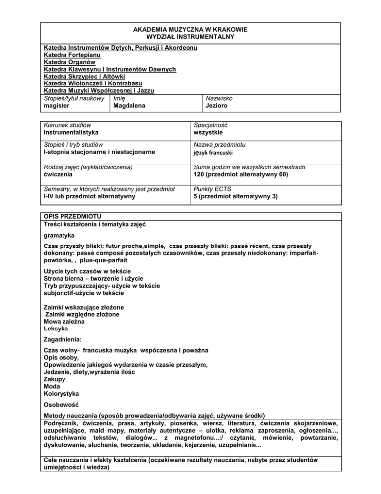 AKADEMIA MUZYCZNA W KRAKOWIE WYDZIAŁ INSTRUMENTALNY Katedra Instrumentów Dętych, Perkusji i Akordeonu Katedra Fortepianu Katedra Organów Katedra Klawesynu i Instrumentów Dawnych Katedra Skrzypiec i Altówki Katedra Wiolonczeli i Kontrabasu Katedra Muzyki Współczesnej i Jazzu Stopień/tytuł naukowy Imię magister Magdalena Nazwisko Jezioro Kierunek studiów Instrumentalistyka Specjalność wszystkie Stopień i tryb studiów I-stopnia stacjonarne i niestacjonarne Nazwa przedmiotu język francuski Rodzaj zajęć (wykład/ćwiczenia) ćwiczenia Suma godzin we wszystkich semestrach 120 (przedmiot alternatywny 60) Semestry, w których realizowany jest przedmiot I-IV lub przedmiot alternatywny Punkty ECTS 5 (przedmiot alternatywny 3) OPIS PRZEDMIOTU Treści kształcenia i tematyka zajęć gramatyka Czas przyszły bliski: futur proche,simple, czas przeszły bliski: passé récent, czas przeszły dokonany: passé composé pozostałych czasowników, czas przeszły niedokonany: imparfaitpowtórka, , plus-que-parfait Użycie tych czasów w tekście Strona bierna – tworzenie i użycie Tryb przypuszczający- użycie w tekście subjonctif-użycie w tekście Zaimki wskazujące złożone Zaimki względne złożone Mowa zależna Leksyka Zagadnienia: Czas wolny- francuska muzyka wspóczesna i poważna Opis osoby, Opowiedzenie jakiegoś wydarzenia w czasie przeszłym, Jedzenie, diety,wyrażenia ilośc Zakupy Moda Kolorystyka Osobowość Metody nauczania (sposób prowadzenia/odbywania zajęć, używane środki) Podręcznik, ćwiczenia, prasa, artykuły, piosenka, wiersz, literatura, ćwiczenia skojarzeniowe, uzupełniające, maid mapy, materiały autentyczne – ulotka, reklama, zaproszenia, ogłoszenia..., odsłuchiwanie tekstów, dialogów... z magnetofonu...:/ czytanie, mówienie, powtarzanie, dyskutowanie, słuchanie, tworzenie, układanie, kojarzenie, uzupełnianie... Cele nauczania i efekty kształcenia (oczekiwane rezultaty nauczania, nabyte przez studentów umiejętności i wiedza) Gramatyka CELE Przyswojenie reguł gramatycznych, poprawne posługiwanie się nabytym materiałem gramatycznym - praktyczne i umiejętne zastosowanie jego zasad. Dodatkowo: systematyczne powtarzanie regularnych i nieregularnych odmian czasowników francuskich w czasie teraźniejszym, przeszłym dokonanym, przeszłym niedokonanym, przyszłym bliskim, przeszłym bliskim oraz nauka tych odmian w czasach: futur simple, subjonctif présent, conditionnel présent, plus-que-parfait . leksyka CELE Umiejętność nazwania potraw, wypowiedzenia się na temat nawyków żywieniowych, relacjonowania poglądów innych osób, swobodne posługiwanie się zwrotami wyrażającymi przypuszczenie, uczucie pewności, niepokój, dezaprobatę. Dodatkowo w ramach programu autorskiego: rozpoznanie różnych poziomów języka, znalezienie się w określonej rzeczywistości lingwistycznej, poszerzenie słownictwa przez zapoznanie się z synonimami innych poziomów językowych odbiegających od języka standardowego lub reprezentowanych przez inny regionalny język francuski: Szwajcaria, Belgia, Kanada... na przykłąd: francuskie soixante-dix (70), a szwajcarskie septante. , Poszerzenie słownictwa przez zapoznanie się z synonimami innych poziomów językowych homme / mec, voiture/ bagnole... Umiejętność opisu mieszkania, domu, określenia stylu, opowiedzenie o swoich preferencjach zamieszkania: miasto, wieś, prezentacja rodziny, zwyczajów w niej panujących, wyrażenie opiniii na temat przyszłości, opowiedzenie o jakimś ciekawym wydarzeniu,, prezentacja legendy związanej z danym miastem krajem. Prezentacja swojego miasta, pokazania jego historii i walorów turystycznych. Umiejętność określenia swojego stylu i zachowania: moda , a moja osobowość. Możliwe języki nauczania Język francuski ZALICZENIE PRZEDMIOTU Terminy, forma i zakres sprawdzianu umiejętności/wiedzy studenta Kolokwium pisemne miedzysemestralne gramatyczno-leksykalne sprawdzajace przyswojenie przez ucznia przerobionej części materiału,semestralna wypowiedź ustna w ramach tematyki leksykalnej zajęć. W semestrze między innymi: krótkie sprawdziany sprawdzające wybiórcze zgadnienie, ustne wypowiedzi w ramach oceniania ciągłego – dialogi, opowiadania, streszczenia, tłumaczenia..., przygotowywanie i przedstawianie wybranego dossier tematycznego na poziomie danej grupy. Sposoby oceny pracy studenta Udział procentowy w ocenie końcowej ocena ciągła (bieżące przygotowanie do zajęć i aktywność) 20% + śródsemestralne kolokwia pisemne/ustne śródsemestralne kolokwia pisemne/ustne końcowe zaliczenie 60% pisemne + ustne:I semestr egzamin pisemny i ustny: II semestr zaliczenie pisemne: test sprawdzający przerobiony materiał gramatyczny i leksykalny z semestru egzamin pisemny : test sprawdzający przerobiony materiał gramatyczny i leksykalny z obydwu semestrów zaliczenie ustne: wybór zagadnień z zakresu leksykiprzerabianych na zajęciach w semestrze tematów cywilizacyjno-kulturalnych. egzamin ustny: wybór z całości zagadnień z zakresu leksyki przerabianych na zajęciach tematów cywilizacyjno-kulturalnych. egzamin praktyczny kontrola obecności 10% praca końcowa semestralna/roczna inne (wymienić) Przygotowanie i ciekawe przedstawienie tematycznego dossier 10% udział w imprezach związanych z nauką przedmiotu – jeśli istnieje taka możliwość: np. Festiwal Piosenki Francuskiej. Ogółem 100 % Literatura obowiązkowa Podręcznik bazowy: CHAMPION II CLE international Literatura uzupełniająca Dodatkowo wybiórczo w ramach programu autorskiego podręczniki wspomagające: Panorama 3 – J.Girardet, J-L. Frérot / CLE International Le nouveau sans frontières 3 – J.Girardet, J.-M. Cridlig, Ph. Dominique / CLE international Dodatkowo wybiórczo w ramach programu autorskiego wykorzystywane w zajęciach artykuły . gramatyka: Grammaire Anne Monnerie: Le français au présent / Didier / Hatier J. Z. Terech: Gramatyka języka francus