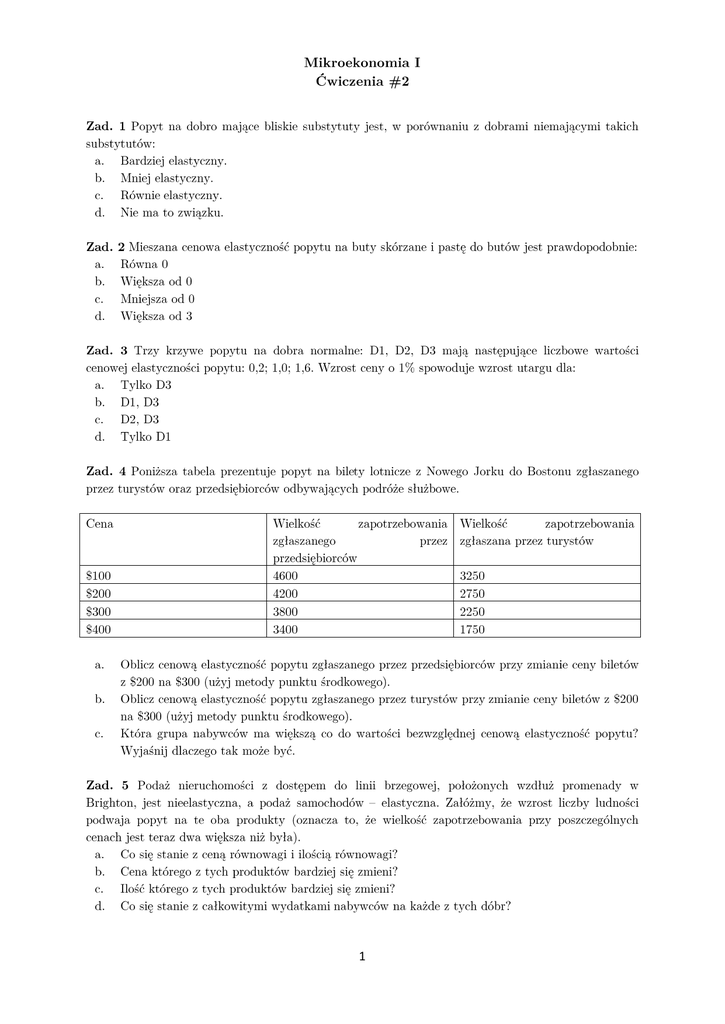 1 2 Eksperyment ukazujący działanie prawa popytu oraz znaczenia cenowej, dochodowej i mieszanej elastyczności popytu Runda 1: Jesteś konsumentem dóbr oferowanych do zakupu w sklepie. Twój całkowity dochód wynosi $5. W ramach danej rundy musisz wydać go w całości. Możesz kupić dowolną ilość produktów, w dowolnej kombinacji, nie musisz kupować każdego rodzaju produktu, ale w całości musisz wydać swój dochód. Ceny produktów zostały przedstawione w poniższej tabeli. W kolumnie „wielkość indywidualnego zapotrzebowania” wpisz liczbę produktów, które chcesz nabyć. Nie wypełniaj kolumny „rynkowa wielkość zapotrzebowania”. Wielkość indywidualnego Wielkość rynkowego zapotrzebowania zapotrzebowania Puszka coca-coli=$1 Snickers=$1 Knoppers=$1 Karton mleka=$1 Runda 2 W wyniku zmiany czynników o charakterze egzogenicznym (plaga niszcząca plantacje orzeszków, powodująca zmniejszenie podaży orzeszków) następuje wzrost ceny jednego z produktów – batoników Snickers, ceteris paribus. Wypełnij poniższą tabelę określając analogicznie do rundy 1 wielość indywidualnego zapotrzebowania na poszczególne produkty mając do dyspozycji dochód w wysokości $5. Wielkość indywidualnego Wielkość rynkowego zapotrzebowania zapotrzebowania Puszka coca-coli=$1 Snickers=$2 Knoppers=$1 Karton mleka=$1 Runda 3 W wyniku uwolnienia zapasów magazynowych orzeszków cena batoników Snickers wraca do swojego wyjściowego poziomu. Z drugiej strony w wyniku reformy szkolnictwa wyższego następuje wzrost wysokości stypendium dla studentów. Skutkiem tego jest wzrost dochodu dla każdego studenta z $5 do $8. Analogicznie do poprzednich sytuacji wypełnij poniższą tabelę określając wielkość indywidualnego zapotrzebowania na poszczególne produkty przy danych cenach oraz dochodzie na poziomie $8. Wielkość indywidualnego Wielkość rynkowego zapotrzebowania zapotrzebowania Puszka coca-coli=$1 Snickers=$1 Knoppers=$1 Karton mleka=$1 3 W ustalonych grupach przygotujcie odpowiedzi na następujące pytania: 1) wykreśl grupową krzywą popytu dla produktu, którego cena zmieniła się w rundzie 2; (2 pkt) 2) wylicz cenową elastyczność popytu dla batoników Snickers i zinterpretuj ją; (2 pkt); 3) wylicz dochodową elastyczność popytu dla batoników Snickers, zinterpretuj ją oraz określ z jakim rodzajem dobra mamy do czynienia (2 pkt); 4) wylicz mieszaną elastyczność popytu pomiędzy batonikami Snickers a każdym innym rodzajem produktu; jakiego typu pary dóbr tworzą batoniki Snickers oraz pozostałe produkty? Jak wzrost ceny batoników Snickers wpłynąłby na krzywą popytu na każde pozostałe dobro? (4 pkt) 4 Eksperyment ukazujący działanie prawa popytu oraz znaczenia cenowej, dochodowej i mieszanej elastyczności popytu Eksperyment ma na celu wyprowadzenie przez studentów własnej krzywej popytu bazując na wyborze konsumenta. Następnie w zależności od zmiany określonych czynników wyznaczana jest elastyczność popytu. Studenci mają za zadanie dokonać zakupu w wirtualnym sklepie mając podane ceny oraz dochód. W poszczególnych etapach eksperymentu zmianie ulegają bądź ceny produktu bądź dochód. Opis eksperymentu: W klasie tworzony jest wirtualny sklep, w którym sprzedawanych jest kilka produktów. Każdy student dostaje kartkę, na której w zależności od ceny produktów oraz dochodu określa wielkość indywidualnego zapotrzebowania. Ilość produktów w sklepie jest nieograniczona (nie mogą wystąpić niedobory). Z drugiej strony każdy student posiada taki sam dochód, który w całości musi wydać w każdej rundzie. Gra składa się z trzech rund. Pierwsza wyznaczona jest przez bazowe wartości cen produktów oraz dochodu. W drugiej rundzie zmianie ulega cena jednego z produktów, ceteris paribus. W trzeciej rundzie ceny produktów wracają do wyjściowych wartości (z pierwszej rundy), zmianie natomiast ulega dochód każdego ze studentów. Każda runda rozgrywana jest niezależnie, tzn. podejmując decyzję dotyczącą wielkości zapotrzebowania w drugiej rundzie nie bierzemy pod uwagę decyzji z pierwszej rundy, itp. Każda runda „zaczyna się od zera”. Runda 1: Jesteś konsumentem dóbr oferowanych do zakupu w sklepie. Twój całkowity dochód wynosi $5. W ramach danej rundy musisz wydać go w całości. Możesz kupić dowolną ilość produktów, w dowolnej kombinacji, nie musisz kupować każdego rodzaju produktu, ale w całości musisz wydać swój dochód. Ceny produktów zostały przedstawione w poniższej tabeli. W kolumnie „wielkość indywidualnego zapotrzebowania” wpisz liczbę produktów, które chcesz nabyć. Nie wypełniaj kolumny „rynkowa wielkość zapotrzebowania”. Wielkość indywidualnego Wielkość rynkowego zapotrzebowania zapotrzebowania Puszka coca-coli=$1 Snickers=$1 Knoppers=$1 Karton mleka=$1 Runda 2 W wyniku zmiany czynników o charakterze egzogenicznym (plaga niszcząca plantacje orzeszków, powodująca zmniejszenie podaży orzeszków) następuje wzrost ceny jednego z produktów – batoników Snickers, ceteris paribus. Wypełnij poniższą tabelę określając analogicznie do rundy 1 wielość indywidualnego zapotrzebowania na poszczególne produkty mając do dyspozycji dochód w wysokości $5. Wielkość indywidualnego Wielkość rynkowego zapotrzebowania zapotrzebowania Puszka coca-coli=$1 Snickers=$2 Knoppers=$1 5 Karton mleka=$1 Runda 3 W wyniku uwolnienia zapasów magazynowych orzeszków cena batoników Snickers wraca do swojego wyjściowego poziomu. Z drugiej strony w wyniku reformy szkolnictwa wyższego następuje wzrost wysokości stypendium dla studentów. Skutkiem tego jest wzrost dochodu dla każdego studenta z $5 do $8. Analogicznie do poprzednich sytuacji wypełnij poniższą tabelę określając wielkość indywidualnego zapotrzebowania na poszczególne produkty przy danych cenach oraz dochodzie na poziomie $8. Wielkość indywidualnego Wielkość rynkowego zapo