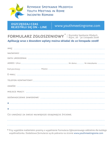 OSZCZĘDZAJ CZAS REJESTRUJ SIĘ ON - LINE www.youthmeetingrome.com Formularz zgłoszeniowy * Rzymskie Spotkanie Młodych Rzym, 28 - 30 Listopada 2008 Aplikację wraz z dowodem wpłaty można składać do 10 listopada 2008! imię: nazwisko: data urodzenia: adres: Ulica: Kod pocztowy: Nr domu: Nr mieszkania: Miasto: E-mail: telefon kontaktowy: zawód: miejsce pracy: doświadczenie zawodowe: • • Co uważasz za swoje największe osiągnięcie życiowe. * Przy wyjeździe małżeńskim prosimy o wypełnienie Formularza Zgłoszeniowego oddzielnie dla każdego współmałżonka. Dodatkowe formularze są do pobrania na stronie www.youthmeetingrome.com Zaznacz warsztat w którym chcesz uczestniczyć: Ekonomia Charles Jonscher Kultura Prof. Krzysztof Zanussi Media Prof. Joaquin Navarro - Valls Nauka Prof. Maria di Pietro Rodzina Veronica i Jude Antoine Społeczeństwo Róża Thun typ rezerwacji 1 osoba Małżeństwo Z zakwaterowaniem* 100 Euro 180 Euro Bez zakwaterowania** 80 Euro 150 Euro Łącznie suma: € *Zakwaterowanie na campingu Village Roma w domkach campingowych 2 – osobowych z ogrzewaniem w bliskim sąsiedztwie Europejskiego Uniwersytetu Rzymskiego, w którym odbywają się wszystkie wykłady i warsztaty: www.ecvacanze.it/en/elite_family/rome/camping-village-roma. Śniadanie na campingu. Adres campingu: Via Aurelia 831, 00165 Roma, tel: (+39) 06 662 30 18. **Na stronie www.youthmeetingrome.com znajduje się baza rekomendowanych hoteli, znajdują cych się w bliskim sąsiedztwie Europejskiego Uniwersytetu Rzymskiego, które mogą stanowić alternatywę dla osób które nie planują noclegów w domkach campingowych. Prosimy o samo dzielne rezerwowanie pokoi w hotelach. Wpłat proszę dokonywać przelewem na konto: ING Bank Belgium: Account Name: ‘Youth Meeting in Rome’ IBAN: BE03363040763884 BIC/Swift: BBRU-BE-BB Tytuł przelewu: Rzymskie Spotkanie Młodych oraz imię i nazwisko uczestnika (-ów). Prosimy o przesłanie formularza zgłoszeniowego wraz z dowodem wpłaty do dnia 10.11 2008 na adres: Rzymskie Spotkanie Młodych ul. Foksal 11, 00-372 Warszawa lub Fax: (+48) 22 826 42 23 lub e-mail: [email protected] Prosimy o informacje dotyczące stosowanych diet i zagrożeń alergicznych wyrażam zgodę na przechowywanie i przetwarzanie moich danych osobowych zawartych w niniejszym formularzu na potrzeby Rzymskiego Spotkania Młodych zgodnie z ustawą z dnia 29 sierpnia 1997 r. O ochronie danych osobowych (Dz.U.Nr 133 poz.883)