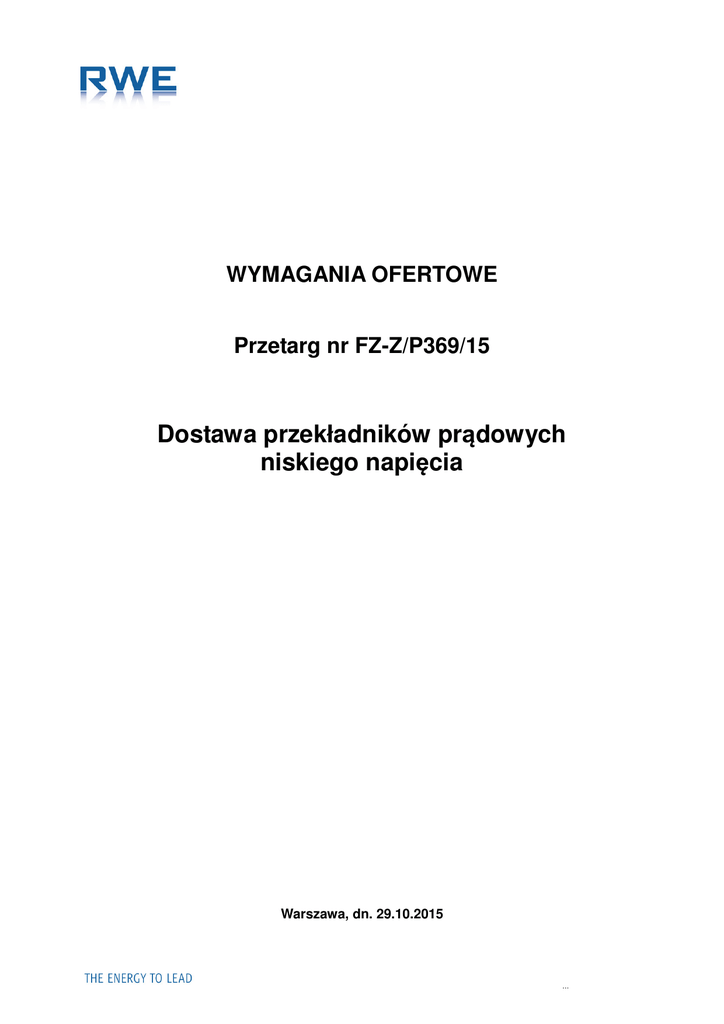 WYMAGANIA OFERTOWE Przetarg nr FZ-Z/P369/15 Dostawa przekładników prądowych niskiego napięcia Warszawa, dn. 29.10.2015 ... Przetarg nr FZ-Z/P369/15 1. Dane Ogólne 1.1. RWE Stoen Operator Spółką z ograniczoną odpowiedzialnością z siedzibą przy ul. Pięknej 46, w Warszawie, zwana dalej „Zamawiającym” w imieniu i na rzecz, którego działa: RWE Polska Spółka Akcyjna z siedzibą przy ul. Wybrzeże Kościuszkowskie 41 w Warszawie zaprasza do wzięcia udziału w Przetargu na Dostawę przekładników prądowych niskiego napięcia. 1.2. Termin realizacji przedmiotu Przetargu: sukcesywnie od kwietnia 2016r. do 14.02.2018r. – termin ostatniej partii dostawy 1.3. O udzielenie zamówienia ubiegać się mogą Oferenci spełniający następujące warunki: a) posiadają niezbędne uprawnienia do występowania w obrocie prawym; b) posiadają niezbędną wiedzę i doświadczenie oraz uprawnienia do wykonywania prac będących przedmiotem Przetargu; c) dysponują odpowiednim potencjałem technicznym oraz osobami zdolnymi do wykonania zamówienia; d) w ciągu ostatnich 3 lat przed upływem terminu składania ofert, a jeżeli okres prowadzenia działalności jest krótszy – w tym okresie, zrealizowali dostawy fabrycznie nowych przekładników prądowych niskiego napięcia o charakterze technicznym i złożoności porównywalnej z zakresem Przetargu w ilości co najmniej 2000 szt. e) nie zalegają z płatnościami wobec Urzędu Skarbowego i ZUS oraz znajdują się w sytuacji finansowej i ekonomicznej pozwalającej na wykonanie przedmiotu Przetargu; 2. Procedura Przetargowa Przetarg składa się z dwóch etapów: Etap I – Zgłoszenie chęci udziału i dokumentów, Etap II – Złożenie ofert za pośrednictwem Portalu Dostawcy RWE: https://supplier.rwe.com/irj/portal/. 2.1. Etap I. Przesłanie drogą mejlową na adres [email protected] zeskanowanych następujących dokumentów w terminie od 04.11.2015r. godz. 1000 do 05.11.2015r. do godz. 14.00. Firmy zostaną niezwłocznie po podjęciu decyzji poinformowane o dopuszczeniu do dalszego udziału w postępowaniu. 2.1.1. podpisany Formularz Zgłoszenia (Załącznik 1); 2.1.2. odpis z właściwego rejestru lub zaświadczenie o wpisie do Ewidencji Działalności Gospodarczej; 2.1.3. wykaz ważniejszych prac lub referencje zgodnie z punktem 1.3.d (oraz kontakt do osoby, która może je potwierdzić) wraz z podaniem ich ilości, przedmiotu, dat wykonania i podmiotów na rzecz których dostawy zostały wykonane wraz z dowodami potwierdzającymi, że dostawy te zostały wykonane lub są wykonywane należycie; 2 Przetarg nr FZ-Z/P369/15 2.1.4. w przypadku, gdy Oferent nie jest producentem wyrobu – aktualną autoryzację producenta, upoważniającą Oferenta do promocji i sprzedaży jego wyrobów w Polsce; 2.2. Etap II – Złożenie ofert za pośrednictwem Portalu https://supplier.rwe.com/irj/portal/. Oferta powinna zawierać: Dostawcy RWE: 2.2.1. wynagrodzenie: a) wysokość wynagrodzenia za realizację przedmiotu Przetargu. Wycena przedmiotu Przetargu polega na podaniu kwot bez VAT, obejmujących całość przedmiotu Przetargu. Wynagrodzenie musi pokrywać wartość kompletnej realizacji przedmiotu Przetargu, w tym np. koszty uzyskania wszelkich niezbędnych do rozpoczęcia realizacji przedmiotu Przetargu opinii, uzgodnień, badań, certyfikatów, materiałów, pozwoleń, decyzji, itp.; b) Zamawiający nie przewiduje dokonywania rozliczeń z Dostawcą w walutach obcych. Wartości muszą być podane w walucie polskiej. 2.2.2. Oferta techniczna a) Oferent przedłoży kompletną dokumentację techniczną przekładników prądowych niskiego napięcia zgodnie z wymaganiami określonymi w Załączniku nr 2 2.3. Składanie oferty 2.3.1. Dokumenty wymienione w punkcie 2.2. (Etap II) Procedury Przetargowej należy złożyć w terminie od 24.11.2015r. od godziny 800 do 25.11.2015r. do godziny 1300 za pośrednictwem Portalu Dostawcy RWE: https://supplier.rwe.com/irj/portal/. 2.3.2. Oferta będzie wprowadzona do Portalu uprawnionego przedstawiciela Oferenta. w języku polskim przez 2.3.3. Wszystkie oferty otrzymane przez Zamawiającego w formie innej niż za pośrednictwem Portalu Dostawcy RWE lub po terminie podanym powyżej nie będą rozpatrywane. 2.3.4. W dniach od 24.11.2015r. od godziny 800 do 25.11.2015r. do godziny 1300 Oferenci, którzy zostaną dopuszczeni do II etapu są zobowiązani do dostarczenia kompletnie technicznej i konstrukcyjnej oraz w pełni funkcjonalnej próbki oferowanych urządzeń tj. po jednym przekładniku z każdego typoszeregu prądowego do Kancelarii Głównej RWE Polska SA przy ul. Wybrzeże Kościuszkowskie 41 w Warszawie. Opakowanie w którym będą próbki powinno być zaadresowane na adres RWE Polska SA ul. Wybrzeże Kościuszkowskie 41, 00-347 Warszawa i zawierać oznaczenie: „Próbki do postępowania na dostawę przekładników prądowych niskiego napięcia w przetargu nr FZ-Z/P369/15 Komisja przetargowa będzie oceniała poprawność wykonania przekładników w stosunku do wymagań technicznych przedstawionych w Załączniku nr 1. Odbiór przekładników będzie możliwy w dniach 15.01.2016r.- 19.01.2016r. do godz. 1300. Po tym terminie próbka może zostać odesłana na koszt Dostawcy do jego siedziby. 3 Przetarg nr FZ-Z/P369/15 2.3.5. Przekładniki prądowe wraz z systemem montażowym, które w sposób jednoznaczny nie będą wykonane zgodnie z Wymaganiami Technicznymi przedstawionymi w Załączniku nr 1, zostaną odrzucone, a Oferenci, którzy je dostarczyli nie będą uczestniczyli w dalszych etapach postępowania. 2.4. Pozostałe wymagania 2.4.1. Oferta zostanie przesłana bezpłatnie oraz w sposób niewiążący dla Zamawiającego. 2.4.2. Zaleca się, aby Oferent zdobył wszelkie informacje, które mogą być konieczne do przygotowania oferty oraz zaakceptowania umowy. 2.4.3. Każdy Oferent przedłoży tylko jedną ofertę sam lub jako reprezentant spółki. Oferent, który przedłoży więcej niż jedną 