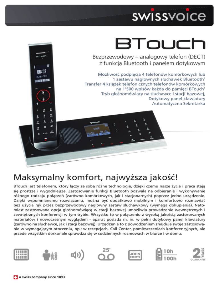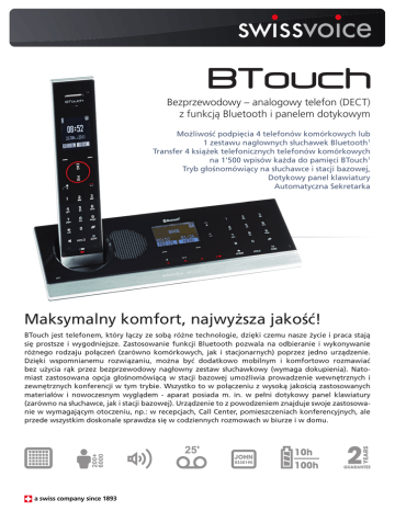 Bezprzewodowy – analogowy telefon (DECT) z funkcją Bluetooth i panelem dotykowym Możliwość podpięcia 4 telefonów komórkowych lub 1 zestawu nagłownych słuchawek Bluetooth1 Transfer 4 książek telefonicznych telefonów komórkowych na 1’500 wpisów każda do pamięci BTouch1 Tryb głośnomówiący na słuchawce i stacji bazowej, Dotykowy panel klawiatury Automatyczna Sekretarka Maksymalny komfort, najwyższa jakość! BTouch jest telefonem, który łączy ze sobą różne technologie, dzięki czemu nasze życie i praca stają się prostsze i wygodniejsze. Zastosowanie funkcji Bluetooth pozwala na odbieranie i wykonywanie różnego rodzaju połączeń (zarówno komórkowych, jak i stacjonarnych) poprzez jedno urządzenie. Dzięki wspomnianemu rozwiązaniu, można być dodatkowo mobilnym i komfortowo rozmawiać bez użycia rąk przez bezprzewodowy nagłowny zestaw słuchawkowy (wymaga dokupienia). Natomiast zastosowana opcja głośnomówiącą w stacji bazowej umożliwia prowadzenie wewnętrznych i zewnętrznych konferencji w tym trybie. Wszystko to w połączeniu z wysoką jakością zastosowanych materiałów i nowoczesnym wyglądem - aparat posiada m. in. w pełni dotykowy panel klawiatury (zarówno na słuchawce, jak i stacji bazowej). Urządzenie to z powodzeniem znajduje swoje zastosowanie w wymagającym otoczeniu, np.: w recepcjach, Call Center, pomieszczeniach konferencyjnych, ale przede wszystkim doskonale sprawdza się w codziennych rozmowach w biurze i w domu. Bezprzewodowy – analogowy telefon (DECT) z funkcją Bluetooth i panelem dotykowym Główne cechy Wyświetlacz Tryb głośnomówiący ECO mode Bluetooth podświetlany-graficzny 7 liniowy wyświetlacz słuchawki podświetlany-graficzny 5 liniowy wyświetlacz bazy regulowany, na słuchawce i stacji bazowej redukcja ograniczająca emisje fal radiowych podłączenie 4 telefonów komórkowych1, jednoczesna praca 2 telefonów komórkowych1, lub 1 telefonu komórkowego1 i 1 zestawu słuchawek nagłownych, transfer 4 książek telefonicznych telefonów komórkowych do pamięci BTouch 2 Cechy dodatkowe Klawiatura Melodie Poufność Blokady Zegar BTouch dotykowy panel klawiatury słuchawki i stacji bazowej 5 monofonicznych i 15 HiFi melodii słuchawki 10 monofonicznych melodii stacji bazowej wyciszenie mikrofonu słuchawki i stacji bazowej blokada klawiatury, czujnik zbliżeniowy data i czas widoczne na wyświetlaczu Książki telefoniczne i listy połączeń Książki BTouch CLIP/CNIP* Dzwonki Ponowny wybór Czas połączeń Wybieranie Interkom Konferencja 1 wspólna książka telefoniczna na 200 wpisów dla wszystkich słuchawek i bazy 4 książki telefoniczne telefonów komórkowych na 1’500 wpisów każda1, chronione kodem PIN prezentacja numeru CLIP osobne dla połączeń stacjonarnych i komórkowych lista 20 ostatnio wybieranych numerów widoczny w trakcie trwania rozmowy i po jej zakończeniu wprowadzanie numeru przed uzyskaniem sygnału możliwość przełączenia rozmów wewnętrznych i zewnętrznych 2 wewnętrzne i 1 zewnętrzna lub 1 wewnętrzna i 2 zewnętrzne Automatyczna Sekretarka Pojemność Sygnalizacja Zdalny dostęp Zapowiedź Memo BTouch HSCB do 25 minut licznik nowych nagrań z datą i godziną chroniony kodem PIN 3 standardowe zapowiedzi (brak polskiej) możliwość nagrania własnej możliwość nagrania własnych notatek głosowych Dane sieciowe Typ sieci Tryb wybierania telefon przeznaczony na linię analogową pulsowy, tonowy Dane techniczne Standard Rozbudowa Czas pracy Zasilanie Zasięg Gwarancja DECT/GAP do 5 słuchawek na stacji bazowej czas rozmowy do 10 godzin, czas czuwania do 100 godzin akumulator 2.4 V NiMH DECT: na zewnątrz do 300 m, wewnątrz do 50 m Bluetooth: do 9 m 2 lata Swissvoice SA Chemin des Mûriers 1 CH-1170 Aubonne Tel: +41 21 821 39 39 Fax: +41 21 808 39 35 [email protected] www.swissvoice.net Dane logistyczne Rodzaj Kod produktu EAN BTouch PL 20406089 7611425170891 Opakowanie 5 sztuk w kartonie zbiorczym Wymiary produktu 264 x 160 x 60 mm Wymiary pudełka 322 x 278 x 182 Twój dealer: 1 Zastrzegamy możliwość zmian. Kompatybilność poprzez połączenie Bluetooth funkcjonuje z telefonami: Apple, Blackberry, HTC, LG, Motorola, Nokia, Samsung, Sony Ericsson (lista ta nie jest pełna, kompatybilność zależy od poszczególnych modeli telefonów. 2 Słuchawki nagłowne Bluetooth nie są załączone w zestawie. *Jeśli usługa jest świadczona przez operatora