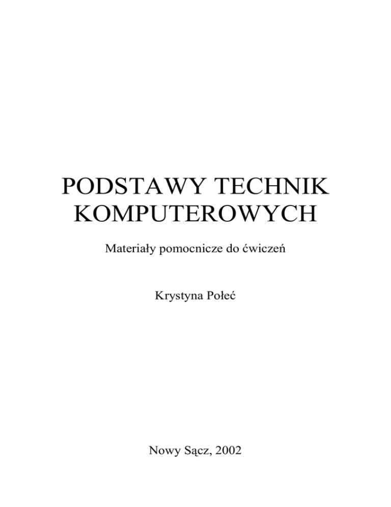 PODSTAWY TECHNIK KOMPUTEROWYCH Materiały pomocnicze do ćwiczeń Krystyna Połeć Nowy Sącz, 2002 Wydawca: WyŜsza Szkoła Biznesu – National-Louis University ul. Zielona 27, 33-300 Nowy Sącz tel.: (0 prefix 18) 44 99 100 e-mail: [email protected] Projekt okładki: Renata Kalarus Skład: Krystyna Połeć Druk: Drukarnia GOLDRUK, Nowy Sącz Copyright ©2002 WyŜsza Szkoła Biznesu – National-Louis University Krystyna Połeć, Nowy Sącz, 2002 ISBN 83-88421-24-7 Wydanie 1 Nowy Sącz, 2002 Spis treści Drodzy studenci Rozdział 1. System Windows. Internet. Intranet. Poczta elektroniczna ....... 5 Rozdział 2. Tworzenie i zapisywanie dokumentów ........................................ 25 Rozdział 3. Tworzenie folderów. Zapisywanie dokumentów Przenoszenie informacji pomiędzy programami ........................ 51 Rozdział 4. Komputery, dyski, foldery, pliki ................................................... 61 Rozdział 5. Operacje na plikach i folderach.................................................... 81 Rozdział 6. Komendy systemu DOS. Program Widows Commander ........... 93 Aneks A System MS Windows..................................................................... 105 Aneks B System MS DOS............................................................................. 109 Aneks C Program Windows Commander ................................................... 121 Drodzy studenci! Komputery stają się urządzeniami codziennego uŜytku. Rozwój technologii pozwala na wyposaŜenie komputerów w niespotykaną moc, system MS Windows ułatwia obsługę programów, ekspansja sieci i Internetu stwarza efektywne narzędzia komunikacji międzyludzkiej przezwycięŜając odległość i czas. Niech więc wszyscy doskonalą swe umiejętności. I Ci którzy o komputerach wszystko juŜ wiedzą i Ci, którzy o komputerach duŜo wiedzieć chcą. Zachęcamy Was do pracy na zajęciach i w domu. Mamy nadzieję, Ŝe dzięki niniejszemu opracowaniu będzie to zadanie łatwiejsze i bardziej efektywne. Autorka i asystenci WI Rozdział 1 System Windows. Internet. Intranet. Poczta elektroniczna W rozdziale tym przystąpisz do pracy w sieci komputerowej WSB-NLU. Zalogujesz się wykorzystując swój identyfikator i hasło. Odwiedzisz stronę internetową WSB-NLU i strefę intranetową. Otworzysz swoją skrzynkę pocztową i wyślesz list elektroniczny.Uporządkujesz wiadomości o zasadach pracy w systemie Windows. Po ukończeniu ćwiczeń powinieneś umieć: • logować się do pracy w sieci komputerowej WSB-NLU, • uruchamiać programy w systemie Windows, • surfować przeglądarką po stronach www, • wchodzić do Intranetu i przeglądać potrzebne informacje, • odczytywać wiadomości i wysyłać pocztę elektroniczną. Uwaga! Podsumowanie informacji o systemie MS Windows znajduje się w aneksie A. Podstawy Technik Komputerowych Zadanie 1 – Jak się zaczyna i kończy pracę Rozpoczynanie i kończenie pracy na stanowisku komputerowym, Okno dialogowe Rozpocznij logowanie, klawiatura, myszka, pulpit, Aby rozpocząć pracę na stanowisku komputerowym musisz włączyć komputer i „przedstawić” się systemowi Uczynisz to podając swój identyfikator i hasło. Rozpocznie działanie system operacyjny MS Windows 2000 Professional a Ty będziesz wydawał mu polecenia przy pomocy klawiatury i myszki. Po pomyślnym zalogowaniu na ekranie pojawi się pulpit. Zapoznaj się z pulpitem a następnie bezpiecznie zamknij system. Informacje o logowaniu Microsoft Microsoft Logowanie się (Puk, puk, to ja) Windows 2000 ® Professional Oparty na technologii NT Nazwa uŜytkownika jkowalski Hasło ******************** Zaloguj do WSB Zaloguj uŜywając połaczenia telefonicznego OK Anuluj Zamknij... Zaparz kawę Uwierzytelnianie (Wchodź, znam Cię) Rys. 1 Schemat logowania do systemu Windows Dla systemu nazywasz się tak jak Twój identyfikator. Podawaj go, gdy ktoś Cię pyta o user name, nazwę uŜytkownika, uŜytkownika, login name czy po prostu o Twój login. Identyfikator nie jest tajny. 6 © K.Połeć, WSB-NLU Rozdział 1. System Windows. Internet, Intranet, poczta elektroniczna. Przystępowanie do pracy Uruchamianie komputera. Logowanie się do domeny. Informacje o logowani u Microso ft Microsoft 2000 Windows Professional ® Oparty na technologiiNT Technology UŜytkownik jkowalski Twój identyfikator (potem klawisz tabulacji) Hasło Zaloguj do Twoje hasło (potem klawisz Tab) WSB Domena (potem klawisz Enter,Enter) OK Anuluj Zamknij... <<Opcje Rys. 2 Okno Informacje o logowaniu Aby uruchomić stanowisko komputerowe: 1. 2. 3. 4. 5. Włącz komputer i monitor. Obserwuj procedury startowe aŜ do ukazania się okna Rozpocznij logowanie. W oknie Rozpocznij logowanie naciśnij jednocześnie 3 klawisze Ctrl+Alt+Del. (Wskazówka: naciśnij i trzymaj klawisz Ctrl oraz Alt a następnie krótko naciśnij klawisz Delete). Poczekaj na wyświetlenie okna Informacje o logowaniu. Aby usunąć nazwę poprzedniego uŜytkownika kliknij za ostatnią literą jego identyfikatora i naciśnij klawisz Backspace. Wpisz swoje dane do pól okna. Logowanie się to proces przystępowania do pracy w sieci. Identyfikator (i pierwsze hasło) wygenerował dla Ciebie administrator, otrzymałeś je wraz z indeksem. Większość identyfikatorów w WSB-NLU to pierwsza litera imienia i nazwisko. Z identyfikatorem związane są określone prawa w systemie (np. do których komputerów masz dostęp, które programy moŜesz wykonywać, na których drukarkach moŜesz drukować). Poprzez załoŜenie identyfikatora otrzymałeś konto w systemie w domenie WSB. Hasło broni dostępu do Twego konta. Utrzymuj je w tajemnicy. Od czasu do czasu zmieniaj. Domena to grupa komputerów w sieci lokalnej. Jako student WSB-NLU będziesz zawsze logował się do domeny WSB. Kliknij czyli najedź wskaźnikiem myszki a potem naciśnij i zwolnij lewy przycisk myszki. śeby umieści kursor w określonym polu naleŜy najechać na tekst wskaźnikiem myszki i kliknąć. 