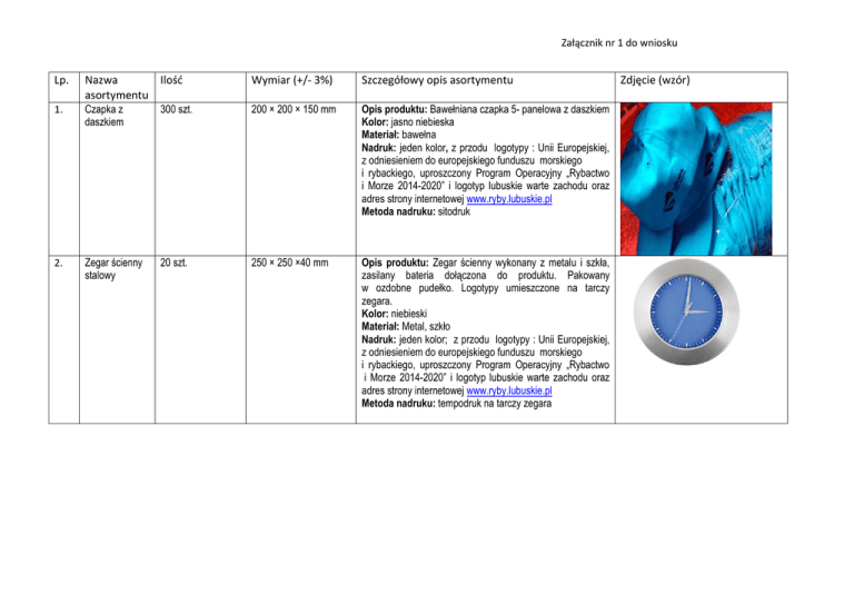 Załącznik nr 1 do wniosku Lp. Nazwa Ilość asortymentu Wymiar (+/- 3%) Szczegółowy opis asortymentu 1. Czapka z daszkiem 300 szt. 200 × 200 × 150 mm Opis produktu: Bawełniana czapka 5- panelowa z daszkiem Kolor: jasno niebieska Materiał: bawełna Nadruk: jeden kolor, z przodu logotypy : Unii Europejskiej, z odniesieniem do europejskiego funduszu morskiego i rybackiego, uproszczony Program Operacyjny „Rybactwo i Morze 2014-2020” i logotyp lubuskie warte zachodu oraz adres strony internetowej www.ryby.lubuskie.pl Metoda nadruku: sitodruk 2. Zegar ścienny stalowy 20 szt. 250 × 250 ×40 mm Opis produktu: Zegar ścienny wykonany z metalu i szkła, zasilany bateria dołączona do produktu. Pakowany w ozdobne pudełko. Logotypy umieszczone na tarczy zegara. Kolor: niebieski Materiał: Metal, szkło Nadruk: jeden kolor; z przodu logotypy : Unii Europejskiej, z odniesieniem do europejskiego funduszu morskiego i rybackiego, uproszczony Program Operacyjny „Rybactwo i Morze 2014-2020” i logotyp lubuskie warte zachodu oraz adres strony internetowej www.ryby.lubuskie.pl Metoda nadruku: tempodruk na tarczy zegara Zdjęcie (wzór) Załącznik nr 1 do wniosku 3. Zestaw upominkowy pióro i długopis 80 szt. Wym. 17,8 x 6,4 x 4,2 cm Zestaw upominkowy zawierający długopis (niebieski wkład) i pióro kulkowe (niebieski wkład). Zestaw zapakowany w eleganckie pudełko. Wym. 17,8 x 6,4 x 4,2 cm. NADRUK dwustronny : sitodruk, jeden kolor, logotypy: z przodu logotypy : Unii Europejskiej, z odniesieniem do europejskiego funduszu morskiego i rybackiego, uproszczony Program Operacyjny „Rybactwo i Morze 20142020” i logotyp lubuskie warte zachodu oraz adres strony internetowej www.ryby.lubuskie.pl MIEJSCE NADRUKU: pióro i długopis, 4. Długopis plastikowy 300 szt. 140×9×9mm Ø 12 mm Opis produktu: Długopis plastikowy, korpus w kolorze białym, końcówka i środek długopisu w kolorze niebieskim. Kolor: biały z niebieskimi elementami Nadruk: jeden kolor; po jednej stornie adres strony internetowej www.ryby.lubuskie.pl, po drugiej stronie logotypy: z przodu logotypy : Unii Europejskiej, z odniesieniem do europejskiego funduszu morskiego i rybackiego, uproszczony Program Operacyjny „Rybactwo i Morze 2014-2020” i logotyp lubuskie warte zachodu. Metoda nadruku: tempodruk Załącznik nr 1 do wniosku 5. Długopis aluminiowy 300 szt. 140 x 10 x 10 mm 1. Długopis Lindo a. Opis/Materiał: długopis aluminiowy. Wyposażony w niebieski wkład. Logo naniesione na korpus techniką grawerki laserowej. b. Ilość: 300 sztuk. c. Kolor: srebrny - 100 szt., czarny – 100, niebieski 100 szt. d. Wymiary: 140 x 10 x 10 mm (+ / - 3%). e. Kolor wkładu: niebieski. f. Technika zdobienia: laser 55 x 6 mm. g. Nadruk: każdy długopis powinien posiadać nadruk monochromatyczny h. Znakowanie (treść nadruku): nadruk na długopisach powinien zawierać logotypy: z przodu logotypy : Unii Europejskiej, z odniesieniem do europejskiego funduszu morskiego i rybackiego, uproszczony Program Operacyjny „Rybactwo i Morze 2014-2020” i logotyp lubuskie warte zachodu oraz adres strony internetowej www.ryby.lubuskie.pl. Opakowanie produktu: folia. Pakowanie zbiorcze: w karton. Na kartonie winna być umieszczona informacja dotycząca przedmiotu i ilości sztuk w danym kartonie. Załącznik nr 1 do wniosku 6. Latarka ledowa 100 szt. Wym. 88 x śr 26 mm. Opis produktu: metalowa latarka LED, 9-diodowa z baterią dołączoną do produktu. Nadruk: jeden kolor; po jednej stornie adres strony internetowej www.ryby.lubuskie.pl, po drugiej stronie logotypy: z przodu logotypy : Unii Europejskiej, z odniesieniem do europejskiego funduszu morskiego i rybackiego, uproszczony Program Operacyjny „Rybactwo i Morze 2014-2020” oraz logotyp lubuskie warte zachodu. Metoda nadruku: grawer laserowy 7. Pendrive (16 GB) 10 szt. 55,4 x 19,2 x 10.9 mm Pendrive USB 3.0 kompatybilny z USB 2.0 wykonany z blaszek srebrnych, pozostałe aluminium, obudowa plastikowa w kolorze niebieskim Nadruk: jeden kolor; po jednej stornie adres strony internetowej www.ryby.lubuskie.pl, po drugiej stronie logotypy: z przodu logotypy : Unii Europejskiej, z odniesieniem do europejskiego funduszu morskiego i rybackiego, uproszczony Program Operacyjny „Rybactwo i Morze 2014-2020” i logotyp lubuskie warte zachodu. Metoda nadruku: grawer laserowy Załącznik nr 1 do wniosku 8. Peleryna przeciwdeszcz owa 200 szt. Rozmiar XXL Peleryna przeciwdeszczowa wielokrotnego kapturem, zapinana na napy użytku, z Materiał: folia LDPE, Krój: unisex Kolor: żółty, jasno zielony, błękitny, pomarańczowy Powierzchnia nadruku: 4x1,8 cm NADRUK z przodu logotypy : Unii Europejskiej, z odniesieniem do europejskiego funduszu morskiego i rybackiego, uproszczony Program Operacyjny „Rybactwo i Morze 2014-2020” i logotyp lubuskie warte zachodu. Z tyłu adres strony internetowej www.ryby.lubuskie.pl. METODA NADRUKU: naklejka z nadrukiem fullcolor Ilość: 200, po 50 sztuk każdego koloru Opakowanie zbiorcze - kartony z oznakowaniem rodzaju gadżetu, ilości oraz koloru Załącznik nr 1 do wniosku 9. Torba papierowa 500 szt. 300 × 400 × 120 mm Torba papierowa, z uchwytem na dwa sznureczki przewlekane przez dziurki Kolory sznurków: białe Materiał: biały papier kredowy, laminowany folią matową, zastosowanie lakieru wybiórczego Gramatura: 170 g/m2 biały (+/- 3%) Nadruk: z przodu logotypy : Unii Europejskiej, z odniesieniem do europejskiego funduszu morskiego i rybackiego, uproszczony Program Operacyjny „Rybactwo i Morze 2014-2020” i logotyp lubuskie warte zachodu oraz adres strony internetowej www.ryby.lubuskie.pl. METODA NADRUKU: sitodruk, full color Opakowanie zbiorcze - kartony z oznakowaniem rodzaju gadżetu oraz ilości 10. T-shirt męski 200 szt. T- shirt z taśmą wzdłuż karku, z podwójnym szwem przy rękawach, wokół wykroju szyi i wzdłuż brzegu, bez szwów bocznych Materiał niekurczliwy: 100 % bawełna Gramatura: 210 g/m2 Rozmiar: L- 50 szt. (zielony), X