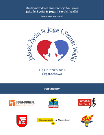 Międzynarodowa Konferencja Naukowa Jakość Życia & Joga i Sztuki Walki Częstochowa 2-4.12.2016 Partnerzy Międzynarodowa Konferencja Naukowa Jakość Życia & Joga i Sztuki Walki Częstochowa 2-4.12.2016 PROGRAM Akademia im. Jana Długosza w Częstochowie ul. Armii Krajowej 13/15, Aula A-22 2.12.2016 PIĄTEK 15:00 - 15:15 15:15 - 15:45 15:45 - 16:00 sesja 1 16:00 - 16:30 Uroczyste otwarcie Mieszane oceny agonologii – najprostszy środek realizowania przez każdą jednostkę lub zespół „Częstochowskiej Deklaracji 2015: HMA przeciw MMA” prof. Roman Maciej Kalina przerwa kawowa prof Roman Kalina, dr hab. Jacek Wąsik, prof. AJD. Popraw swoją jakość życia dr hab. Janusz Szopa prof. AWF The features of physical and psychological components of student`s quality life who are engaged in kickboxing and yoga 17:00 - 17:30 Przeciwutleniacze i flawonoidy w profilaktyce zdrowia 17:30 - 18:00 Etapy rozwoju i adaptacji jogi współczesnej na Zachodzie – analizy zjawiska akulturacji 16:30 - 17:00 prof. Anatolii Tsos, mgr Julia Khylchuk, dr Vasyl Pantik, mgr Sergii Tsymbaluk mgr Wojciech Karpowicz dr hab. Lesław Kulmatycki prof. AWF 3.12.2016 SOBOTA sesja 2 10:00 - 10:15 10:15 - 10:30 prof. Roman Kalina, prof. Anatolij Tsos Sztuki walki a zdrowie dr hab. Jacek Wąsik, prof. AJD Poprawa jakości życia zawodników sportów i sztuk walki na płaszczyźnie fizycznej i psychicznej - podejście indywidualne i podejście zbiorowe Karol Kuzior, Piotr Kruk, dr Dorota Ortenburger, mgr Tomasz Góra, dr hab. Jacek Wąsik, prof. AJD Stretching jako istotny element treningu sztuk walki - okiem przyszłych fizjoterapeutek 10:45 - 11:00 MMA (mieszane sztuki walki) sport XXI wieku 11:00 - 11:15 Sprawność fizyczna zawodników trenujących wybrane sporty walki 11:15 - 11:30 Kinematyczne skutki zmiany otoczenia zewnętrznego – pomiar kopnięcia frontalnego taekwon-do 11:30 - 11:45 przerwa kawowa 10:30 - 10:45 Marta Meslik, Agnieszka Galewicz, Agata Wójcik dr Justyna Glińska, dr Jaromir Grymanowski Jaromir Grymanowski, dr Justyna Glińska dr hab. Jacek Wąsik, prof AJD, dr Dorota Ortenburger, mgr Tomasz Góra Międzynarodowa Konferencja Naukowa Jakość Życia & Joga i Sztuki Walki Częstochowa 2-4.12.2016 PROGRAM Akademia im. Jana Długosza w Częstochowie ul. Armii Krajowej 13/15, Aula A-22 3.12.2016 SOBOTA sesja 3 prof. AWF, dr hab. Janusz Szopa, prof. AWF, dr hab. Lesław Kulmatycki, dr Agata Chorbacz 11:45 - 12:00 Wpływ ćwiczeń hatha jogi na poprawę jakości życia seniorów w świetle badań dr Joanna Górna, dr hab. Janusz Szopa, prof. AWF 12:00 - 12:15 Jak starożytna joga może poprawić jakość życia 12:15 - 12:30 Wpływ technik relaksacyjnych na jakość życia 12:30 - 12:45 Postrzeganie ciała a praktykowanie jogi 12:45 - 13:00 The Realization of Yoga Therapy in the Complex Rehabilitation of Patients after Myocardial Infarction 13:00 - 13:15 dr hab. Janusz Szopa, prof. AWF, mgr Agnieszka Furmańczyk dr hab. Janusz Szopa, prof. AWF, mgr Agnieszka Kmiecik mgr Aleksandra Budzisz Nataliia Bielikova, Svitlana Indyka, Nataliia Ulianytska Jakość życia w programie „Optymizm plus” - joga w budżecie czasu wolnego Marta Cieślik, Aleksandra Cieślik, Anastasiia Kolisetska, dr Dorota Ortenburger, dr Daniel Bakota, Jowita Wyszomierska sesja 4 posterowa połączona z panelem dyskusujnym prof. AWF, dr hab. Janusz Szopa, prof. AJD dr hab. dr hab. Jacek Wąsik 13:15 - 14:15 Specyfika urazów w wybranych sportach walki Stanek Aleksandra, Berwecki Arkadiusz The influence of 1-year Tai Chi practice on health behavior in adults Agata Milert, Wiktoria Klich, Tomasz Ridan, Joanna Morgaś Aktywność ruchowa pracowników administracji Akademii im Jana Długosza w Częstochowie Joanna Rodziewicz-Gruhn, Aleksandra Świątkiewicz Assessment of selected health indicators in high school students Jaroslava Olšavská, prof. Klaudia Zusková Posture in yoga class undergraduates dr Agata Horbacz, dr Alena Buková Charakterystyka budowy ciała chłopców trenujących piłkę nożną 14:15 - 15:15 przerwa kawowa dr Joanna Rodziewicz-Gruhn, Łukasz Ciecierski, doc. dr Anatol Gierasiewicz Międzynarodowa Konferencja Naukowa Jakość Życia & Joga i Sztuki Walki Częstochowa 2-4.12.2016 PROGRAM Akademia im. Jana Długosza w Częstochowie ul. Armii Krajowej 13/15, Aula A-22 3.12.2016 SOBOTA sesja 5 prof. Wiesław Pilis, dr Pantik Vasyl, dr Alena Bukowa 15:15 - 15:30 Wpływ specyficznych obciążeń na adaptacyjne reakcje organizmu mężczyzn 15:30 - 15:45 Próg wentylacyjny w sporcie wyczynowym 15:45 - 16:00 Jakość życia a aktywność psychospołeczna u pacjentów z rozpoznaniem chorób psychosomatycznych. Raport z badań 16:00 - 16:15 Jaskinie jako pasja, sport i nauka 16:15 - 16:30 Rola diety wśród wspinaczy i speleologów na Wyżynie Krakowsko-Wieluńskiej 16:30 - 16:45 Zakończenie konferencji Olga Roda, Ludmiła Waszczuk, Olena Demianczuk mgr Michał Zych, dr Cezary Michalski, dr Anna Pilis, prof. Wiesław Pilis, dr Krzysztof Stec, dr Karol Pilis, mgr Damian Kosiński mgr Magdalena Szyszko, dr Dorota Pawlik dr Katarzyna Kasprowska-Nowak dr Katarzyna Kasprowska-Nowak, Michał Myga Sala Gimnastyczna Częstochowa 4.12.2016 NIEDZIELA 10:00 - 13:00 Warsztaty jogi - dr hab. Janusz Szopa, prof. AWF Partnerzy