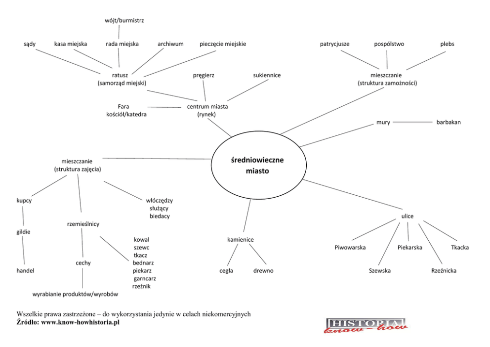 wójt/burmistrz sądy kasa miejska rada miejska archiwum ratusz (samorząd miejski) Fara kościół/katedra pieczęcie miejskie pręgierz patrycjusze sukiennice pospólstwo mieszczanie (struktura zamożności) centrum miasta (rynek) mury barbakan średniowieczne miasto mieszczanie (struktura zajęcia) kupcy plebs włóczędzy służący biedacy ulice rzemieślnicy gildie cechy handel kowal szewc tkacz bednarz piekarz garncarz rzeźnik kamienice Piwowarska cegła wyrabianie produktów/wyrobów Wszelkie prawa zastrzeżone – do wykorzystania jedynie w celach niekomercyjnych Źródło: www.know-howhistoria.pl drewno Piekarska Szewska Tkacka Rzeźnicka