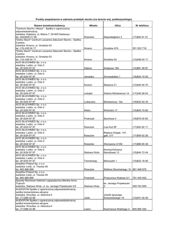 Punkty zaopatrzenia w zakresie protetyki słuchu (na terenie woj. podkarpackiego) Nazwa świadczeniodawcy "Centrum Słuchu i Mowy" - Spółka z ograniczoną odpowiedzialnością siedziba: Kajetany, ul. Mokra 7, 05-830 Nadarzyn tel. (022)635 41 09 "Dobry Słuch" Centrum Leczenia Zaburzeń Słuchu - Spółka Cywilna siedziba: Krosno, ul. Grodzka 53 tel. (13) 436 04 17 "Dobry Słuch" Centrum Leczenia Zaburzeń Słuchu - Spółka Cywilna siedziba: Krosno, ul. Grodzka 53 tel. (13) 436 04 17 ACS SŁUCHMED Sp. z o.o. siedziba: Lublin, ul. Orla 5 tel. (81)534 97 97 ACS SŁUCHMED Sp. z o.o. siedziba: Lublin, ul. Orla 5 tel. (81)534 97 97 ACS SŁUCHMED Sp. z o.o. siedziba: Lublin, ul. Orla 5 tel. (81)534 97 97 ACS SŁUCHMED Sp. z o.o. siedziba: Lublin, ul. Orla 5 tel. (81)534 97 97 ACS SŁUCHMED Sp. z o.o. siedziba: Lublin, ul. Orla 5 tel. (81)534 97 97 ACS SŁUCHMED Sp. z o.o. siedziba: Lublin, ul. Orla 5 tel. (81)534 97 97 ACS SŁUCHMED Sp. z o.o. siedziba: Lublin, ul. Orla 5 tel. (81)534 97 97 ACS SŁUCHMED Sp. z o.o. siedziba: Lublin, ul. Orla 5 tel. (81)534 97 97 ACS SŁUCHMED Sp. z o.o. siedziba: Lublin, ul. Orla 5 tel. (81)534 97 97 ACS SŁUCHMED Sp. z o.o. siedziba: Lublin, ul. Orla 5 tel. (81)534 97 97 ACS SŁUCHMED Sp. z o.o. siedziba: Lublin, ul. Orla 5 tel. (81)534 97 97 ACS SŁUCHMED Sp. z o.o. siedziba: Lublin, ul. Orla 5 tel. (81)534 97 97 Amplifon Poland Sp. z o.o. siedziba: Łódź, ul. Tkacka 50 tel. 800 888 899 Amplifon Poland Sp. z o.o. siedziba: Łódź, ul. Tkacka 50 tel. 800 888 899 Aparaty Słuchowe Gabinet Logopedyczny Monika Anna Trybuch siedziba: Stalowa Wola, ul. ks. Jerzego Popiełuszki 2/2 AUDIOFON Spółka z ograniczoną odpowiedzialnością spółka komandytowo-akcyjna siedziba: Wrocław, ul. Aliancka 6 tel. (71)388 22 88 AUDIOFON Spółka z ograniczoną odpowiedzialnością spółka komandytowo-akcyjna siedziba: Wrocław, ul. Aliancka 6 tel. (71)388 22 88 Miasto Ulica Nr telefonu Rzeszów Niepodległości 3 (17)852 81 51 Krosno Grodzka 47A 501 622 718 Krosno Grodzka 53 (13)436 04 17 Dębica Kolejowa 18A (14)681 58 87 Jarosław Grunwaldzka 1 (16)624 10 93 Krosno Staszica 21 (13)420 40 70 Leżajsk Adama Mickiewicza 14 (17)240 28 04 Lubaczów Mickiewicza 10a (16)632 02 34 Nisko Wolności 17 (15)844 75 82 Przemyśl Sportowa 4 (16)676 00 65 Rzeszów Lisa Kuli 9F (17)852 82 17 Rzeszów Rejtana 53/gab. 147, gab. 217 (17)859 02 26 Rzeszów Warzywna 3/109 (17)866 95 39 Stalowa Wola Komisji Edukacji Narodowej 13 (15)844 72 44 Tarnobrzeg Moniuszki 1 (15)822 18 06 Rzeszów Stefana Żeromskiego 10 881 948 979 Przemyśl Przecznica Wałowa 4/1 791 440 402 Stalowa Wola ks. Jerzego Popiełuszki 2 509 763 949 Jasło Józefa Ignacego Kraszewskiego 19 (13)441 02 40 Lesko Kazimierza Wielkiego 4 605 880 320 AUDIOFON Spółka z ograniczoną odpowiedzialnością spółka komandytowo-akcyjna siedziba: Wrocław, ul. Aliancka 6 tel. (71)388 22 88 AUDIOFON Spółka z ograniczoną odpowiedzialnością spółka komandytowo-akcyjna siedziba: Wrocław, ul. Aliancka 6 tel. (71)388 22 88 AUDIOFON Spółka z ograniczoną odpowiedzialnością spółka komandytowo-akcyjna siedziba: Wrocław, ul. Aliancka 6 tel. (71)388 22 88 AUDIOFON Spółka z ograniczoną odpowiedzialnością spółka komandytowo-akcyjna siedziba: Wrocław, ul. Aliancka 6 tel. (71)388 22 88 AUDIOFON Spółka z ograniczoną odpowiedzialnością spółka komandytowo-akcyjna siedziba: Wrocław, ul. Aliancka 6 tel. (71)388 22 88 AUDIOFON Spółka z ograniczoną odpowiedzialnością spółka komandytowo-akcyjna siedziba: Wrocław, ul. Aliancka 6 tel. (71)388 22 88 AUDIONOVA sp. z o.o. siedziba: Lublin, ul. Bernardyńska 10 tel. (81)532 55 70 DOR-MED POLSKA Sp. z o.o. siedziba: Bydgoszcz, ul. Karłowicza 26/225 tel. (52) 341 94 97 DOR-MED POLSKA Sp. z o.o. siedziba: Bydgoszcz, ul. Karłowicza 26/225 tel. (52) 341 94 97 ECHO Krzysztof Oniszko FoniMed Aparaty Słuchowe Barbara Włodarczyk siedziba: 36-007 Krasne 350 Fonmed S.C. Krzysztof Stokaluk, Wojciech Góralczyk siedziba: Kraków, ul. Św. Katarzyny 4 Fonmed S.C. Krzysztof Stokaluk, Wojciech Góralczyk siedziba: Kraków, ul. Św. Katarzyny 4 tel. (12)430 60 11 GEERS Akustyka Słuchu Sp. z o.o. siedziba: Łódź, ul. Narutowicza 130 tel. (42)616 26 53 GEERS Akustyka Słuchu Sp. z o.o. siedziba: Łódź, ul. Narutowicza 130 tel. (42)616 26 53 GEERS Akustyka Słuchu Sp. z o.o. siedziba: Łódź, ul. Narutowicza 130 tel. (42)616 26 53 GEERS Akustyka Słuchu Sp. z o.o. siedziba: Łódź, ul. Narutowicza 130 tel. (42)616 26 53 GEERS Akustyka Słuchu Sp. z o.o. siedziba: Łódź, ul. Narutowicza 130 tel. (42)616 26 53 GEERS Akustyka Słuchu Sp. z o.o. siedziba: Łódź, ul. Narutowicza 130 tel. (42)616 26 53 GEERS Akustyka Słuchu Sp. z o.o. siedziba: Łódź, ul. Narutowicza 130 tel. (42)616 26 53 GEERS Akustyka Słuchu Sp. z o.o. siedziba: Łódź, ul. Narutowicza 130 tel. (42)616 26 53 GEERS Akustyka Słuchu Sp. z o.o. siedziba: Łódź, ul. Narutowicza 130 tel. (42)616 26 53 GEERS Akustyka Słuchu Sp. z o.o. siedziba: Łódź, ul. Narutowicza 130 tel. (42)616 26 53 Mielec Pułaskiego 2b/4 (17)583 57 14 Rzeszów Grunwaldzka 42/3 (17)852 84 43 Rzeszów Lubelska 6/208 (17)864 13 34 Sanok Lipińskiego 10 (13)464 56 13 Stalowa Wola Komisji Edukacji Narodowej 13 (15)875 52 95 Tarnobrzeg Mickiewicza 34F (15)822 11 22 Rzeszów Rejtana 10 (17)853 88 33 Rzeszów Hetmańska 21 gab. 3 728 378 547 Rzeszów Przeworsk Wierzbowa 17 Szpitalna 20 (17)850 29 46 (16)648 32 22 Rzeszów Warzywna 1 662 128 671 Krosno Korczyńska 57 (13)437 83 32 Przemyśl Sportowa 6 (16)675 12 37 Dębica Rynek 50 (14)670 30 07 Jarosław Słowackiego 26/A 500 242 978 Leżajsk Leśna 22 (17)242 67 89 Łańcut Rynek 32 (17)225 54 14 Mielec Rynek 8 (17)586 23 22 Mielec Żeromskiego 17 (17)585 43 23 Przemyśl Plac na Bramie 10 (16)675 11 24 Rzeszów 3 Maja 20 (17)853 88 48 Rzeszów Stefana Batorego 18/9 (17)862 00 53 Sanok Kościuszki 3 (13)463 04 20 GEERS Akustyka Słuchu Sp. z o.o. siedziba: Łódź, ul. Narutowicza 130 tel. (42)6
