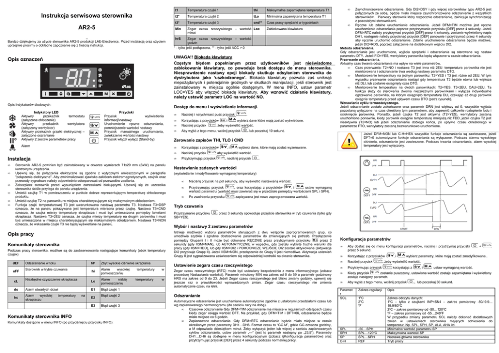 Instrukcja serwisowa sterownika AR2-5 t1 Temperatura czujki 1 thi Maksymalna zapamiętana temperatura T1 t2* Temperatura czujki 2 tLo Minimalna zapamiętana temperatura T1 t3* Temperatura czujki 3 cnd** Czas pracy sprężarki w tygodniach Min Zegar czasu rzeczywistego – wartość Loc minut Zablokowana klawiatura ,, Bardzo dziękujemy za użycie sterownika AR2-5 produkcji LAE-Electronics. Przed instalacją oraz użyciem uprzejmie prosimy o dokładne zapoznanie się z treścią instrukcji. Zegar czasu rzeczywistego – wartość godzin * - tylko jeśli podłączona, ** - tylko jeśli ACC > 0 Opis oznaczeń UWAGA!! Blokada klawiatury Częstym błędem popełnianym przez użytkowników jest nieświadome zablokowanie klawiatury, co powoduje brak dostępu do menu sterownika. Niesprawdzenie nastawy opcji blokady skutkuje odsyłaniem sterownika do dystrybutora jako ‘uszkodzonego’. Blokada klawiatury pozwala zaś uniknąć niepożądanych i potencjalnie groźnych w skutkach manipulacji, jeśli sterownik jest zainstalowany w miejscu ogólnie dostępnym. W menu INFO, ustaw parametr LOC=YES aby włączyć blokadę klawiatury. Aby wznowić działanie klawiatury, należy ustawić parametr LOC na wartość NO. Opis Indykatorów diodowych: Dostęp do menu i wyświetlanie informacji. Indykatory LED Aktywny przekaźnik termostatu (załączone chłodzenie) Aktywny przekaźnik wentylatora (załączony wentylator) Aktywny przekaźnik grzałki elektrycznej – załączone oszranianie Aktywny 2 zestaw parametrów pracy Przyciski Przycisk wyświetlenia informacji\nastawy Uruchomienie ręczne odszraniania, pomniejszenie wartości nastawy Przycisk manualnego uruchamiania, zwiększenie wartości nastawy Przycisk włącz\ wyłącz (Stand-by) Alarm Instalacja • • • • • • Sterownik AR2-5 powinien być zainstalowany w otworze wymiarach 71x29 mm (SxW) na panelu kontrolnym urządzenia. Upewnij się, że połączenia elektryczne są zgodne z wytycznymi umieszczonymi w paragrafie "połączenia elektryczne". Aby zminimalizować zjawisko zakłóceń elektromagnetycznych, czujnik oraz przewody sygnałowe należy odpowiednio odseparować od przewodów zasilania. Zabezpiecz sterownik przed wysunięciem zatrzaskami blokującymi. Upewnij się że uszczelka sterownika ściśle przylega do panelu urządzenia. Umieść czujkę T1 w pomieszczeniu w punkcie dobrze reprezentującym temperaturę chłodzonego produktu. Umieść czujkę T2 na parowniku w miejscu charakteryzującym się maksymalnym oblodzeniem. Funkcja czujki temperaturowej T3 jest uwarunkowana nastawą parametru T3. Nastawa T3=DSP oznacza, że na panelu pokazywana jest temperatura mierzona przez czujkę. Nastawa T3=CND oznacza, że czujka mierzy temperaturę skraplacza i musi być umieszczona pomiędzy lamelami skraplacza. Nastawa T3=2EU oznacza, że czujka mierzy temperaturę na drugim parowniku i musi być umieszczona w miejscu charakteryzującym się maksymalnym oblodzeniem. Nastawa T3=NON oznacza, że wskazania czujki T3 nie będą wyświetlane na panelu. Opis pracy Komunikaty sterownika Podczas pracy sterownika, możliwe są do zaobserwowania następujące komunikaty (obok temperatury czujek): dEF oFF cL hrS Odszranianie w toku Sterownik w trybie czuwania Niezbędne czyszczenie skraplacza do Alarm otwartych drzwi hc Alarm wysokiej skraplaczu temperatury na hP Zbyt wysokie ciśnienie skraplania hi Alarm wysokiej pomieszczeniu Lo Alarm niskiej pomieszczeniu E1 Błąd czujki 1 E2 E3 Błąd czujki 2 Błąd czujki 3 Komunikaty sterownika INFO Komunikaty dostępne w menu INFO (po przyciśnięciu przycisku INFO): temperatury temperatury w w • Naciśnij i natychmiast puść przycisk • • Korzystając z przycisków i wybierz dane które mają zostać wyświetlone. Naciśnij przycisk , żeby wyświetlić wartość. • Aby wyjść z tego menu, wciśnij przycisk . • Zsynchronizowane odszranianie. Gdy DI2=DSY i gdy więcej sterowników typu AR2-5 jest połączonych ze sobą, będzie miało miejsce zsynchronizowane odszranianie z wszystkich sterowników. Pierwszy sterownik który rozpocznie odszranianie, zainicjuje synchronizację z pozostałymi sterownikami. • Ręczne lub zdalne uruchamianie odszraniania. Jeżeli DFM=TIM możliwe jest ręczne uruchomienie odszraniania poprzez przytrzymanie przycisku [DEF] przez 4 sekundy. Jeżeli DFM=RTC należy przytrzymać przycisk [DEF] przez 4 sekundy, zostanie wyświetlony napis DH1, następnie należy przycisnąć przycisk [DEF] ponownie i przytrzymać przez 4 sekundy aby ręcznie uruchomić odszranianie. Zdalne uruchomienie odszraniania będzie możliwe, jeżeli DI2=RDS, poprzez załączenie na dodatkowym wejściu DI2. Metoda odszraniania. Gdy odszranianie jest uruchomione, wyjścia sprężarki i odszraniania są sterowane wg nastaw parametru DTY. Jeżeli FID=YES, wentylatory parownika będą włączone w czasie odszraniania. Przerwanie odszraniania. Aktualny czas trwania odszraniania ma wpływ na wiele parametrów. • Czas przerwania: T2=NO i nastawa T3 jest inna niż 2EU: temperatura parownika nie jest monitorowana i odszranianie trwa według nastawy parametru DTO. • Monitorowanie temperatury na jednym parowniku: T2=YES i T3 jest różne od 2EU. W tym wypadku przerwanie odszraniania nastąpi gdy temperatura T2 będzie równa lub większa niż DLI, lub zostanie osiągnięty czas DTO. • Monitorowanie temperatury na dwóch parownikach: T2=YES, T3=2EU, OAU=2EU. Ta funkcja służy do sterowania dwoma niezależnymi parownikami i wyłącza indywidualne ogrzewanie parownika, na którym osiągnięto temperaturę DLI, czekając aż drugi parownik osiągnie temperaturę przed upływem czasu DTO (patrz rysunek). Wznawianie cyklu termostatycznego. Jeżeli odszranianie zostało zakończone oraz parametr DRN jest większy od 0, wszystkie wyjścia pozostaną wyłączone na czas określony tym parametrem, aby zapewnić całkowite roztopienie lodu i ocieknięcie parownika. Ponadto, jeżeli czujka T2 jest aktywna (T2=YES),