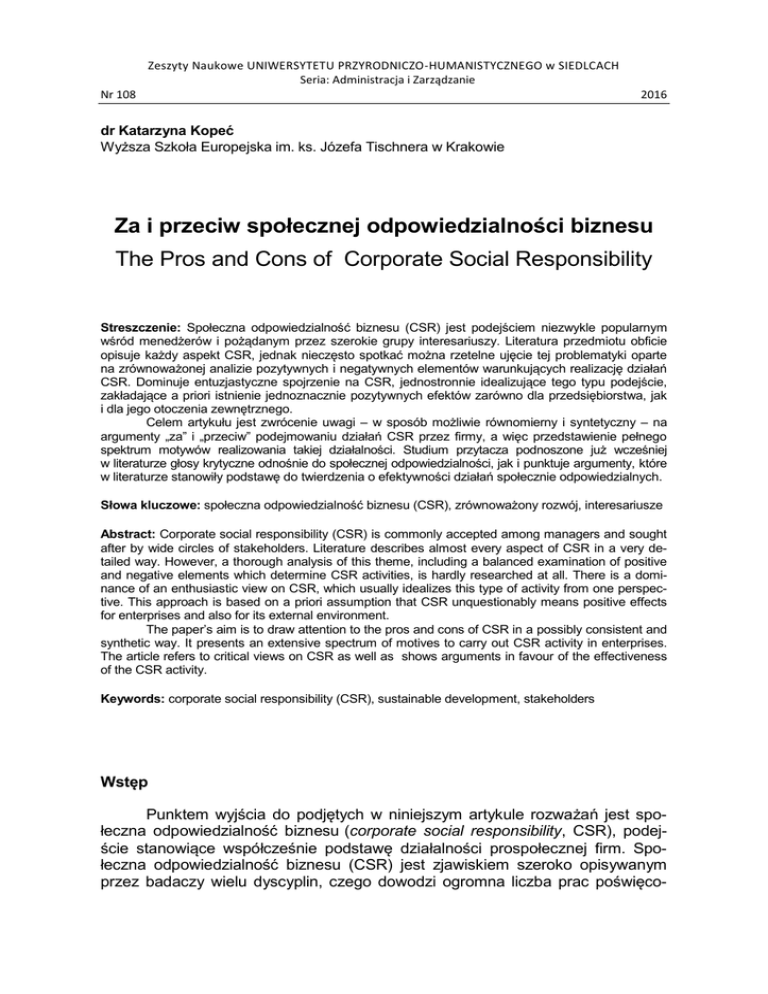 Zeszyty Naukowe UNIWERSYTETU PRZYRODNICZO-HUMANISTYCZNEGO w SIEDLCACH Seria: Administracja i Zarządzanie Nr 108 2016 dr Katarzyna Kopeć Wyższa Szkoła Europejska im. ks. Józefa Tischnera w Krakowie Za i przeciw społecznej odpowiedzialności biznesu The Pros and Cons of Corporate Social Responsibility Streszczenie: Społeczna odpowiedzialność biznesu (CSR) jest podejściem niezwykle popularnym wśród menedżerów i pożądanym przez szerokie grupy interesariuszy. Literatura przedmiotu obficie opisuje każdy aspekt CSR, jednak nieczęsto spotkać można rzetelne ujęcie tej problematyki oparte na zrównoważonej analizie pozytywnych i negatywnych elementów warunkujących realizację działań CSR. Dominuje entuzjastyczne spojrzenie na CSR, jednostronnie idealizujące tego typu podejście, zakładające a priori istnienie jednoznacznie pozytywnych efektów zarówno dla przedsiębiorstwa, jak i dla jego otoczenia zewnętrznego. Celem artykułu jest zwrócenie uwagi – w sposób możliwie równomierny i syntetyczny – na argumenty „za” i „przeciw” podejmowaniu działań CSR przez firmy, a więc przedstawienie pełnego spektrum motywów realizowania takiej działalności. Studium przytacza podnoszone już wcześniej w literaturze głosy krytyczne odnośnie do społecznej odpowiedzialności, jak i punktuje argumenty, które w literaturze stanowiły podstawę do twierdzenia o efektywności działań społecznie odpowiedzialnych. Słowa kluczowe: społeczna odpowiedzialność biznesu (CSR), zrównoważony rozwój, interesariusze Abstract: Corporate social responsibility (CSR) is commonly accepted among managers and sought after by wide circles of stakeholders. Literature describes almost every aspect of CSR in a very detailed way. However, a thorough analysis of this theme, including a balanced examination of positive and negative elements which determine CSR activities, is hardly researched at all. There is a dominance of an enthusiastic view on CSR, which usually idealizes this type of activity from one perspective. This approach is based on a priori assumption that CSR unquestionably means positive effects for enterprises and also for its external environment. The paper’s aim is to draw attention to the pros and cons of CSR in a possibly consistent and synthetic way. It presents an extensive spectrum of motives to carry out CSR activity in enterprises. The article refers to critical views on CSR as well as shows arguments in favour of the effectiveness of the CSR activity. Keywords: corporate social responsibility (CSR), sustainable development, stakeholders Wstęp Punktem wyjścia do podjętych w niniejszym artykule rozważań jest społeczna odpowiedzialność biznesu (corporate social responsibility, CSR), podejście stanowiące współcześnie podstawę działalności prospołecznej firm. Społeczna odpowiedzialność biznesu (CSR) jest zjawiskiem szeroko opisywanym przez badaczy wielu dyscyplin, czego dowodzi ogromna liczba prac poświęco- 128 K. Kopeć nych tej tematyce. Nieczęsto jednak spotkać można krytyczne ujęcie tej problematyki bądź jest ono ograniczone do dość schematycznego wyliczenia argumentów podnoszonych przez zwolenników i przeciwników podejścia CSR w biznesie. Świadczyć to może o społecznym niezrozumieniu tej idei. Lektura tekstów poświęconych CSR skłoniła autorkę do refleksji nad dominacją entuzjastycznego postrzegania tej idei wśród polskich autorów. Celem artykułu jest z tego względu zwrócenie uwagi – równomiernie pokazując racje obu stron – na argumenty „za” i „przeciw” podejmowaniu działań społecznie odpowiedzialnych przez podmioty biznesowe. Tekst wyjaśnia ponadto trudności definicyjne związane z terminem CSR oraz licznymi koncepcjami pokrewnymi. Artykuł powstał na podstawie krytycznej analizy literatury przedmiotu. W kierunku definicji CSR Wedle najnowszej definicji zawartej w normie ISO 26 000:2010 społeczna odpowiedzialność to „odpowiedzialność organizacji za wpływ podejmowanych decyzji i działań na społeczeństwo i środowisko, zapewniana poprzez przejrzyste i etyczne postępowanie, które: przyczynia się do zrównoważonego rozwoju, w tym zdrowia i dobrobytu społeczeństwa; uwzględnia oczekiwania interesariuszy (osób lub grup, które są zainteresowane decyzjami lub działaniami organizacji); jest zgodne z obowiązującym prawem i spójne z międzynarodowymi normami postępowania; jest zintegrowane z działaniami organizacji i praktykowane w jej relacjach, które dotyczą działań organizacji podejmowanych w obrębie jej sfery oddziaływań”1. Już powyższa definicja emanuje znacznym entuzjazmem w zakresie dobroczynnego wpływu społecznej odpowiedzialności na zrównoważony rozwój, dalsza część broszury poświęconej normie ISO 26000 zawiera fragment dotyczący korzyści, jakie mogą osiągnąć firmy, stosując ISO 26 0002. Henry C. Wallich i Henry G. Manne zwracają uwagę, iż by móc określić zachowanie przedsiębiorstwa jako społecznie odpowiedzialnego, musi być ono całkowicie niewymuszone, dobrowolne. Ta dobrowolność była często podkreślana we wcześniejszych definicjach3. Czy rzeczywiście działania CSR są dobrowolne? Liczne przykłady, podawane jako wzór nowego podejścia biznesu do odpowiedzialności względem społeczności, nie mogą zostać określone jako dobrowolne, czego dowodem jest wymiana nośników freonowych w opakowaniach ISO 26 000 Społeczna odpowiedzialność, s. 2, http://www.pkn.pl/sites/default/files/discovering_iso_26000.pdf [dostęp: 20.02.2014]. 2 Tamże, s. 3. 3 Zob. Różnorodność ujęcia społecznej odpowiedzialności analizował Alexander Dahlsrud, zestawiając ze sobą 37 definicji CSR sformułowanych pomiędzy 1980 a 2003 r. W wyniku jego analizy wyszczególnionych zostało pięć elementów wspólnych tych definicji: dobrowolność inicjatyw w zakresie CSR podejmowanych przez środowiska biznesu, aspekt prowadzenia