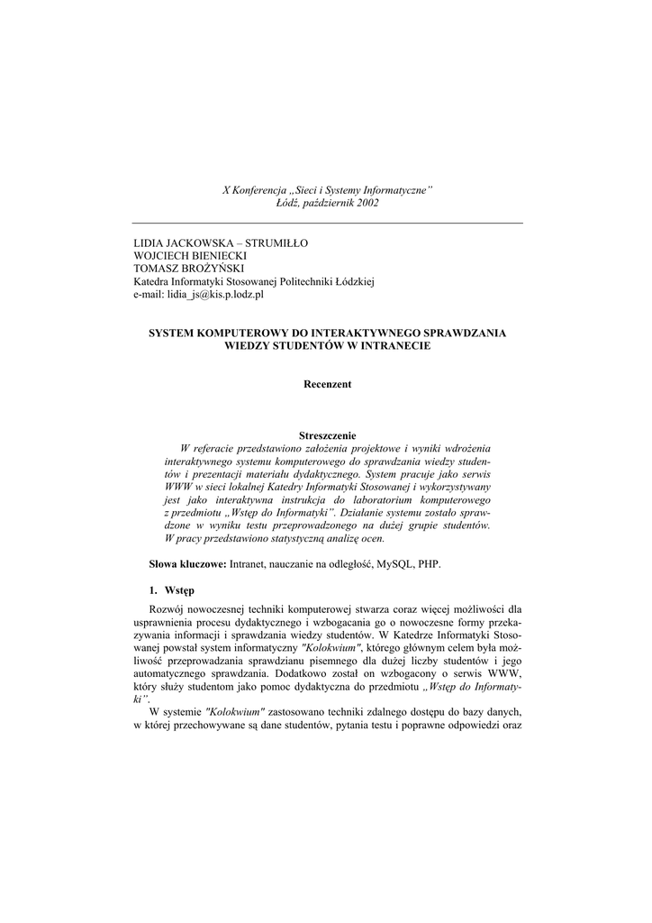 X Konferencja „Sieci i Systemy Informatyczne” Łódź, październik 2002 LIDIA JACKOWSKA – STRUMIŁŁO WOJCIECH BIENIECKI TOMASZ BROŻYŃSKI Katedra Informatyki Stosowanej Politechniki Łódzkiej e-mail: [email protected] SYSTEM KOMPUTEROWY DO INTERAKTYWNEGO SPRAWDZANIA WIEDZY STUDENTÓW W INTRANECIE Recenzent Streszczenie W referacie przedstawiono założenia projektowe i wyniki wdrożenia interaktywnego systemu komputerowego do sprawdzania wiedzy studentów i prezentacji materiału dydaktycznego. System pracuje jako serwis WWW w sieci lokalnej Katedry Informatyki Stosowanej i wykorzystywany jest jako interaktywna instrukcja do laboratorium komputerowego z przedmiotu „Wstęp do Informatyki”. Działanie systemu zostało sprawdzone w wyniku testu przeprowadzonego na dużej grupie studentów. W pracy przedstawiono statystyczną analizę ocen. Słowa kluczowe: Intranet, nauczanie na odległość, MySQL, PHP. 1. Wstęp Rozwój nowoczesnej techniki komputerowej stwarza coraz więcej możliwości dla usprawnienia procesu dydaktycznego i wzbogacania go o nowoczesne formy przekazywania informacji i sprawdzania wiedzy studentów. W Katedrze Informatyki Stosowanej powstał system informatyczny "Kolokwium", którego głównym celem była możliwość przeprowadzania sprawdzianu pisemnego dla dużej liczby studentów i jego automatycznego sprawdzania. Dodatkowo został on wzbogacony o serwis WWW, który służy studentom jako pomoc dydaktyczna do przedmiotu „Wstęp do Informatyki”. W systemie "Kolokwium" zastosowano techniki zdalnego dostępu do bazy danych, w której przechowywane są dane studentów, pytania testu i poprawne odpowiedzi oraz L. Jackowska – Strumiłło, W. Bieniecki, T. Brożyński System komputerowy do interaktywnego sprawdzania wiedzy studentów w Intranecie wyniki testu uzyskane przez studentów. Jako serwer bazy danych wybrano MySQL komunikujący się z serwerem WWW poprzez języki skryptowe PHP i JavaScript. Interfejs użytkownika zrealizowano jako dynamiczną stronę WWW o ograniczonym dostępie. 2. Struktura techniczna systemu System „Kolokwium” został zainstalowany na serwerze Sun Solaris v 2.7. w Katedrze Informatyki Stosowanej. Wykonano również testy na innych systemach operacyjnych: Linux RedHat 7.0, FreeBSD, Windows NT 4.0. System składa się z następujących modułów: - serwer WWW (Apache) udostępniający dokumenty hipertekstowe w intranecie, - zestaw statycznych dokumentów hipertekstowych prezentujących materiały dydaktyczne, - serwer PHP (Personal Home Pages) wspomagający działanie serwera WWW i pozwalający na prezentację dynamicznych dokumentów hipertekstowych oraz komunikację z bazą danych, - zestaw skryptów PHP realizujących dynamiczne strony hipertekstowe, stanowiące interfejs użytkownika do bazy danych, - serwer bazy danych (MySQL) zarządzający bazą danych, - baza danych, w której przechowywane są zestawy pytań, dane osobowe studentów oraz wyniki kolokwium. Struktura systemu przedstawiona została na rys. 1. Serwer WWW PHP MySQL Przeglądarka internetowa Dokumenty hipertekstowe Skrypty PHP Rys 1. Modułowa budowa systemu „Kolokwium”[2]. Baza danych X Konferencja „Sieci i Systemy Informatyczne” Łódź, październik 2002 Dokumenty hipertekstowe w systemie realizowane są w języku DHTML (Dynamic Hipertext Markup Language) [3]. Stanowią one szkielet interfejsu użytkownika, zarówno studenta jak i wykładowcy. Są one udostępnione zarówno w Internecie jak i w Intranecie i zawierają pomoce dydaktyczne dla studentów: instrukcje do ćwiczeń laboratoryjnych ze „Wstępu do Informatyki” oraz wybrane zagadnienia teoretyczne, które prezentowane są na wykładzie lub stanowią jego uzupełnienie. Materiały dydaktyczne dostępne na stronach WWW zostały pogrupowane tematyczne. W celu uatrakcyjnienia i ujednolicenia wyglądu stron WWW do ich budowy zastosowano także arkusze stylów CSS. Są one bardzo wygodne przy modyfikacji treści wykładów lub ćwiczeń oraz przy dodawaniu nowych materiałów dydaktycznych do systemu. Strona tytułowa serwisu WWW została uatrakcyjniona animacjami wykonanymi w technologii Flash. Do realizacji interakcji w systemie, np. efekty rozwijalnego menu ułatwiającego nawigację w materiałach dydaktycznych, zastosowano popularną technikę DHTML JavaScript [1]. Jest to zestaw skryptów działających po stronie przeglądarki. Skrypty te wykorzystano również do weryfikacji danych wpisywanych w formularze kolokwium oraz do tworzeniu zapytań do serwera lub wysyłania danych na podstawie wypełnionych formularzy. Materiały związane z kolokwium udostępniane są studentom tylko w Intranecie, w czasie trwania kolokwium. Mechanizm przetwarzania i prezentacji danych opiera się na konfiguracji współpracujących ze sobą serwerów Apache, PHP, MySQL [4,6]. Wymieniony zestaw trzech produktów stanowi obecnie najpopularniejszą konfigurację dla różnych serwisów internetowych. Serwery te mogą być instalowane na różnych systemach operacyjnych spokrewnionych z Unixem, między innymi darmowych, takich jak Linux i FreeBSD, istnieją również wersje dla Windows NT/2000. O ich popularności decyduje głównie to, że produkty te są darmowe, a dane, czyli struktury katalogowe dokumentów hipertekstowych, skrypty PHP, bazy danych są przenośne pomiędzy różnymi systemami operacyjnymi. PHP i MySQL zostały tak zaprojektowane, że praktycznie stanowią jedno środowisko programowania. Z jednej strony MySQL ma interfejs programowania (API) do PHP (również do innych języków, takich jak C, C++, Eiffel, Java, Perl, Python i Tcl). Z drugiej strony PHP jako język programowania daje duże możliwości tworzenia pętli, instrukcji warunkowych i przetwarzania łańcuchów znakowych. MySQL jest systemem działającym w technologii klient/serwer składającym się z wielowątkowego serwera SQL, który może być obsługiwany przez kilka różnych programów klienta oraz bibliotek, narz