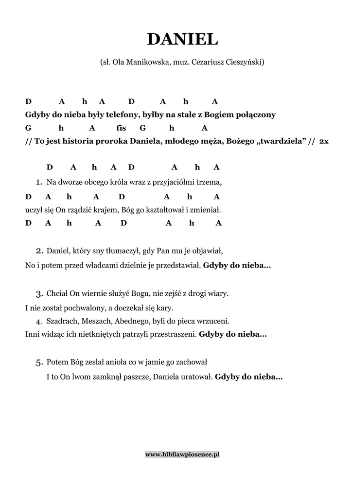 DANIEL (sł. Ola Manikowska, muz. Cezariusz Cieszyński) D A h A D A h A Gdyby do nieba były telefony, byłby na stałe z Bogiem połączony G h A fis G h A // To jest historia proroka Daniela, młodego męża, Bożego „twardziela” // 2x D A h A D A h A 1. Na dworze obcego króla wraz z przyjaciółmi trzema, D A h A D A h A uczył się On rządzić krajem, Bóg go kształtował i zmieniał. D A h A D A h A 2. Daniel, który sny tłumaczył, gdy Pan mu je objawiał, No i potem przed władcami dzielnie je przedstawiał. Gdyby do nieba… 3. Chciał On wiernie służyć Bogu, nie zejść z drogi wiary. I nie został pochwalony, a doczekał się kary. 4. Szadrach, Meszach, Abednego, byli do pieca wrzuceni. Inni widząc ich nietkniętych patrzyli przestraszeni. Gdyby do nieba… 5. Potem Bóg zesłał anioła co w jamie go zachował I to On lwom zamknął paszcze, Daniela uratował. Gdyby do nieba… www.bibliawpiosence.pl