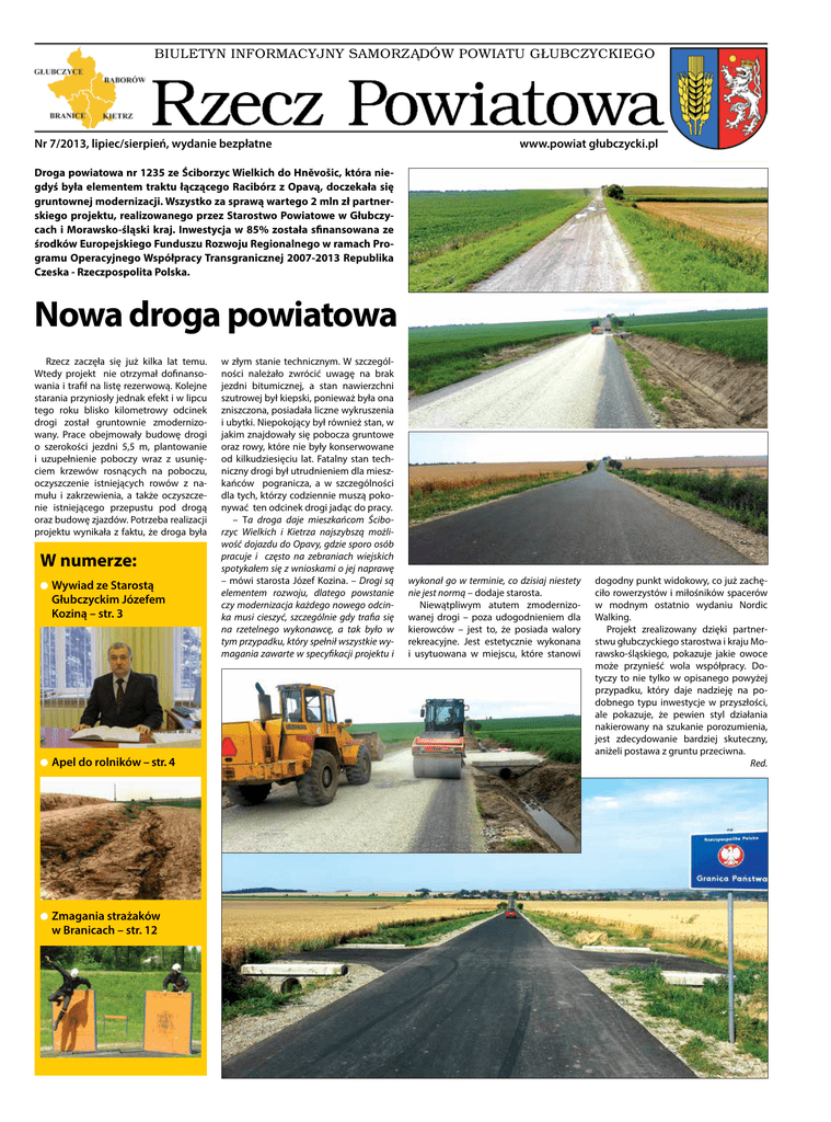 BIULETYN INFORMACYJNY SAMORZĄDÓW POWIATU GŁUBCZYCKIEGO Nr 7/2013, wydanie bezpłatne 1/2013, lipiec/sierpień, styczeń, wydanie bezpłatne www.powiat głubczycki.pl www.powiatglubczycki.pl Droga powiatowa nr 1235 ze Ściborzyc Wielkich do Hnĕvošic, która niegdyś była elementem traktu łączącego Racibórz z Opavą, doczekała się gruntownej modernizacji. Wszystko za sprawą wartego 2 mln zł partnerskiego projektu, realizowanego przez Starostwo Powiatowe w Głubczycach i Morawsko-śląski kraj. Inwestycja w 85% została sfinansowana ze środków Europejskiego Funduszu Rozwoju Regionalnego w ramach Programu Operacyjnego Współpracy Transgranicznej 2007-2013 Republika SAMORZĄD Czeska - Rzeczpospolita Polska. INWESTYCJE Nowa droga powiatowa Rzecz zaczęła się już kilka lat temu. Wtedy projekt nie otrzymał dofinansoOŚWIATA wania i trafił na listę rezerwową. Kolejne starania przyniosły jednak efekt i w lipcu tego roku blisko kilometrowy odcinek drogi został gruntownie zmodernizowany. Prace obejmowały budowę drogi o szerokości jezdni 5,5 m, plantowanie i uzupełnienie poboczy wraz z usunięciem krzewów rosnących na poboczu, oczyszczenie istniejących rowów z namułu i zakrzewienia, a także oczyszczenie istniejącego przepustu pod drogą oraz budowę zjazdów. Potrzeba realizacji KULTURA projektu wynikała z faktu, że droga była W numerze: Wywiad l Wywiad ze ze Starostą Starostą Głubczyckim Głubczyckim Józefem Józefem Koziną Koziną –– str. str. 33 Apel Wielka l doOrkiestra rolników – str. 4 Świątecznej Pomocy – str. 15 w złym stanie technicznym. W szczególności należało zwrócić uwagę na brak jezdni bitumicznej, a stan nawierzchni szutrowej był kiepski, ponieważ była ona zniszczona, posiadała liczne wykruszenia i ubytki. Niepokojący był również stan, w jakim znajdowały się pobocza gruntowe oraz rowy, które nie były konserwowane od kilkudziesięciu lat. Fatalny stan techniczny drogi był utrudnieniem dla mieszkańców pogranicza, a w szczególności dla tych, którzy codziennie muszą pokonywać ten odcinek drogi jadąc do pracy. – Ta droga daje mieszkańcom Ściborzyc Wielkich i Kietrza najszybszą możliwość dojazdu do Opavy, gdzie sporo osób pracuje i często na zebraniach wiejskich spotykałem się z wnioskami o jej naprawę – mówi starosta Józef Kozina. – Drogi są elementem rozwoju, dlatego powstanie czy modernizacja każdego nowego odcinka musi cieszyć, szczególnie gdy trafia się na rzetelnego wykonawcę, a tak było w tym przypadku, który spełnił wszystkie wymagania zawarte w specyfikacji projektu i INFORMACJE Z GMIN wykonał go w terminie, co dzisiaj niestety nie jest normą – dodaje starosta. Niewątpliwym atutem zmodernizowanej drogi – poza udogodnieniem dla kierowców – jest to, że posiada walory rekreacyjne. Jest estetycznie wykonana i usytuowana w miejscu, które stanowi Wszystkim mieszkańcom naszego Powiatu życzymy w 2013 roku szczęścia i zdrowia, spełnienia osobistych planów i ambicji zawodowych oraz radości i optymizmu na każdy dzień dogodny punkt widokowy, co już zachęciło rowerzystów i miłośników spacerów w modnym ostatnio wydaniu Nordic Walking. SPORT Projekt zrealizowany dzięki partnerstwu głubczyckiego starostwa i kraju Morawsko-śląskiego, pokazuje jakie owoce może przynieść wola współpracy. Dotyczy to nie tylko w opisanego powyżej przypadku, który daje nadzieję na podobnego typu inwestycje w przyszłości, ale pokazuje, że pewien styl działania nakierowany na szukanie porozumienia, jest zdecydowanie bardziej skuteczny, aniżeli postawa z gruntu przeciwna. Red. Starosta Głubczycki Józef Kozina lZmagania strażaków „Akademia Myśli i Słowa” w Branicach – str. 12 w Zespole Szkół Ogólnokształcących – str. 9 Wicestarosta Piotr Soczyński Przewodniczący Rady Powiatu Stanisław Krzaczkowski Rzecz Powiatowa 1 Wizyta Marszałka Utworzenie Specjalnej Strefy Demograficznej było głównym powodem wizyty Marszałka Wojwództwa Opolskiego Józefa Sebesty w Gminie Kietrz dnia 28.06.2013 r. Opolszczyzna jest jednym z regionów szczególnie dotkniętych niżem demograficznym. Depopulację i wyludnianie się naszego województwa obserwowaliśmy od dawna, ale dopiero wyniki ostatniego spisu powszechnego ukazały skalę problemu jaka występuje w naszym regionie. Mamy najniższy wskaźnik dzietności matek. – Na Opolszczyźnie 100 kobiet rodzi średnio 108 potomków, w Polsce 128, a w Unii Europejskiej 159 – wyliczał marszałek. Przyczyny wyludnienia naszego regionu to głównie: brak pracy dla młodych ludzi, kiepska opieka nad dziećmi oraz zmiana stylu życia młodych małżeństw. W Polsce w 2035 roku ma być 15% ludzi mniej niż obecnie, a 30% naszego społeczeństwa będą stanowiły osoby starsze. Receptą na kryzys ma być Specjalna Strefa Demograficzna. SSD zawiera 4 pakiety: praca to bezpieczna rodzina, opieka żłobkowo-przedszkolna, edukacja a rynek pracy, złota jesień. Działania Wyróżnienie dla Gminy Branice Gmina Branice otrzymała od Wojewódzkiego Funduszu Ochrony Środowiska i Gospodarki Wodnej w Opolu statuetkę „W trosce o środowisko”, za podjęte w 2012 roku działania na rzecz ochrony środowiska. Wyróżnienie to przyznawane jest corocznie od 2009 roku dla najbardziej aktywnych beneficjentów realizujących projekty proekologiczne, które powstały z udziałem środków WFOŚ. Gmina Branice zrealizowała projekty z zakresu: ochrony wód (budowa oczyszczalni ścieków), ochrony powietrza (termomodernizacji obiektu publicznego) oraz gospodarki odpadami (utylizacja azbestu). Maria Krompiec Atrakcje v Szereg atrakcji dla dzieci v Bogata gastronomia v Punkty informacyjne: LGD, Stajlnet, Solutions v Wystawa sprzętu rolniczego TOP FARMS, KOMBINAT ROLNY KIETRZ v Przejażdżki bryczką v Wioska rycerska v Warsztaty garncarskie v Zjazd byłych mieszkańców Księżego Pola 2 Rzecz Powiatowa Program 11.30 – Przemarsz korow