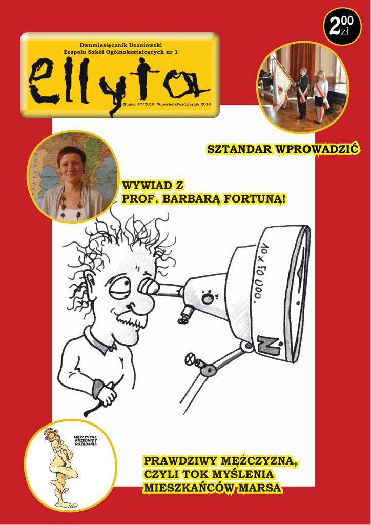 Dwumiesięcznik Uczniowski Zespołu Szkół Ogólnokształcących nr 1 Numer 17/2010 Wrzesień/Październik 2010 SZTANDAR WPROWADZIĆ WYWIAD Z PROF. BARBARĄ FORTUNĄ! PRAWDZIWY MĘŻCZYZNA, CZYLI TOK MYŚLENIA MIESZKAŃCÓW MARSA R o z p o c z ę c i e ro k u s z k o l n e g o 2 0 1 0 / 2 0 1 0 Aktualności Aktualności Sztandar wprowadzić Hołd Muszla Fest 2010 Kto nas będzie reprezentował, czyli wybory samorządowe. „Marzenia i obawy, czyli spowiedź pierwszaka” Ręka na pulsie Nie taka fantastyka zwykła... Przepaść…Co zrobić, by w nią nie wpaść „Bo to jest mój schron” Co robić z wolnym czasem? „Cały świat gra komedię” Chrzest bojowy czyli „witajcie pierwszaki!” Skuwka, zasuwka Drodzy Czytelnicy! W imieniu całej redakcji witam Was serdecznie pierwszy raz w nowym roku szkolnym. Mimo, że już zapomnieliśmy o minionych wakacjach i zaczęliśmy odliczanie do tych kolejnych, z nową energią zaczynamy pisanie dla Was. Do redakcji dołączyli nowi adepci dziennikarstwa, którzy również pragną dla Was tworzyć, a także słuchać, poszukiwać i relacjonować. Z tego miejsca serdecznie ich witam i życzę udanej współpracy z „Ellytą”. W tym numerze polecam Wam felieton Michała z cyklu „Kulturalne narzekania”, artykuł Marty „Bo tu jest mój schron” i tradycyjnie przygotowane przez Dominikę teksty nauczycieli („Psor powiedział”). Życzę miłej lektury, ... czyli małe co nieco o poprawności językowej ... Joanna Kowalska Cool-tura Recenzja książki Jane Green „Domek na plaży” Michał Zaborowski „Śmiechu warte?” Na kozetce Listy do Klementynki Prawdziwy mężczyzna, czyli tok myślenia mieszkańców Marsa. Lekkim piórem Garbus Oda do... ...Łóżka ...Jedzenia Druga strona lustra Wywiad z prof. Barbarą Fortuną! Sport Nie rzucim ziemi skąd nasz ród! Na wesoło Ryciny Grażyny Psor powiedział (uczeń odpowiedział) „Marzenia i obawy, czyli spowiedź pierwszaka” Jeszcze w szkole podstawowej obiecałem sobie, że do gimnazjum będę zdawał do Jedynki. Budynek szkoły, jego wnętrza, miały w sobie coś przyciągającego, żeby nie powiedzieć magicznego. Przekonałem się o tym, będąc na konkursach i drzwiach otwartych. Marzenia o gimnazjum nie udało się zrealizować, bo skończyłem szóstą klasę o rok za wcześnie. Kolejne trzy lata i pierwszy prawdziwy egzamin. Zdałem. Jestem na liście. Dostałem się. Marzenia się zrealizowały, zaczęły się obawy. Na pierwszym spotkaniu z dyrekcją szkoły obawy się pogłębiły. Od elity wymaga się więcej. Skoro tu jesteś, należysz do najlepszych. I znowu kolejne pytania. Jakie wymagania, jakie oczekiwania i czy duchy legendarnych absolwentów elitarnego gimnazjum i liceum będą pomocne i przyjazne, czy złośliwe, jak duchy wybitnych oksfordczyków. Żarty, ale w każdej legendzie jest trochę prawdy. Kolejne obawy to ludzie, jakich tu spotkam. Sympatyczni, inteligentni i otwarci indywidualiści, czy snobowate, zarozumiale indywidua? Sztandar wprowadzić Trzynasty października. Wybiło południe... Tabun pierwszoklasistów w białych kołnierzykach, na wielobarwnych obcasach, świeżo ogolonych i pachnących, kieruje się do drzwi auli. Co to za szkoła? I LO w Bydgoszczy. Zaraz będziemy świadkami ślubowania uczniów na sztandar szkoły. Kiedy wszyscy, rozglądając się, machając do swoich kolegów i koleżanek, śmiejąc się i przeżuwając resztki kanapek spożywanych w czasie przerwy, trwając w radosnym oczekiwaniu głos zabiera Pan DYREKTOR.... Wszelaki gwar w kręgach uczniowskich zamiera... Wszyscy, z uwaga mniejsza lub większą, słuchają co ma do powiedzenia najważniejsza osoba w tej szkole. Słyszymy to co zwykle, ale „szlachectwo zobowiązuje nas” do zachowywania się należycie i powstrzymywania się od ziewania.:) Przechodzimy do części oficjalnej. Już za moment 200 gardeł zagrzmi w auli. Składamy przysięgę. Wśród przyrzeczeń i zdań najgłośniej brzmi jedno z nich : „I nie robić nic!”. OJ! Ależ nam by się to podobało! :) „Co mogłoby splamić dobre imię naszej szkoły”- kończymy ciszej. Przysięga, wypowiedziana. Obietnice-złożone. Ale czy wszystkie z nich spełnimy? Zobaczymy w przyszłości, ale jako uczniowie „elitarnego” liceum nr 1 będziemy się starać, by jak najlepiej wykonywać nasze obowiązki. A co będzie dalej? O tym na razie nie myślimy, ponieważ teraz ochoczo ściskając w rekach akty ślubowania udajemy się na lody, do kina, parku lub po prostu do domu, gdzie z pewnością zasiądziemy do biurek i wykonamy WSZYSTKIE zadania domowe. Marta Przynoga zdjęcia na okładce Wszystkie wątpliwości rozwiał obóz integracyjny. Wspaniała kadra nauczycielska, taka „normalna” i „po prostu”. Oraz sympatyczni, przyjaźni, młodzi ludzie z podobnymi obawami, wśród których bez trudu można znaleźć bratnią duszę. Wszyscy pełni pomysłów, zaangażowani w wiele spraw i idei, o różnorodnych zainteresowaniach, a co najważniejsze dowcipni, z dużym poczuciem humoru. Spędziliśmy wiele fantastycznych dni w nadmorskim Grzybowie, był nawet akcent europejski, jak wycieczka na Bornholm. Niestety, czas, jak zawsze w takich przypadkach, płynął zbyt szybko. Dziś mija kilkanaście dni prawdziwej nauki. Za mną pierwsze sprawdziany i pierwsze oceny. Staram się realizować zainteresowania w wielu dodatkowych zajęciach i chyba tylko czasu, jak zawsze, jest zbyt mało, a spraw interesujących zbyt dużo. Mógłbym wymienić choćby teatr „Scena Jeden”, zespół muzyczny „Number One” czy Samorząd Uczniowski. Samorząd pełen odpowiedzialnych, twórczych i pomocnych ludzi, z którymi nie sposób nie znaleźć wspólnego języka. Ale czy może być inaczej w Szkole Wielu Pokoleń? Pozostając w magicznej atmosferze, jestem pewien, że duchy chyba jednak są przyjazne. Żarty, ale w każdej legendzie jest trochę prawdy. Michał Zaborowski 3 Kto nas będzie reprezentował, czyli p