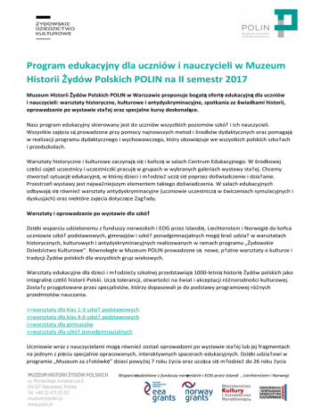 Program edukacyjny dla uczniów i nauczycieli w Muzeum Historii Żydów Polskich POLIN na II semestr 2017 Muzeum Historii Żydów Polskich POLIN w Warszawie proponuje bogatą ofertę edukacyjną dla uczniów i nauczycieli: warsztaty historyczne, kulturowe i antydyskryminacyjne, spotkania ze świadkami historii, oprowadzanie po wystawie stałej oraz specjalne kursy doskonalące. Nasz program edukacyjny skierowany jest do uczniów wszystkich poziomów szkół i ich nauczycieli. Wszystkie zajęcia są prowadzone przy pomocy najnowszych metod i środków dydaktycznych oraz pomagają w realizacji programu dydaktycznego i wychowawczego, który obowiązuje we wszystkich polskich szkołach i przedszkolach. Warsztaty historyczne i kulturowe zaczynają się i kończą w salach Centrum Edukacyjnego. W środkowej części zajęć uczestnicy i uczestniczki pracują w grupach w wybranych galeriach wystawy stałej. Chcemy stworzyć sytuację edukacyjną, w której dzieci i młodzież uczą się poprzez doświadczenie i działanie. Przestrzeń wystawy jest najważniejszym elementem takiego doświadczenia. W salach edukacyjnych odbywają się również warsztaty antydyskryminacyjne (uczniowie uczestniczą w ćwiczeniach symulacyjnych i dyskusjach) oraz niektóre zajęcia dotyczące Zagłady. Warsztaty i oprowadzanie po wystawie dla szkół Dzięki wsparciu udzielonemu z funduszy norweskich i EOG przez Islandię, Liechtenstein i Norwegię do końca uczniowie szkół podstawowych, gimnazjów i szkół ponadgimnazjalnych mogą brać udział w warsztatach historycznych, kulturowych i antydyskryminacyjnych realizowanych w ramach programu „Żydowskie Dziedzictwo Kulturowe”. Równolegle w Muzeum POLIN prowadzone są nowe, płatne warsztaty o kulturze i tradycji Żydów polskich dla wszystkich grup wiekowych. Warsztaty edukacyjne dla dzieci i młodzieży szkolnej przedstawiają 1000-letnią historię Żydów polskich jako integralną część historii Polski. Uczą tolerancji, otwartości na świat i akceptacji różnorodności kulturowej. Zostały przygotowane przez specjalistów, którzy dopasowali je do podstawy programowej różnych przedmiotów nauczania. >>warsztaty dla klas 1-3 szkół podstawowych >>warsztaty dla klas 4-6 szkół podstawowych >>warsztaty dla gimnazjów >>warsztaty dla szkół ponadgimnazjalnych Uczniowie wraz z nauczycielami mogą również zostać oprowadzeni po wystawie stałej lub jej fragmentach na jednym z pięciu specjalnie opracowanych, interaktywnych spacerach edukacyjnych. Dzięki udziałowi w programie „Muzeum za złotówkę” dzieci powyżej 7 roku życia oraz ucząca się młodzież do 26 roku życia Wsparcieęudzielone z funduszy norweskich ę i EOG przez Islandi , Liechtenstein i Norwegi mogą obejrzeć wystawę, kupując bilet w cenie 1 złoty. >>oprowadzanie po wystawie stałej Spotkania ze świadkami historii Ważnym elementem programu edukacyjnego w Muzeum POLIN są spotkania uczniów ze świadkami historii. Ideą programu jest poznawanie historii poprzez rozmowę. To niepowtarzalna szansa, by uczniowie zetknęli się z tematami, które znają z podręczników i lekcji historii. Dla wielu z nich takie spotkanie jest bardzo ważnym, poruszającym doświadczeniem, które pomaga w zrozumieniu historii Żydów polskich. Spotkania rozpoczynają się o godzinie 12.00 i trwają 2 godziny. W spotkaniu może uczestniczyć klasa, uczniowie z kilku klas szkolnych lub społeczność całej szkoły. Zapraszani na spotkania goście są członkami Stowarzyszenia "Dzieci holocaustu" w Polsce lub członkami „Polskiego Towarzystwa Sprawiedliwych wśród Narodów Świata”, są naocznymi świadkami historii. >>spotkania ze świadkami Kursy doskonalące dla nauczycieli Muzeum POLIN posiada również ofertę dla nauczycieli, proponuje trzy kursy doskonalące: 1. Jak uczyć o historii polskich Żydów 2. Izrael – historia, kultura, społeczeństwo 3. 1000 lat historii Żydów w Polsce Spotkania odbywają się w środy o godz. 16:30 w Muzeum POLIN. Na każde ze spotkań można się rejestrować oddzielnie. Na koniec cyklu osoby uczestniczące otrzymają certyfikat na podstawie list obecności prowadzonych na wszystkich spotkaniach. >>kursy dla nauczycieli ZAPRASZAMY ę ę Wsparcie udzielone z funduszy norweskich i EOG przez Islandi , Liechtenstein i Norwegi