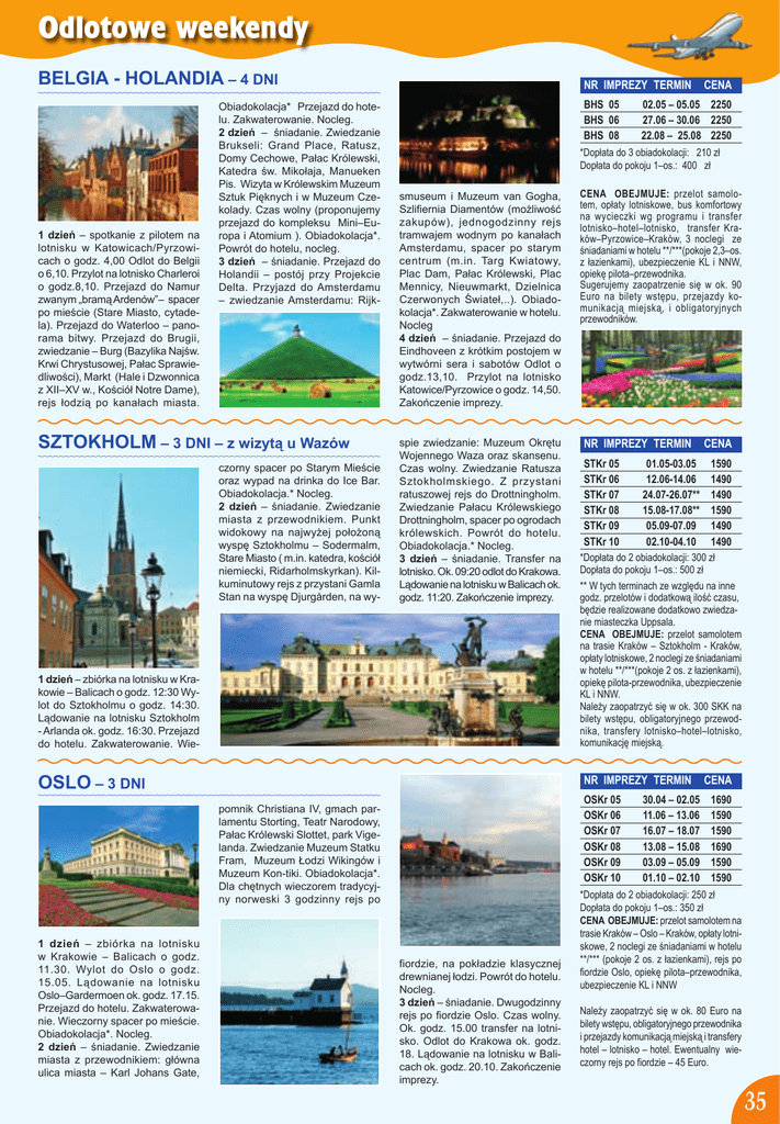 Odlotowe weekendy BELGIA - HOLANDIA – 4 DNI 1 dzień – spotkanie z pilotem na lotnisku w Katowicach/Pyrzowicach o godz. 4,00 Odlot do Belgii o 6,10. Przylot na lotnisko Charleroi o godz.8,10. Przejazd do Namur zwanym „bramą Ardenów”– spacer po mieście (Stare Miasto, cytadela). Przejazd do Waterloo – panorama bitwy. Przejazd do Brugii, zwiedzanie – Burg (Bazylika Najśw. Krwi Chrystusowej, Pałac Sprawiedliwości), Markt (Hale i Dzwonnica z XII–XV w., Kościół Notre Dame), rejs łodzią po kanałach miasta. Obiadokolacja* Przejazd do hotelu. Zakwaterowanie. Nocleg. 2 dzień – śniadanie. Zwiedzanie Brukseli: Grand Place, Ratusz, Domy Cechowe, Pałac Królewski, Katedra św. Mikołaja, Manueken Pis. Wizyta w Królewskim Muzeum Sztuk Pięknych i w Muzeum Czekolady. Czas wolny (proponujemy przejazd do kompleksu Mini–Europa i Atomium ). Obiadokolacja*. Powrót do hotelu, nocleg. 3 dzień – śniadanie. Przejazd do Holandii – postój przy Projekcie Delta. Przyjazd do Amsterdamu – zwiedzanie Amsterdamu: Rijk- SZTOKHOLM – 3 DNI – z wizytą u Wazów czorny spacer po Starym Mieście oraz wypad na drinka do Ice Bar. Obiadokolacja.* Nocleg. 2 dzień – śniadanie. Zwiedzanie miasta z przewodnikiem. Punkt widokowy na najwyżej położoną wyspę Sztokholmu – Sodermalm, Stare Miasto ( m.in. katedra, kościół niemiecki, Ridarholmskyrkan). Kilkuminutowy rejs z przystani Gamla Stan na wyspę Djurgården, na wy- NR IMPREZY TERMIN CENA BHS 05 BHS 06 BHS 08 *Dopłata do 3 obiadokolacji: 210 zł Dopłata do pokoju 1–os.: 400 zł smuseum i Muzeum van Gogha, Szlifiernia Diamentów (możliwość zakupów), jednogodzinny rejs tramwajem wodnym po kanałach Amsterdamu, spacer po starym centrum (m.in. Targ Kwiatowy, Plac Dam, Pałac Królewski, Plac Mennicy, Nieuwmarkt, Dzielnica Czerwonych Świateł,..). Obiadokolacja*. Zakwaterowanie w hotelu. Nocleg 4 dzień – śniadanie. Przejazd do Eindhoveen z krótkim postojem w wytwórni sera i sabotów Odlot o godz.13,10. Przylot na lotnisko Katowice/Pyrzowice o godz. 14,50. Zakończenie imprezy. spie zwiedzanie: Muzeum Okrętu Wojennego Waza oraz skansenu. Czas wolny. Zwiedzanie Ratusza Sztokholmskiego. Z przystani ratuszowej rejs do Drottningholm. Zwiedzanie Pałacu Królewskiego Drottningholm, spacer po ogrodach królewskich. Powrót do hotelu. Obiadokolacja.* Nocleg. 3 dzień – śniadanie. Transfer na lotnisko. Ok. 09:20 odlot do Krakowa. Lądowanie na lotnisku w Balicach ok. godz. 11:20. Zakończenie imprezy. 1 dzień – zbiórka na lotnisku w Krakowie – Balicach o godz. 12:30 Wylot do Sztokholmu o godz. 14:30. Lądowanie na lotnisku Sztokholm - Arlanda ok. godz. 16:30. Przejazd do hotelu. Zakwaterowanie. Wie- OSLO – 3 DNI CENA OBEJMUJE: przelot samolotem, opłaty lotniskowe, bus komfortowy na wycieczki wg programu i transfer lotnisko–hotel–lotnisko, transfer Kraków–Pyrzowice–Kraków, 3 noclegi ze śniadaniami w hotelu **/***(pokoje 2,3–os. z łazienkami), ubezpieczenie KL i NNW, opiekę pilota–przewodnika. Sugerujemy zaopatrzenie się w ok. 90 Euro na bilety wstępu, przejazdy komunikacją miejską, i obligatoryjnych przewodników. NR IMPREZY TERMIN CENA STKr 05 STKr 06 STKr 07 STKr 08 STKr 09 STKr 10 01.05-03.05 12.06-14.06 24.07-26.07** 15.08-17.08** 05.09-07.09 02.10-04.10 1590 1490 1490 1590 1490 1490 *Dopłata do 2 obiadokolacji: 300 zł Dopłata do pokoju 1–os.: 500 zł ** W tych terminach ze względu na inne godz. przelotów i dodatkową ilość czasu, będzie realizowane dodatkowo zwiedzanie miasteczka Uppsala. CENA OBEJMUJE: przelot samolotem na trasie Kraków – Sztokholm - Kraków, opłaty lotniskowe, 2 noclegi ze śniadaniami w hotelu **/***(pokoje 2 os. z łazienkami), opiekę pilota-przewodnika, ubezpieczenie KL i NNW. Należy zaopatrzyć się w ok. 300 SKK na bilety wstępu, obligatoryjnego przewodnika, transfery lotnisko–hotel–lotnisko, komunikację miejską. NR IMPREZY TERMIN CENA OSKr 05 OSKr 06 OSKr 07 OSKr 08 OSKr 09 OSKr 10 pomnik Christiana IV, gmach parlamentu Storting, Teatr Narodowy, Pałac Królewski Slottet, park Vigelanda. Zwiedzanie Muzeum Statku Fram, Muzeum Łodzi Wikingów i Muzeum Kon-tiki. Obiadokolacja*. Dla chętnych wieczorem tradycyjny norweski 3 godzinny rejs po 1 dzień – zbiórka na lotnisku w Krakowie – Balicach o godz. 11.30. Wylot do Oslo o godz. 15.05. Lądowanie na lotnisku Oslo–Gardermoen ok. godz. 17.15. Przejazd do hotelu. Zakwaterowanie. Wieczorny spacer po mieście. Obiadokolacja*. Nocleg. 2 dzień – śniadanie. Zwiedzanie miasta z przewodnikiem: główna ulica miasta – Karl Johans Gate, 02.05 – 05.05 2250 27.06 – 30.06 2250 22.08 – 25.08 2250 fiordzie, na pokładzie klasycznej drewnianej łodzi. Powrót do hotelu. Nocleg. 3 dzień – śniadanie. Dwugodzinny rejs po fiordzie Oslo. Czas wolny. Ok. godz. 15.00 transfer na lotnisko. Odlot do Krakowa ok. godz. 18. Lądowanie na lotnisku w Balicach ok. godz. 20.10. Zakończenie imprezy. 30.04 – 02.05 11.06 – 13.06 16.07 – 18.07 13.08 – 15.08 03.09 – 05.09 01.10 – 02.10 1690 1590 1590 1690 1590 1590 *Dopłata do 2 obiadokolacji: 250 zł Dopłata do pokoju 1–os.: 350 zł CENA OBEJMUJE: przelot samolotem na trasie Kraków – Oslo – Kraków, opłaty lotniskowe, 2 noclegi ze śniadaniami w hotelu **/*** (pokoje 2 os. z łazienkami), rejs po fiordzie Oslo, opiekę pilota–przewodnika, ubezpieczenie KL i NNW Należy zaopatrzyć się w ok. 80 Euro na bilety wstępu, obligatoryjnego przewodnika i przejazdy komunikacją miejską i transfery hotel – lotnisko – hotel. Ewentualny wieczorny rejs po fiordzie – 45 Euro. 35