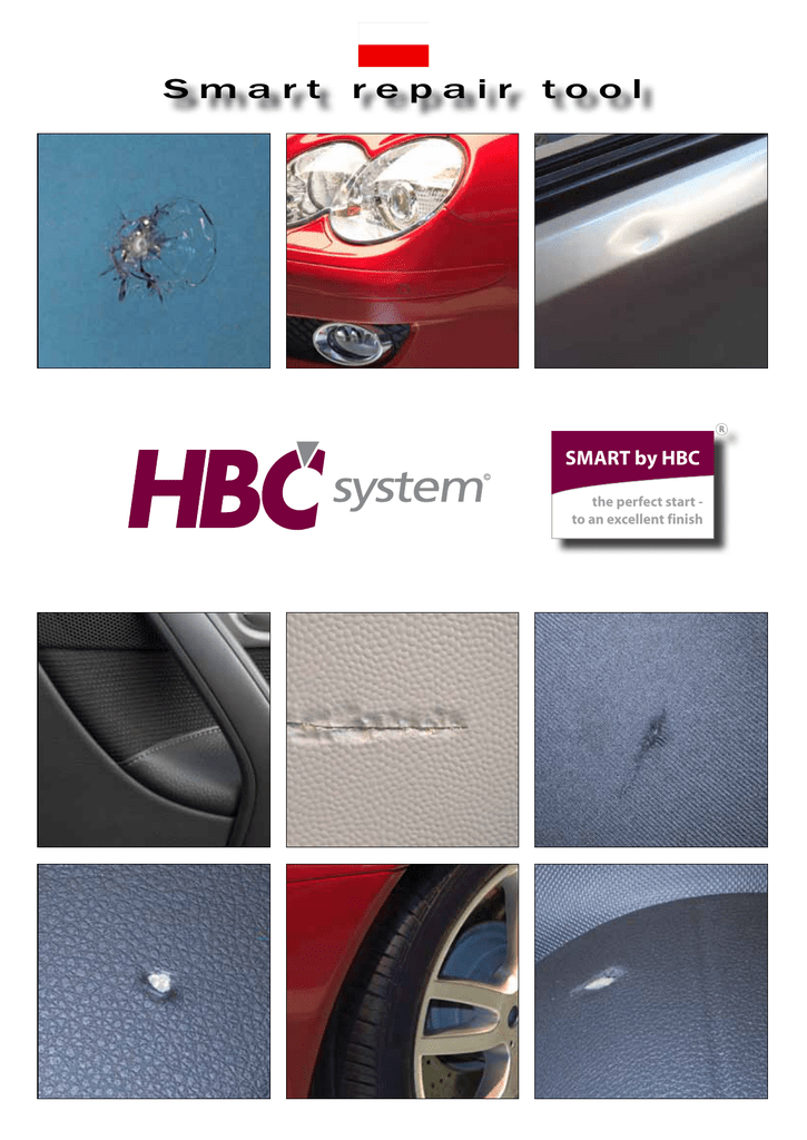 Smart repair tool SMART by HBC the perfect start to an excellent finish Tr e n i n g c z y n i m i s t r z a Szkolenie jest ważnym elementem nowego wyposażenia i jedyną gwarancją, że możliwe będzie pełne wykorzystanie możliwości i zalet zakupionego sprzętu. Organizujemy specjalistyczne szkolenia na całym świecie. W celu uzyskania szczegółowych informacji prosimy skontaktować się z lokalnym Partnerem HBC HBC System „Pakiet Startowy” • Instrukcje użytkowania • Instrukcje BHP • Instrukcje „krok po kroku” • Prezentacje wideo Do wszystkich systemów dołączony jest CD – ROM „Pakiet Startowy”, aby zapewnić dostęp do wszystkich niezbędnych informacji już od pierwszego dnia użytkowania. CD –ROM zawiera instrukcje BHP i użytkowania z pełnym opisem wszystkich etapów procesu jak również proste i czytelne diagramy. Instrukcje wideo można również znaleźć w sieci: www.hbc-system.pl Serwis Smart Baner reklamowy Banery reklamowe promujące koncepcję napraw Smart z logiem i identyfikacją Państwa firmy mogą być umieszczone w widocznych miejscach np.: • Recepcja salonu • Recepcja serwisu • Strefa klienta Prezentacja skórzanej tapicerki Wielu klientów nie zdaje sobie sprawy z tego, że uszkodzoną skórzaną tapicerkę. Dzięki prezentacji skórzanej tapicerki od systemu HBC sprawisz, że klienci zobaczą to na własne oczy i zwrócą na to uwagę! Prezentacja skórzanej tapicerki przeznaczona jest do zamontowania na ścianie przy recepcji lub w strefie klienta. Prezentacje dostępne są w brązowym lub czarnym kolorze, rozmiar 25 x 25 cm Mini Szyby Dzięki wyeksponowanej mini szybie systemu HBC klient może zobaczyć jak wygląda naprawiona przednia szyba. Rozmiar szyby pozwala na umieszczenie jej na recepcyjnym biurku. Jest to prosty sposób na zainteresowanie klienta! Rozmiar 25 x 15 cm Trolley All In One Complete Smart Repair Systems, PDR Tools and Slidehammer SMART Repair Trolley XXL Ten w pełni wyposażony wózek do napraw SMART został stworzony z myślą o najwyższej klasy specjalistach. Zawiera wszystkie niezbędne systemy umożliwiając wykonywanie najwyższej jakości usług w dziedzinie napraw SMART. Dziura po papierosie, zniszczona skórzana tapicerka, zarysowany zderzak, odprysk na szybie czy uszkodzona felga – ze SMART Repair Trolley XXL zawsze będziesz miał właściwe rozwiązanie. Smart Repair Trolley XXL zawiera następujące systemy: System A, naprawa materiału System B1, 2, 3 i 4, plastik, skóra i winyl System C naprawy miejscowe System D-pro, naprawy szyby System E3, naprawy felg Wszystkie niezbędne narzędzia takie jak aerograf, pistolet do malowania, mini wagę, pistolet do kleju itd. Zapakowane w solidnej, zamykanej, 6-scio szufladowej szafce na kołach ułatwiających przemieszczanie sprzętu w warsztacie. SMART Repair Trolley XL Smart Repair Trolley XL zawiera następujące systemy: System A, naprawa materiału System B1, 2, 3 i 4, plastik, skóra i winyl System D-pro, naprawy szyby System E3, naprawy felg Wszystkie niezbędne narzędzia takie jak aerograf, pistolet do malowania, mini wagę, pistolet do kleju np. Zapakowane w solidnej, zamykanej, 6-scio szufladowej szafce na kołach ułatwiających przemieszczanie sprzętu w warsztacie. SMART Repair Trolley L SMART Repair Trolley L zawiera następujące systemy: System A, naprawa materiału System B1, 2, 3 i 4, plastik, skóra i winyl System E3, naprawy felg Wszystkie niezbędne narzędzia takie jak aerograf, pistolet do malowania, mini wagę, pistolet do kleju np. Zapakowane w solidnej, zamykanej, 6-scio szufladowej szafce na kołach ułatwiających przemieszczanie sprzętu w warsztacie. Chcąc ułatwić Państwu wejście w świat napraw SMART proponujemy również rozwiązanie polegające na rozpoczęciu biznesu od zakupu modułowego Trolley L (system A, B1-4, C) lub XL (system A, B1-4, C, D-pro). W następnym etapie systemy mogą zostać uzupełnione o brakujące elementy, które umożliwią poszerzenie oferowanego pakietu usług. Czytaj również str. 10 Folder Smart Repair Folder jest wielofunkcyjny i może być używany do przyciągnięcia uwagi i zainteresowania usługami SMART obecnych jak i przyszłych klientów. Można np. wydawać je podczas przekazywania samochodów, wystawić w widocznym miejscu w salonie lub warsztacie, dołączać do poczty lub nawet rozdawać w publicznych miejscach. Poczta bezpośrednia Poinformuj zarówno obecnych jak i byłych klientów o wprowadzeniu nowych usług korzystając ze swojej bazy danych. Do takich listów można dołączyć folder Smart Repair. Fab ri c an d Ve l o u r s Sy s t em Fabric and velours system · System powierzchni materiałowych i welurowych pozwala na naprawy, których efekt końcowy i jakość na pewno wzbudzi zainteresowanie. W standardzie znajduje się 40 różnych włókien, które mogą być mieszane ze sobą w celu uzyskania odpowiedniego koloru. Następnie nakładana jest farba. Końcowym etapem jest impregnacja – dzięki niej naprawiony obszar zostaje zabezpieczony. Part no. 00.307 System A complete SMART by HBC the perfect start to an excellent finish SMART by HBC the perfect start to an excellent finish Carpet Velours Coat “20“ Leather Coat “10“ Vinyl & Plastic Coat “30“ - 100% elastyczna powłoka na wykładziny - Schnie w 5 minut - Próbka koloru na puszkach System dopasowania koloru, powłoka skórzana Oferujemy szeroką gamę aerozoli do barwienia skór. System dopasowania koloru, spray do winylu, miękkiego i twardego plastiku. W niektórych starszych samochodach, dywaniki i inne materiały są trudne do wyczyszczenia. Wypróbuj nowy Carpet and Velour coat spray. Szybko schnie sprawiając, że powierzchnia staje się elastyczna i estetyczna. Oferujemy szeroką gamę aerozoli do malowania winylu, plastiku i włókna szklanego. Linia do wykładzin została stworzona do barwienia wykładzin i innych materiałów w samochodach, ciężarówkach i wszystkich innych mie