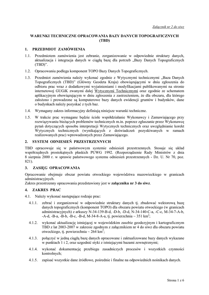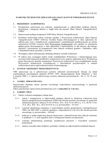 Załącznik nr 2 do siwz WARUNKI TECHNICZNE OPRACOWANIA BAZY DANYCH TOPOGRAFICZNYCH (TBD) 1. PRZEDMIOT ZAMÓWIENIA 1.1. Przedmiotem zamówienia jest zebranie, zorganizowanie w odpowiednie struktury danych, aktualizacja i integracja danych w ciągłą bazę dla potrzeb „Bazy Danych Topograficznych (TBD)”. 1.2. Opracowaniu podlega komponent TOPO Bazy Danych Topograficznych. 1.3. Przedmiot zamówienia naleŜy wykonać zgodnie z Wytycznymi technicznymi „Baza Danych Topograficznych (TBD)” (Główny Geodeta Kraju) obowiązującymi w dniu zgłoszenia do odbioru prac wraz z dodatkowymi wyjaśnieniami i modyfikacjami publikowanymi na stronie internetowej GUGiK zwanymi dalej Wytycznymi Technicznymi oraz zgodnie ze schematem aplikacyjnym obowiązującym w dniu zgłoszenia z zastrzeŜeniem, Ŝe dla obszaru, dla którego załoŜono i prowadzone są komputerowe bazy danych ewidencji gruntów i budynków, dane o budynkach naleŜy pozyskać z tych baz. 1.4. Wymagany zakres informacyjny definiują niniejsze warunki techniczne. 1.5. W trakcie prac wymagane będzie ścisłe współdziałanie Wykonawcy i Zamawiającego przy rozwiązywaniu bieŜących problemów technicznych m.in. poprzez zgłaszanie przez Wykonawcę pytań dotyczących sposobu interpretacji Wytycznych technicznych oraz uwzględnianie korekt Wytycznych technicznych (wynikających z doświadczeń pozyskiwanych w ramach realizowanych prac) wprowadzonych przez Zamawiającego. 2. SYSTEM ODNIESIEŃ PRZESTRZENNYCH TBD opracowuje się w państwowym systemie odniesień przestrzennych. Stosuje się układ współrzędnych prostokątnych płaskich PUWG 1992. (Rozporządzenie Rady Ministrów z dnia 8 sierpnia 2000 r. w sprawie państwowego systemu odniesień przestrzennych - Dz. U. Nr 70, poz. 821). 3. ZASIĘG OPRACOWANIA Opracowanie obejmuje obszar powiatu otwockiego województwa mazowieckiego w granicach administracyjnych. Zakres przestrzenny opracowania przedstawiony jest w załączniku nr 3 do siwz. 4. ZAKRES PRAC 4.1. NaleŜy wykonać następujące rodzaje prac: 4.1.1. zebrać i zorganizować w odpowiednie struktury danych tj. zbudować wektorową bazę danych topograficznych (komponent TOPO) dla obszaru powiatu otwockiego (w granicach administracyjnych) z arkuszy N-34-139-B-d, -D-b, -D-d, N-34-140-C-a, -C-c, M-34-7-A-b, -A-d, -B-a, -B-b, -B-c, -B-d, M-34-8-A-a, tj. powierzchnia ~ 351 km2; 4.1.2. wykonać aktualizację istniejącej w wojewódzkim zasobie geodezyjnym i kartograficznym TBD z lat 2003-2007 w zakresie zgodnym z załącznikiem nr 4 do siwz dla obszaru powiatu otwockiego, tj. powierzchnia ~ 264 km2; 4.1.3. połączyć w jedną ciągłą bazę danych opracowane i zaktualizowane bazy danych wykazane w punktach 1 i 2, oraz uzgodnić styki z istniejącymi bazami zewnętrznymi; 4.1.4. wykonać dokumentację przebiegu zasadniczych procesów i wszystkich czynności kontrolnych; 4.1.5. zapisać wszystkie dane źródłowe, pośrednie i finalne na odpowiednich nośnikach danych. Strona 1 z 6 4.2. Szczegółowe zasady pozyskiwania danych oraz strukturę ich zapisu definiują Wytyczne Techniczne z zastrzeŜeniem pkt 1.3. 4.3. W przypadku, gdy na obszarze, o którym mowa w pkt. 4.1.2, lokalizacja przestrzenna budynku nie uległa zmianie, naleŜy pozostawić budynki z ortofotomapy. 4.4. Dla wszystkich budynków nowych i aktualizowanych w zakresie lokalizacji przestrzennej naleŜy wykorzystać bazy egib dla obszarów, dla których prowadzona jest ewidencja gruntów i budynków w postaci numerycznej w wersji obiektowej, dla pozostałych obszarów wykorzystać ortofotomapy.. 4.5. Nie naleŜy generalizować kształtu budynków wnoszonych na podstawie baz egib. 4.6. Dane uzyskane z ortofotomapy i baz egib naleŜy uzupełnić danymi uzyskanymi w trakcie aktualizacji terenowej. 4.7. Wykaz obiektów, jakich zamawiający Ŝąda do wprowadzenia do bazy danych topograficznych definiuje Załącznik nr 4 do siwz. Zawiera on klasy obiektów i atrybuty, które naleŜy pozyskać w ramach realizacji przedmiotu zamówienia. 5. MATERIAŁY ŹRÓDŁOWE Za materiały źródłowe uznaje się: 5.1. Komputerowe bazy danych ewidencji gruntów i budynków prowadzone przez starostę; 5.2. Ortofotomapy uzyskane od Zamawiającego: 5.2.1 dla obszaru nowoopracowywanego ortofotomapa wykonana ze zdjęć lotniczych z 2006 i 2007 r., 5.2.2 dla obszaru opracowanego w latach 2003-2005 ortofotomapa wykonana ze zdjęć lotniczych z 2007 r.; 5.3. Baza Danych Topograficznych dla aglomeracji warszawskiej niezbędne do aktualizacji, integracji danych i uzgodnienia styków; 5.4. Opracowania wielkoskalowe z powiatowego zasobu geodezyjnego i kartograficznego, 5.5. Bazy osnów GEOS (CODGiK), 5.6. Bazy Państwowego Rejestru Granic (CODGiK), 5.7. Bazy Państwowego Rejestru Nazw Geograficznych (CODGIK), 5.8. Rejestry znajdujące się w gminach, które są tworzone w ramach Rozporządzenia Ministra Infrastruktury z dnia 28 października 2004 r. w sprawie numeracji porządkowej nieruchomości, 5.9. Kalki terenów zamkniętych lub oryginały redakcyjne terenów zamkniętych, 5.10. Baza danych Krajowego Rejestru Urzędowego Podziału Terytorialnego Kraju (TERYT) (GUS), 5.11. Baza rejestru zabytków nieruchomych Krajowego Ośrodka Badań i Dokumentacji Zabytków, 5.12. Baza danych komputerowej mapy podziału hydrograficznego Polski IMiGW, 5.13. Baza z identyfikatorami odcinków i węzłów kolejowych (PKP), 5.14. Nazewnictwo Geograficzne Polski Tom I. Hydronimy, Część I Wody płynące, źródła, wodospady – GUGiK 2006, 5.15. Nazewnictwo Geograficzne Polski Tom II. Hydronimy, Część II Wody stojące – GUGiK 2006, 5.16. Mapy leśne, 5.17. Aktualny „Sieciowy rozkład jazdy pociągów PKP”, 5.18. Rozporządzenie Ministra Infrastruktury z dnia 16 lutego 2005 r. w sprawie sposobu numeracji i ewidencji dróg publicznych, obiektów mostowych, tuneli, przepustów i promów oraz rejestru numerów nadanych drogom, obiektom mostowym i tunelom (Dz. U. Nr 67, poz. 582), Strona 2 z 6 5.19. Zarządz