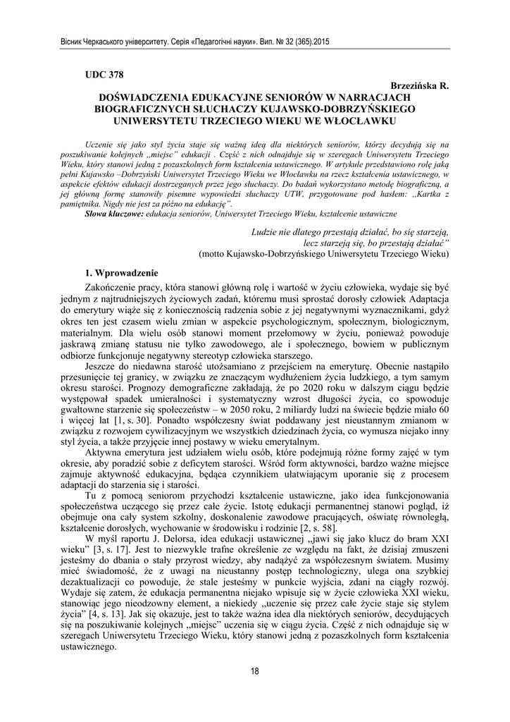 Вісник Черкаського університету. Серія «Педагогічні науки». Вип. № 32 (365).2015 UDC 378 Brzezińska R. DOŚWIADCZENIA EDUKACYJNE SENIORÓW W NARRACJACH BIOGRAFICZNYCH SŁUCHACZY KUJAWSKO-DOBRZYŃSKIEGO UNIWERSYTETU TRZECIEGO WIEKU WE WŁOCŁAWKU Uczenie się jako styl życia staje się ważną ideą dla niektórych seniorów, którzy decydują się na poszukiwanie kolejnych ,,miejsc” edukacji . Część z nich odnajduje się w szeregach Uniwersytetu Trzeciego Wieku, który stanowi jedną z pozaszkolnych form kształcenia ustawicznego. W artykule przedstawiono rolę jaką pełni Kujawsko –Dobrzyński Uniwersytet Trzeciego Wieku we Włocławku na rzecz kształcenia ustawicznego, w aspekcie efektów edukacji dostrzeganych przez jego słuchaczy. Do badań wykorzystano metodę biograficzną, a jej główną formę stanowiły pisemne wypowiedzi słuchaczy UTW, przygotowane pod hasłem: ,,Kartka z pamiętnika. Nigdy nie jest za późno na edukację”. Słowa kluczowe: edukacja seniorów, Uniwersytet Trzeciego Wieku, kształcenie ustawiczne Ludzie nie dlatego przestają działać, bo się starzeją, lecz starzeją się, bo przestają działać” (motto Kujawsko-Dobrzyńskiego Uniwersytetu Trzeciego Wieku) 1. Wprowadzenie Zakończenie pracy, która stanowi główną rolę i wartość w życiu człowieka, wydaje się być jednym z najtrudniejszych życiowych zadań, któremu musi sprostać dorosły człowiek Adaptacja do emerytury wiąże się z koniecznością radzenia sobie z jej negatywnymi wyznacznikami, gdyż okres ten jest czasem wielu zmian w aspekcie psychologicznym, społecznym, biologicznym, materialnym. Dla wielu osób stanowi moment przełomowy w życiu, ponieważ powoduje jaskrawą zmianę statusu nie tylko zawodowego, ale i społecznego, bowiem w publicznym odbiorze funkcjonuje negatywny stereotyp człowieka starszego. Jeszcze do niedawna starość utożsamiano z przejściem na emeryturę. Obecnie nastąpiło przesunięcie tej granicy, w związku ze znaczącym wydłużeniem życia ludzkiego, a tym samym okresu starości. Prognozy demograficzne zakładają, że po 2020 roku w dalszym ciągu będzie występował spadek umieralności i systematyczny wzrost długości życia, co spowoduje gwałtowne starzenie się społeczeństw – w 2050 roku, 2 miliardy ludzi na świecie będzie miało 60 i więcej lat [1, s. 30]. Ponadto współczesny świat poddawany jest nieustannym zmianom w związku z rozwojem cywilizacyjnym we wszystkich dziedzinach życia, co wymusza niejako inny styl życia, a także przyjęcie innej postawy w wieku emerytalnym. Aktywna emerytura jest udziałem wielu osób, które podejmują różne formy zajęć w tym okresie, aby poradzić sobie z deficytem starości. Wśród form aktywności, bardzo ważne miejsce zajmuje aktywność edukacyjna, będąca czynnikiem ułatwiającym uporanie się z procesem adaptacji do starzenia się i starości. Tu z pomocą seniorom przychodzi kształcenie ustawiczne, jako idea funkcjonowania społeczeństwa uczącego się przez całe życie. Istotę edukacji permanentnej stanowi pogląd, iż obejmuje ona cały system szkolny, doskonalenie zawodowe pracujących, oświatę równoległą, kształcenie dorosłych, wychowanie w środowisku i rodzinie [2, s. 58]. W myśl raportu J. Delorsa, idea edukacji ustawicznej ,,jawi się jako klucz do bram XXI wieku” [3, s. 17]. Jest to niezwykle trafne określenie ze względu na fakt, że dzisiaj zmuszeni jesteśmy do dbania o stały przyrost wiedzy, aby nadążyć za współczesnym światem. Musimy mieć świadomość, że z uwagi na nieustanny postęp technologiczny, ulega ona szybkiej dezaktualizacji co powoduje, że stale jesteśmy w punkcie wyjścia, zdani na ciągły rozwój. Wydaje się zatem, że edukacja permanentna niejako wpisuje się w życie człowieka XXI wieku, stanowiąc jego nieodzowny element, a niekiedy ,,uczenie się przez całe życie staje się stylem życia” [4, s. 13]. Jak się okazuje, jest to także ważna idea dla niektórych seniorów, decydujących się na poszukiwanie kolejnych ,,miejsc” uczenia się w ciągu życia. Część z nich odnajduje się w szeregach Uniwersytetu Trzeciego Wieku, który stanowi jedną z pozaszkolnych form kształcenia ustawicznego. 18 Вісник Черкаського університету. Серія «Педагогічні науки». Вип. № 32 (365).2015 2. Działalność Kujawsko-Dobrzyńskiego Uniwersytetu Trzeciego Wieku we Włocławku Przedmiotem moich badań jest Kujawsko-Dobrzyński Uniwersytet Trzeciego Wieku działający przy Kujawskiej Szkole Wyższej we Włocławku. Został powołany na mocy uchwały Senatu uczelni z 16 lipca 2009 roku (Uchwała nr 44/2009), a 5 listopada 2009 roku, odbyła się I inauguracja roku akademickiego. W Regulaminie Uniwersytetu zapisano, że jest pozaszkolną formą kształcenia ustawicznego i działania kulturalno-oświatowego społeczeństwa (rozdział 1, & 1, p.1). Aktywność instytucji opiera się na różnorodnych formach organizacyjno- programowych. Jedną z nich są teoretyczne formy studyjne, które przyjmują postać wykładów, seminariów, odczytów i odbywają się w każdy czwartek, dostarczając seniorom wiedzy z różnych dziedzin, m. in. medycyny, prawa, ekonomii, pedagogiki, psychologii, historii, geografii, religii. Wykłady prowadzone są przez pracowników KSW, jak i osoby z zewnątrz, nierzadko autorytety naukowe. Niezwykle prężnie działają kluby, sekcje i zespoły, w których seniorzy mogą rozwinąć swoje zainteresowania, kształcić umiejętności, uzupełniać wiedzę. Należą do nich: klub dyskusyjny, który spotyka się raz, dwa razy w miesiącu we włocławskiej kawiarni artystycznej ,,Filiżanka bez uszka”, wymieniając poglądy dotyczące ciekawych książek, ostatnio obejrzanych filmów czy sztuk teatralnych a także inicjując wyjścia kulturalne, które potem są przedmiotem debaty; ko