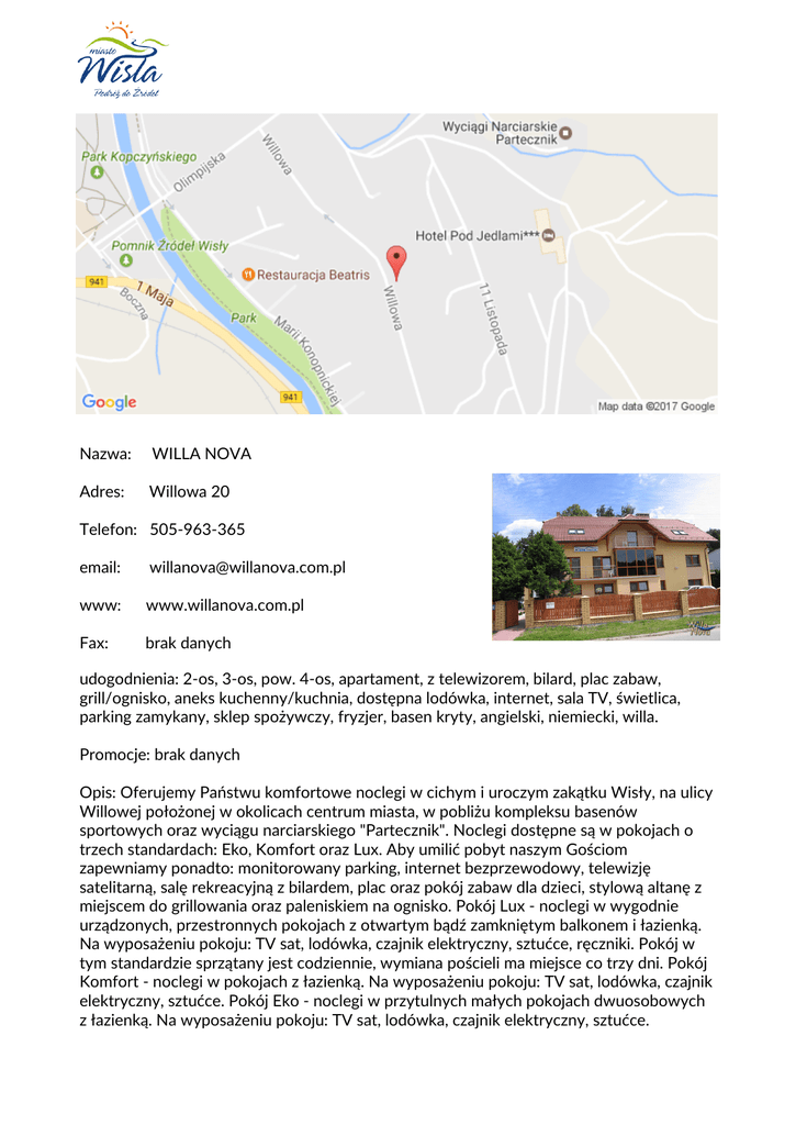 Nazwa: WILLA NOVA Adres: Willowa 20 Telefon: 505-963-365 email: [email protected] www: www.willanova.com.pl Fax: brak danych udogodnienia: 2-os, 3-os, pow. 4-os, apartament, z telewizorem, bilard, plac zabaw, grill/ognisko, aneks kuchenny/kuchnia, dostępna lodówka, internet, sala TV, świetlica, parking zamykany, sklep spożywczy, fryzjer, basen kryty, angielski, niemiecki, willa. Promocje: brak danych Opis: Oferujemy Państwu komfortowe noclegi w cichym i uroczym zakątku Wisły, na ulicy Willowej położonej w okolicach centrum miasta, w pobliżu kompleksu basenów sportowych oraz wyciągu narciarskiego "Partecznik". Noclegi dostępne są w pokojach o trzech standardach: Eko, Komfort oraz Lux. Aby umilić pobyt naszym Gościom zapewniamy ponadto: monitorowany parking, internet bezprzewodowy, telewizję satelitarną, salę rekreacyjną z bilardem, plac oraz pokój zabaw dla dzieci, stylową altanę z miejscem do grillowania oraz paleniskiem na ognisko. Pokój Lux - noclegi w wygodnie urządzonych, przestronnych pokojach z otwartym bądź zamkniętym balkonem i łazienką. Na wyposażeniu pokoju: TV sat, lodówka, czajnik elektryczny, sztućce, ręczniki. Pokój w tym standardzie sprzątany jest codziennie, wymiana pościeli ma miejsce co trzy dni. Pokój Komfort - noclegi w pokojach z łazienką. Na wyposażeniu pokoju: TV sat, lodówka, czajnik elektryczny, sztućce. Pokój Eko - noclegi w przytulnych małych pokojach dwuosobowych z łazienką. Na wyposażeniu pokoju: TV sat, lodówka, czajnik elektryczny, sztućce.