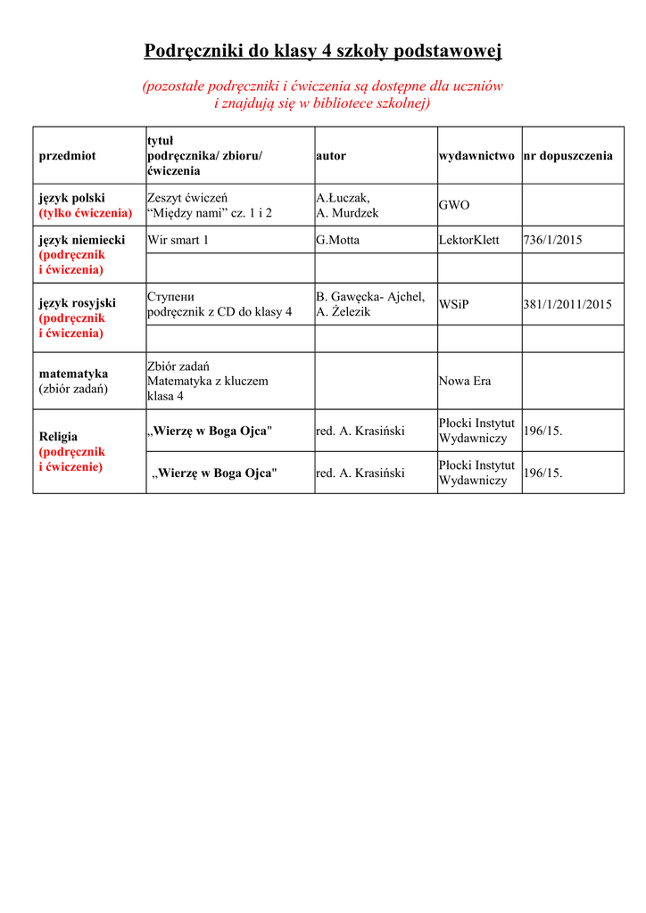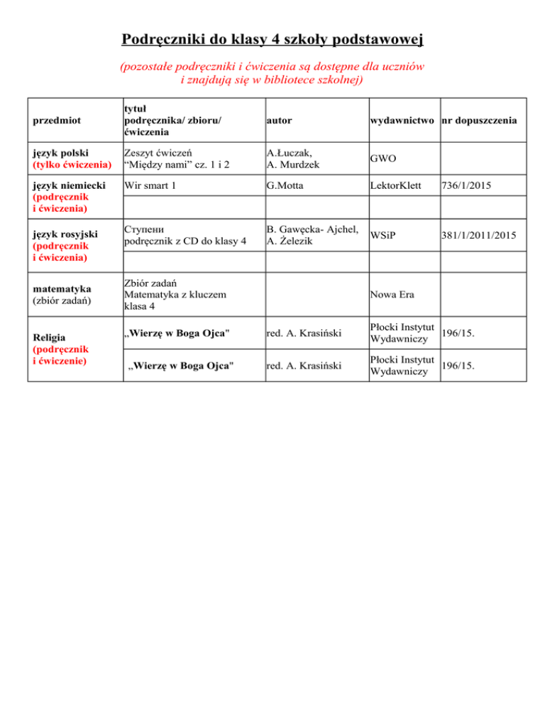 Podręczniki do klasy 4 szkoły podstawowej (pozostałe podręczniki i ćwiczenia są dostępne dla uczniów i znajdują się w bibliotece szkolnej) przedmiot tytuł podręcznika/ zbioru/ ćwiczenia autor wydawnictwo nr dopuszczenia język polski (tylko ćwiczenia) Zeszyt ćwiczeń “Między nami” cz. 1 i 2 A.Łuczak, A. Murdzek GWO język niemiecki (podręcznik i ćwiczenia) Wir smart 1 G.Motta LektorKlett 736/1/2015 język rosyjski (podręcznik i ćwiczenia) Ступени podręcznik z CD do klasy 4 B. Gawęcka- Ajchel, A. Żelezik WSiP 381/1/2011/2015 matematyka (zbiór zadań) Religia (podręcznik i ćwiczenie) Zbiór zadań Matematyka z kluczem klasa 4 „Wierzę w Boga Ojca" „Wierzę w Boga Ojca" Nowa Era red. A. Krasiński Płocki Instytut 196/15. Wydawniczy red. A. Krasiński Płocki Instytut 196/15. Wydawniczy Podręczniki do klasy 5 szkoły podstawowej (pozostałe podręczniki i ćwiczenia są dostępne dla uczniów i znajdują się w bibliotece szkolnej) przedmiot tytuł podręcznika/ ćwiczenia autor język angielski (tylko ćwiczenia) Steps Forward 2 ćwiczenia wersja pełna Tim Falla, Paul A Oxford Davies, Sylvia Wheeldon, Paul Shipton, Ewa Palczak, Magdalena Szpotowicz język niemiecki podręcznik i ćwiczenia Wir smart 2 G.Motta LektorKlett 736/2/2016 język rosyjski podręcznik i ćwiczenia Ступени podręcznik z CD do klasy 5 B. Gawęcka- Ajchel, A. Żelezik WSiP 381/2/2011/2016 Matematyka Zbiór zadań Zbiór zadań Matematyka z kluczem klasa 5 K. Gałązka, H. Jakubowska, J. Janowicz, St. Lisowska, E. Liwska Nowa Era religia (podręcznik i ćwiczenia) „Ufam Synowi Bożemu" red. A. Krasiński Płocki Instytut Wydawniczy 85/16 red. A. Krasiński Płocki Instytut Wydawniczy 85/16 „Ufam Synowi Bożemu" wydawnictwo nr dopuszczenia Podręczniki do klasy 6 szkoły podstawowej przedmiot tytuł podręcznika/ćwiczenia autor Słowa na start! Podręcznik do kształcenia Marlena Derlukiewicz literackiego i kulturowego dla klasy szóstej szkoły podstawowej język polski Słowa na start! Podręcznik do kształcenia językowego dla klasy szóstej szkoły podstawowej. Część 1 i 2. Anna Wojciechowska, Nowa Era Agnieszka Marcinkiewicz 338/6/2014 Tim Falla, Paul A. Davies, Sylvia Wheeldon, Paul Shipton, Ewa Palczak, Magdalena Szpotowicz Oxford 302/3/2011 G.Motta LektorKlett 442/3/2014 WSiP 381/3/2011 Marcin Braun, Agnieszka Mańkowska, Małgorzata Paszyńska Nowa Era 157/4/2011 Marcin Braun, Agnieszka Mańkowska, Małgorzata Paszyńska Nowa Era Kinga Gałązka, Hanna Jakubowska, Jerzy Janowicz, Stanisława Lisowska Nowa Era Grzegorz Wojciechowski Nowa Era Tomasz Maćkowski Nowa Era “Tajemnice przyrody” Joanna Stawarz, Feliks Szlajfer, Hanna Kowalczyk Nowa Era Ćwiczenia cz. 1 i 2 Dominik Marszał, Monika Mochnacz, Joanna Stawarz Nowa Era Steps in english 3 Workbook język niemiecki Wir neu 3 podręcznik i ćwiczenia język rosyjski Ступени B. Gawęcka- Ajchel, podręcznik z ćwiczeniami i CD do A. Żelezik klasy 6 Matematyka z kluczem klasa 6 podręcznik Matematyka z kluczem klasa 6 zeszyt ćwiczeń część 1 i 2 Matematyka z kluczem klasa 6 Zbiór zadań Wczoraj i Dziś klasa 6 Wczoraj i Dziś cz.1 i 2 Przyroda Muzyka 338/5/2014 Oxford język angielski Historia Nowa Era nr dopuszczenia Tim Falla, Paul A. Davies, Sylvia Wheeldon, Paul Shipton, Ewa Palczak, Magdalena Szpotowicz Steps in English 3 Matematyka wydawnictwo kontynuacja podręczników 443/3/2014 399/3/2014 zakupionych w 4 klasie Plastyka W bibliotece szkolnej Zajęcia komputerowe W bibliotece szkolnej Zajęcia techniczne W bibliotece szkolnej „Przemienieni przez Boga" religia Przemienieni przez Boga" red. Z. Marek Wydawnictwo WAM, Kraków; red. A. Banasiak , L. Łasek , A. Walulik Wydawnictwo WAM, Kraków; 437/2004