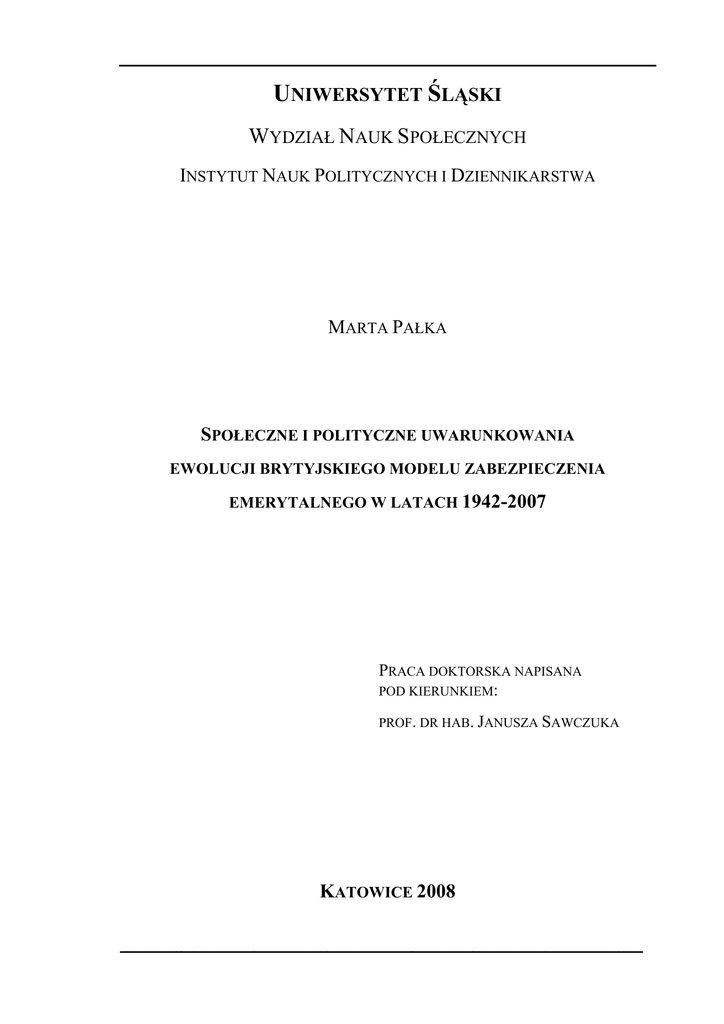 UNIWERSYTET ŚLĄSKI WYDZIAŁ NAUK SPOŁECZNYCH INSTYTUT NAUK POLITYCZNYCH I DZIENNIKARSTWA MARTA PAŁKA SPOŁECZNE I POLITYCZNE UWARUNKOWANIA EWOLUCJI BRYTYJSKIEGO MODELU ZABEZPIECZENIA EMERYTALNEGO W LATACH 1942-2007 PRACA DOKTORSKA NAPISANA POD KIERUNKIEM: PROF. DR HAB. JANUSZA SAWCZUKA KATOWICE 2008 ___________________________________________ 1 SPIS TREŚCI Wprowadzenie ………………………………………………………………….. Rozdział I: 6 Zabezpieczenie społeczne i zabezpieczenie emerytalne w teorii polityki społecznej ………………………..………...…………… 18 1. Podstawowe założenia zabezpieczenia społecznego …………………….. 18 1.1. Pojęcie zabezpieczenia społecznego ………………………….….. 18 1.2. Techniki zabezpieczenia społecznego …………………………… 21 2. Zabezpieczenie emerytalne – podstawowe pojęcia …………………….... 24 3. Granica wieku emerytalnego …………………………………………….. 26 4. Strategie zabezpieczenia emerytalnego a modele i rodzaje systemów emerytalnych ………………………………………………………….….. 28 4.1. Rodzaje publicznych systemów emerytalnych …………………... 28 4.2. Modele emerytalne według kryteriów uzyskiwania prawa do emerytury ……………………………………………………... 30 4.3. Systemy emerytalne według metody ich tworzenia ……………… 31 5. Trójfilarowy model emerytalny ………………………………………….. 33 6. Podsumowanie – cele polityki emerytalnej ……………………………… 35 Rozdział II: Geneza i ewolucja systemu zaopatrzenia społecznego .………. 37 1. Rozwój historyczny zabezpieczenia społecznego w Wielkiej Brytanii ….. 37 1.1. Okres feudalizmu i początki brytyjskiego kapitalizmu ……….….. 37 1.2. Zabezpieczenie społeczne w okresie rewolucji przemysłowej …... 46 2. Państwowy system emerytalny w Wielkiej Brytanii – historia, zasady i funkcje ………………………………………………………………….. 58 2.1. Ustawa o emeryturach starczych z 1908 r. ……..………………. 61 2.2. Ustawa National Insurance Act z 1911 r. ……………………….. 63 2.3. Ustawa o emeryturach składkowych z 1925 r. ………………….. 2.4. Ustawa Old Age and Widows’ Pension Act z 1940 r. ……………. 70 69 3. Kształtowanie się systemu zaopatrzenia społecznego w wybranych państwach europejskich ………………...………………………………... 72 3.1. Model niemiecki ……………………………………………….…. 74 3.2. Rozwój ubezpieczeń społecznych w innych krajach Europy …….. 77 4. Okres reform i kształtowania się państwa dobrobytu w Wielkiej Brytanii.. 86 2 Rozdział III: Kształtowanie się systemu ubezpieczeń społecznych w Wielkiej Brytanii po II wojnie światowej …….……………... 91 1. Raport Beveridge’a z 1942 roku – geneza powstania dokumentu ……….. 91 2. Forma i treść Raportu …………………………………………………….. 94 3. Część V Raportu – Plan zabezpieczenia społecznego …..…..……….…... 107 3.1. System ubezpieczeń społecznych ………………………………... 107 3.2. Wysokość świadczeń i składek ubezpieczeniowych …………….. 113 3.3. Pomoc społeczna ………………………………………………… 116 3.4. Ubezpieczenia dobrowolne ………………………………………. 117 3.5. Administracja zabezpieczenia społecznego ……………………… 118 4. Pozostałe warunki niezbędne do realizacji Planu zabezpieczenia społecznego ………………………………………………………………. 119 4.1. Zasiłki rodzinne …………………………………………………... 120 4.2. Ochrona zdrowia i rehabilitacja …………………………………. 122 4.3. Przeciwdziałanie bezrobociu …………………………………….. 123 5. Reakcje na Plan zabezpieczenia społecznego przedstawiony w Raporcie 124 6. Realizacja założeń Planu zabezpieczenia społecznego …………………. 127 6.1. Ustawodawstwo socjalne w latach 1944-1948 …………………....128 6.1.1. Ustawa o ubezpieczeniach społecznych na wpadek chorób zawodowych i wypadków przy pracy ……………. 130 6.1.2. Ustawa o ubezpieczeniach społecznych …………………. 131 6.1.3. Ustawa o narodowej ochronie zdrowia …………………... 134 6.1.4. Ustawa o narodowej pomocy społecznej ………………… 135 6.2. Ustawodawstwo socjalne w latach 1948-1979 …………………....136 6.2.1. Emerytury stopniowalne …………………………………. 138 6.2.2. Kolejne zmiany w zabezpieczeniu społecznym ………….. 140 7. Ocena Planu przedstawionego w Raporcie Beveridge’a i jego odbiór społeczny …………………………………………………………. 144 Rozdział IV: System zabezpieczenia emerytalnego w Wielkiej Brytanii ….... 148 1. Legislacja w latach 1975-1985 ………………………………………….... 148 1.1. Emerytury powiązane z wynagrodzeniem oraz ich prywatyzacja 148 1.2. Składki ……………………………………………………………. 150 1.3. Waloryzacja świadczeń …………….…………………………….. 152 2. Ustawa o zabezpieczeniu społecznym z 1986 roku …………………….... 153 3 3. Zasady funkcjonowania systemów emerytur zakładowych i indywidualnych ……………………………………………………….… 155 3.1. Przesłanki rozwoju zakładowych i indywidualnych systemów emerytalnych ……………………………………………………... 155 3.2. Funkcjonowanie systemów emerytur zakładowych i indywidualnych ……………………………………………….… 157 3.3. Metody finansowania …………………………………