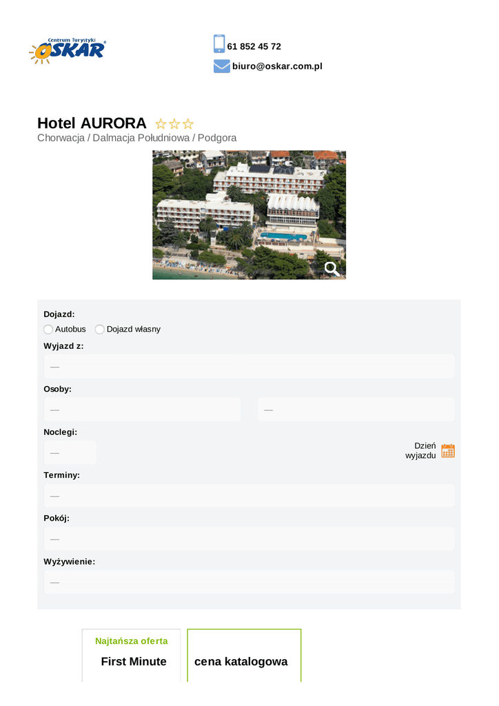 61 852 45 72 [email protected] Hotel AURORA Chorwacja / Dalmacja Południowa / Podgora Dojazd: Autobus Dojazd własny Wyjazd z: Osoby: Noclegi: Dzień wyjazdu Terminy: Pokój: Wyżywienie: Najtańsza oferta First Minute cena katalogowa do 5 marca 2017: 1108,20 zł do 5 marca 2017: 1108,20 zł do 3 sierpnia 2017: 2585,80 zł do 3 sierpnia 2017: 2585,80 zł Suma:3694,00 Suma: zł 3694,00 zł Opis oferty Miejscowość Atuty Wycieczki bliskość plaży fakultatywne bliskość centrum aperitif bar, bar przy basenie Opinie pokoje z widokiem na morze lub góry winda basen z tarasem słonecznym brodzik dla dzieci bezpłatna klimatyzacja bezpłatny Internet WiFi Położenie Położony na Riwierze Makarskiej w miejscowości Podgora, komfortowy hotel z basenem. Doskonałe miejsce na wypoczynek w jednej z najbardziej malowniczych miejscowości tego regionu. Jasny żwirek na plaży, turkusowozielony kolor morza, ukwiecona promenada z kolorowymi łódkami w porcie to tylko niektóre z atutów przyciągających turystów do wymarzonych wakacji w Hotelu Aurora! Basen z tarasem słonecznym, bar, brodzik dla dzieci i piękna plaża to idealny sposób na spędzenie niezapomnianych chwil! Zakwaterowanie Pokoje dwuosobowe z możliwością dostawki z widokiem na morze lub na góry. Dostępne opcje zakwaterowania pokój 2 osobowy pokój 2 osobowy z możliwością dostawki Dostępne opcje wyżywienia śniadania i obiadokolacje w formie bufetu Pakiet KOMFORT gwarancja wyboru miejsca w autokarze napoje w autokarze w cenie (6 x do wyboru: kawa, herbata, zimny napój 0,2l) cena: 50 zł/os Pakiet PRESTIGE gwarancja wyboru miejsca w autokarze napoje w autokarze w cenie (6 x do wyboru: kawa, herbata, zimny napój 0,2l) pierwszeństwo wejścia na pokład autokaru nadbagaż 5 kg w cenie suchy prowiant na drogę powrotną cena: 100 zł/os Karta Dużej Rodziny www.oskar.com.pl/zalaczniki/karta_duzej_rodziny Warunki promocji FIRST MINUTE www.oskar.com.pl/zalaczniki/warunki_promocji Ubezpieczenie Warunki ubezpieczenia Bezpieczne Podróże Signal Iduna dokument do pobrania www.oskar.com.pl/zalaczniki/owu Warunki ubezpieczenia Kosztów Imprezy Turystycznej Signal Iduna dokument do pobrania www.oskar.com.pl/zalaczniki/owurg Turystyczny Fundusz Gwarancyjny W związku z powołaniem do życia w dniu 26.11.2016 Turystycznego Funduszu Gwarancyjnego każdy klient Biura Podróży Oskar zobowiązany jest do zapłaty kwoty w wysokości 10zł/os. przy każdorazowej rezerwacji imprezy turystycznej (obowiązuje od dnia 26.11.2016). Kwota przeznaczona na Turystyczny Fundusz Gwarancyjny zostanie automatycznie doliczona do wartości rezerwacji (w momencie jej dokonania). Wyjątkiem są imprezy turystyczne odbywające się w krajach posiadających granicę z Rzeczpospolitą Polską. Składka nie jest przychodem biura. Udogodnienia Widok na morze Klimatyzacja Regulowane fotele Tacki Multimedia Nowoczesna flota Zawodowy kierowca Pasy bezpieczeństwa Toaleta w autokarze Podnóżki Dla rodzin z dziećmi Wi-Fi Basen kryty Winda Bez paszportu Blisko plaży Basen odkryty Restauracja hotelowa Region nadmorski Program ramowy Dzień 1 Wyjazd z Polski zgodnie z rozkładem jazdy autokarów. Przejazd przez Czechy, Słowację, Węgry. Dzień 2 Przyjazd do Podgory w godzinach przedpołudniowych. Czas wolny. Zakwaterowanie od godz. 12:00. Dzień 3-8 Pobyt na miejscu. Możliwość korzystania z dodatkowych wycieczek fakultatywnych, np. Dubrownik, Split i Trogir, Park Narodowy Krka, Jeziora Plitvickie, Medugorije + Mostar, Rejs statkiem na Hvar i Brac - Fish Picnic, Park Przyrody Biokovo. Dzień 9 Wykwaterowanie do godziny 09:00. Czas wolny. Wyjazd do Polski w godzinach popołudniowych (ok. godz. 15:00). Przejazd przez Węgry, Słowację, Czechy. Dzień 10 Przyjazd do Polski. Orientacyjne godziny powrotu do poszczególnych miast zgodnie z rozkładem jazdy autokarów. Cena obejmuje przejazd autokarem klasy LUX (klimatyzacja, cafe - bar, DVD, WC) zakwaterowanie: 7 noclegów w Hotelu AURORA opiekę pilota w czasie podróży opieka rezydenta na miejscu wyżywienie HB: śniadania i obiadokolacje ubezpieczenie KL 10000 euro, NNW 10000 zł, bagaż (utrata 500 zł) Cena nie obejmuje Dopłaty wymagane na miejscu opłata klimatyczna 8 euro/os; dzieci do 12 lat płacą 50% - płatne u pilota w autokarze Dopłaty opcjonalne ubezpieczenie od chorób przewlekłych i nowotworowych KL 20000 euro, NNW 10000 zł, bagaż (utrata 500 zł): 140 zł/os ubezpieczenie od kosztów rezygnacji: 3,5% wartości rezerwacji Informacje dodatkowe dokumenty: paszport lub dowód osobisty (zgodnie z obowiązującymi przepisami) zaleca się wyrobienie karty EKUZ Chcesz wiedzieć szybciej? Polub nas na facebooku Wycieczki fakultatywne 35 € /os. Park Przyrody Biokovo 75 € /os. Park Narodowy Jeziora Plitvickie 40 € /os. Dubrownik OSKAR Sp. z o.o. pl.Wolności 2/4c, 61-738 Poznań Potrzebujesz pomocy? Zadzwoń lub napisz: 61 852 45 72 [email protected] 40 € /os. Split + Trogir 50 € /os. Park Narodowy Wodospady Rzeki Krka + Sibenik Zadzwoń Projekt i wdrożenie: Simply User