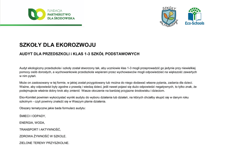 SZKOŁY DLA EKOROZWOJU AUDYT DLA PRZEDSZKOLI i KLAS 1-3 SZKÓŁ PODSTAWOWYCH Audyt ekologiczny przedszkola i szkoły został stworzony tak, aby uczniowie klas 1-3 mogli przeprowadzić go jedynie przy niewielkiej pomocy osób dorosłych, a wychowankowie przedszkola wspierani przez wychowawców mogli odpowiedzieć na większość zawartych w nim pytań. Może on zastosowany w tej formie, w jakiej został przygotowany lub można do niego dodawać własne pytania, zadania dla dzieci. Ważne, aby odpowiedzi były zgodne z prawdą i wiedzą dzieci, jeśli nawet pojawi się dużo odpowiedzi negatywnych, to tylko znak, że podejmujecie właśnie dobry krok aby zmienić Wasze otoczenie na bardziej przyjazne środowisku i dzieciom. Eko-Komitet powinien wykorzystać wyniki audytu do wyboru działania lub działań, na których chciałby skupić się w danym roku szkolnym - czyli powinny znaleźć się w Waszym planie działania. Obszary tematyczne jakie bada formularz audytu: ŚMIECI I ODPADY, ENERGIA, WODA, TRANSPORT I AKTYWNOŚĆ, ZDROWA ŻYWNOŚĆ W SZKOLE. ZIELONE TERENY PRZYSZKOLNE. LEGENDA: Znak ten wskazuje, że odpowiedź na to pytanie uczniowie mogą odnaleźć samodzielnie obserwując otoczenie swojej szkoły lub przedszkola. Na niektóre z tych pytań będą potrzebowali W przypadku tego rodzaju pytań, być może potrzebne będzie przepytanie większej liczby dzieci o zdanie lub ich wiedzę, czy zachowania. Te pytania dotyczą mierzenia Waszego wpływu na środowisko i dają Wam możliwość pokazania, jakie postępy udało się Wam osiągnąć. Jeśli przy Waszej odpowiedzi znajduje się uśmiechnięta buźka - jesteście w tym aspekcie szkołą przyjazną środowisku i dzieciom Jeśli przy Waszej odpowiedzi znajduje się smutna buźka - jeszcze w tym aspekcie możecie popracować, aby być szkołą bardziej przyjazną środowisku i dzieciom ŚMIECI I ŚMIECENIE Zastanowimy się i sprawdźmy, czy nasza szkoła i teren wokół niej jest czysty i czy wszyscy wiemy gdzie wyrzucać nasze śmieci? Czy na podłodze w szkole możecie znaleźć jakieś śmieci? NIE Czy na zewnątrz - wokół szkoły możecie znaleźć jakieś śmieci pozostawione na ziemi? NIE Czy w czasie zabawy, po zabawie, wszystkie dzieci wyrzucają swoje śmieci do kosza? TAK Czy któryś z koszy na śmieci w szkole jest przepełniony? Czy wszyscy w Waszej szkole wiedzą, dlaczego należy wyrzucać śmieci w odpowiednie miejsce (do kosza, odpowiednich pojemników)? NIE TAK TAK TAK NIE TAK NIE ODPADY - ograniczanie, ponowne wykorzystanie i recykling Czy większość uczniów przynosi swoje drugie śniadanie w opakowaniu, które można ponownie użyć (np. pudełko śniadaniowe)? TAK Czy nauczyciele i wychowawcy drukują i kserują dokumenty dwustronnie (obie strony są zadrukowane) kiedy to tylko możliwe? TAK Czy używacie drugiej strony papieru (zadrukowanego jednostronnie) do rysunków, notatek, itp. zanim trafi do kosza? TAK Czy w toalecie szkolnej używany jest papier z recyklingu? Czy w szkole organizowane są wymiany lub giełdy używanych książek, gier, filmów, itp.? TAK TAK NIE NIE NIE NIE NIE Czy w koszach do sortowania śmieci zawsze znajdują się odpowiednie odpady? Czy w Waszej szkole znajduje się kompost? Czy osoby gotujące w szkolnej kuchni wyrzucają odpady po warzywach i owocach na kompost? Czy wiecie co dzieje się z odpadami, które trafiły do recyklingu? Czy wiecie co dzieje się ze śmieciami, które trafiły do zwykłego kosza na śmieci? Czy szkoła używa poczty elektronicznej (e-mail) do kontaktu z rodzicami? TAK TAK TAK TAK TAK TAK NIE NIE NIE NIE NIE NIE ENERGIA Czy światło jest zawsze wyłączane, kiedy klasa jest pusta? Czy światło jest gaszone jeśli w klasie jest wystarczająco słonecznie? Czy sprawdzacie, czy wszystkie światła i komputery są wyłączone np. w czasie długiej przerwy lub po lekcjach? Czy okna i drzwi są zamykane kiedy ogrzewanie jest włączone? Czy zasłony, firanki w czasie ogrzewania zasłaniają kaloryfer? TAK TAK TAK TAK NIE NIE NIE NIE NIE TAK WODA Czy z któregoś kranu cieknie/kapie woda po zakręceniu? Czy zdarza się, że ktoś pozostawia włączoną wodę w łazience i wychodzi? Czy spłuczka posiada funkcję start-stop lub ma dwudzielny przycisk? NIE NIE TAK Jeśli nie - to czy w spłuczkach znajduje się ogranicznik spłukiwanej wody? (specjalne opakowanie lub plastikowa butelka napełniona wodą) TAK Czy na zewnątrz szkoły znajduje się zbiornik lub zbiorniki na wodę deszczową? (wykorzystywaną później np. do podlewania kwiatów) TAK TAK TAK NIE NIE NIE Czy wiecie, czy w Waszej miejscowości można pić bezpiecznie wodę z kranu? Czy wiecie dlaczego tak ważne jest oszczędzanie wody? TAK TAK NIE NIE TRANSPORT i AKTYWNOŚĆ Czy droga piesza do Twojej szkoły jest bezpieczna? Czy do Twojej szkoły można dojechać bezpiecznie na rowerze? (np. ścieżkami rowerowymi) Czy przed szkołą znajdują się stojaki rowerowe dla rodziców i uczniów? Czy codziennie w szkole macie ćwiczenia ruchowe? Czy w roku szkolnym są dni, w których zachęcacie jak największą liczbę dzieci do przyjścia pieszo do szkoły? TAK TAK TAK TAK TAK NIE NIE NIE NIE NIE Czy w szkole organizowane są wspólne piesze wycieczki? Czy rano i na koniec lekcji, przed szkołą znajduje się duża liczba zaparkowanych samochodów? Czy w szkole prowadzone są zajęcia jak bezpiecznie jeździć na rowerze? TAK NIE TAK Czy badacie, ilu uczniów podwozi samochodem jeden rodzic? (np. rodzice podwożą dzieci sąsiadów) TAK Czy w szkole liczycie co jakiś czas ile osób dojeżdża do szkoły rowerem lub chodzi pieszo? TAK Czy rodzice czekający w samochodzie na dzieci, wyłączają silnik w zaparkowanym samochodzie? TAK Czy wszystkie dzieci wiedzą jak bezpiecznie przechodzić przez ulicę? TAK NIE TAK NIE NIE NIE NIE NIE ZDROWA ŻYWNOŚĆ W SZKOLE Czy każdego dnia jecie owoce (np. w trakcie przerwy, po obiedzie)? Czy do szkolnego obiadu serwowana jest sałatka/warzywa? Czy możl