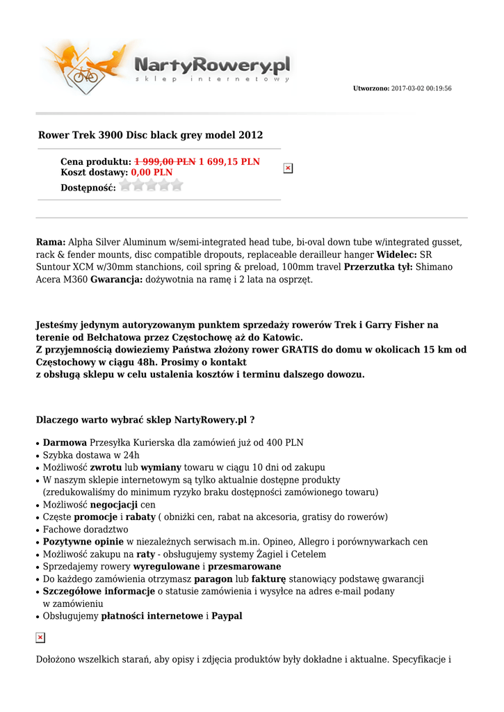 Utworzono: 2017-03-02 00:19:56 Rower Trek 3900 Disc black grey model 2012 Cena produktu: 1 999,00 PLN 1 699,15 PLN Koszt dostawy: 0,00 PLN Dostępność: Rama: Alpha Silver Aluminum w/semi-integrated head tube, bi-oval down tube w/integrated gusset, rack & fender mounts, disc compatible dropouts, replaceable derailleur hanger Widelec: SR Suntour XCM w/30mm stanchions, coil spring & preload, 100mm travel Przerzutka tył: Shimano Acera M360 Gwarancja: dożywotnia na ramę i 2 lata na osprzęt. Jesteśmy jedynym autoryzowanym punktem sprzedaży rowerów Trek i Garry Fisher na terenie od Bełchatowa przez Częstochowę aż do Katowic. Z przyjemnością dowieziemy Państwa złożony rower GRATIS do domu w okolicach 15 km od Częstochowy w ciągu 48h. Prosimy o kontakt z obsługą sklepu w celu ustalenia kosztów i terminu dalszego dowozu. Dlaczego warto wybrać sklep NartyRowery.pl ? ● ● ● ● ● ● ● ● ● ● ● ● ● Darmowa Przesyłka Kurierska dla zamówień już od 400 PLN Szybka dostawa w 24h Możliwość zwrotu lub wymiany towaru w ciągu 10 dni od zakupu W naszym sklepie internetowym są tylko aktualnie dostępne produkty (zredukowaliśmy do minimum ryzyko braku dostępności zamówionego towaru) Możliwość negocjacji cen Częste promocje i rabaty ( obniżki cen, rabat na akcesoria, gratisy do rowerów) Fachowe doradztwo Pozytywne opinie w niezależnych serwisach m.in. Opineo, Allegro i porównywarkach cen Możliwość zakupu na raty - obsługujemy systemy Żagiel i Cetelem Sprzedajemy rowery wyregulowane i przesmarowane Do każdego zamówienia otrzymasz paragon lub fakturę stanowiący podstawę gwarancji Szczegółowe informacje o statusie zamówienia i wysyłce na adres e-mail podany w zamówieniu Obsługujemy płatności internetowe i Paypal Dołożono wszelkich starań, aby opisy i zdjęcia produktów były dokładne i aktualne. Specyfikacje i ceny mogą ulec zmianie bez uprzedzenia Płeć Męski Przeznaczenie Górski / MTB SR Suntour XCM w/30mm stanchions, coil spring & preload, 100mm travel Widelec/ amortyzator Manetki Shimano EF51, 8 speed Przerzutka przód Shimano Altus Przerzutka tył Shimano Acera M360 Kaseta/ wolnobieg Korbowód Pedały Hamulce Piasta przód Piasta tył Shimano HG31 11-32, 8 speed Shimano TX M171, 42/34/24 Wellgo nylon platform Tektro Novela mechanical disc brakes w/Shimano EF51 levers Formula DC20 alloy DC22 alloy Obręcze Bontrager 550 36-hole Szprychy b.d. Kolekcja 2012 Opony Bontrager LT3, 26x2.0" Stery 1-1/8" threadless Mostek Kierownica Bontrager Forged, 25.4mm Bontrager Riser, 25.4mm, 30mm rise Chwyty b.d. Siodło Bontrager SSR Sztyca Bontrager SSR, 31.6mm, 20mm offset Waga - Rama Alpha Silver Aluminum w/semi-integrated head tube, bi-oval down tube w/integrated gusset, rack & fender mounts, disc compatible dropouts, replaceable derailleur hanger Hamulce Tarczowe mechaniczne Damper brak Pegi brak Łańcuch Gwarancja Ilość biegów Adres: http://nartyrowery.pl/ brak danych dożywotnia na ramę i 2 lata na osprzęt 24 Telefon: 34 365 66 09, 793 61 04 29 Email: [email protected] Gadu-Gadu: Skype: