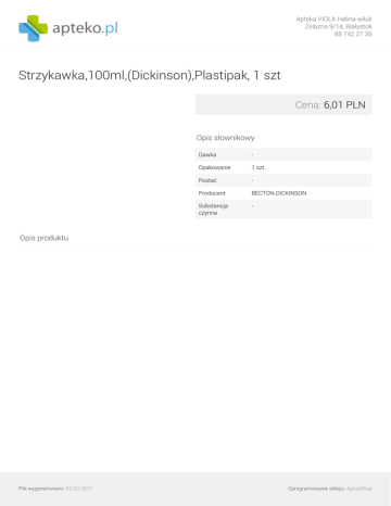 Apteka VIOLA Halina wiluk Żelazna 9/14, Białystok 85 742 27 35 Strzykawka,100ml,(Dickinson),Plastipak, 1 szt Cena: 6,01 PLN Opis słownikowy Dawka - Opakowanie 1 szt. Postać - Producent BECTON-DICKINSON Substancja czynna - Opis produktu Plik wygenerowano: 02-03-2017 Powered by TCPDF (www.tcpdf.org) Oprogramowanie sklepu: AptusShop