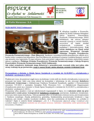 PIGUŁKA Warszawa 09.10.2015r. nr 36/15 Co słychać w Solidarności Tygodnik NSZZ Solidarność Polfa Warszawa S.A. 1980 -2015 W Polfie Warszawa S.A. WZD SKPPF NSZZ Solidarność W ubiegłym tygodniu w Przemyślu, odbyło się Walne Zebranie Delegatów Sekcji Krajowej Pracowników Przemysłu Farmaceutycznego NSZZ Solidarność. Jak zawsze delegaci omawiali sytuację w swoich firmach, oczywiście od kątem działań związkowych, wymieniali się poglądami i doświadczeniami. Tym razem dodatkowo na Zjazd został zaproszony Wiceprezes Zarządu Polskiego Związku Pracodawców Przemysłu Farmaceutycznego – Piotr Błaszczyk. Spotkanie z przedstawicielem pracodawców odbyło się w bardzo miłej i sympatycznej atmosferze. Pan Piotr Błaszczyk, przedstawił sytuację w polskiej farmacji, omówił stan aktualny oraz zagrożenia. Po jego referacie, była seria pytań i odpowiedzi a na koniec omówiliśmy tematy dalszej współpracy Polskiego Związku Pracodawców Przemysłu Farmaceutycznego z Sekcją Krajową Pracowników Przemysłu Farmaceutycznego NSZZ Solidarność. Jak widać związkowcy doskonale mogą debatować z pracodawcami, warunek tylko jest jeden, obie strony traktują się po partnersku, czego w naszej firmie, moim zdaniem, ostatnio ewidentnie brak. Przypominam o złożeniu w Dziale Spraw Socjalnych w terminie do 16.10.2015 r., oświadczenia o dochodzie uzyskanym w 2014 r. Pisałem już o tym, ale ponieważ ciągle toczy się dyskusja i wiele osób nie złożyło oświadczenia, to jeszcze raz poruszam ten temat. Jakiś czas temu ukazał się komunikat z informacją, że aby otrzymać dodatkowe świadczenie świątecznego z Zakładowego Funduszu Świadczeń Socjalnych, zgodnie z Porozumieniem zawartym 7.07.2015 r. pomiędzy Zarządem Polfy Warszawa S.A. a Zakładowymi Organizacjami Związkowymi, prosi się o złożenie w Dziale Spraw Socjalnych w terminie do 16.10.2015 r., oświadczenia o dochodzie uzyskanym w 2014 r. Przypomnę tylko, pisałem o tym po zakończonych negocjacjach w lipcu, że z sukcesem udało się przy rozmowach o czasie pracy wynegocjować dodatkowe świadczenie, powtarzam, dodatkowe świadczenie, poza tymi, które mamy dotychczas. Otóż przypomnę tylko, że świadczenie o którym mowa, jest świadczeniem z funduszu socjalnego. Zasadą podstawową, generalną, fundamentalną przyznawania świadczeń z tego funduszu, jest zasada: wypłata wysokości środków, musi być uzależniona od dochodów na „członka w rodzinie”: Zapis w ustawie brzmi następująco: „Art. 8. 1. Przyznawanie ulgowych usług i świadczeń oraz wysokość dopłat z Funduszu uzależnia się od sytuacji życiowej, rodzinnej i materialnej osoby uprawnionej do korzystania z Funduszu”. 1 NSZZ Solidarność: Bud. D II p.p109; tel.22 691 35 21; fax 22 691 35 22; mail: [email protected] Przewodniczący: M. Miara tel. 510992113; mail: [email protected] Biuro SPCH: Sandra Domagalska tel. 22 691 35 75; kom: 785 192 803; mail: [email protected] Brak informacji o sytuacji życiowej, rodzinnej i materialnej w praktyce prowadzi do sytuacji, w której pracodawca nie może udzielić świadczenia. Odmowa udostępnienia określonych informacji może więc skutkować odmową udzielenia świadczeń, o których mowa w ustawie o ZFŚS. Reasumując, apeluję aby wszyscy złożyli oświadczenie w celu uzyskania dodatkowego, powtarzam dodatkowego świadczenia. Zasady i wysokość świadczeń w zależności od dochodów będą wkrótce uzgadniane, ale sądzę, że można założyć, iż świadczenie otrzymają wszyscy pracownicy a średnio może to być ponad 800,00 zł. Apeluję o składanie oświadczeń, bo znając życie wiem, że za chwile (po wypłacie świadczeń) będzie lament i narzekanie tych którzy nie złożą oświadczeń i nie dostaną pieniędzy a pozostali tylko na tym skorzystają, bo pula może być wówczas większa, bo na mniejszą ilość osób. Dziwi mnie ten rwetes, bo zawsze było tak, że z funduszu socjalnego aby otrzymać świadczenie, powinno się je uzależniać od dochodów w rodzinie i jeśli do tej pory ktoś chciał uzyskać świadczenie wyższe, musiał dostarczyć oświadczenie o dochodach w rodzinie i pracownicy ci, od lat takie oświadczenia składali. Udało się wynegocjować dodatkowe świadczenie, niemałe i jeśli pracownik chce je otrzymać, powinien złożyć stosowne oświadczenie, jeśli nie złoży, zgodnie z zapisami porozumienia, nie otrzyma tego świadczenia, tyle. Uruchomiliśmy dla naszych członków związku, dodatkową usługę prawną. Każdy członek związku, który będzie chciał konkretnej porady prawnej adwokata, radcy prawnego lub doradcy podatkowego, ewentualnie będzie miał potrzebę sporządzenia pisma procesowego, opinii prawnej, po zgłoszeniu się do siedziby NSZZ Solidarność, otrzyma odpowiednie uprawnienie (kod) i będzie mógł skorzystać z takiej usługi (bezpłatnie). Porady prawne oprócz spraw związanych z pracą, mogą dotyczyć również spraw prywatnych tj. majątkowych, ubezpieczeniowych itp. Informację na temat tej usługi, można uzyskać w siedzibie związku u Pani Sandry Domagalskiej, tel. +48 22 691 35 75; tel. kom. +48 785 192 803 U właściciela ; W farmacji Farmacja zmienia azymut Puls Biznesu Sytuacja geopolityczna oraz różnice kursowe zachęciły do szukania zysków m.in. w Europie Zachodniej i na Dalekim Wschodzie. Jeszcze kilka lat temu wśród atrakcyjnych kierunków ekspansji zagranicznej firmy farmaceutyczne wymieniały Rosję, dzisiaj coraz częściej wskazują na nowe rynki, do tej pory rzadko wymieniane. I choć z Rosji nikt nie planuje się wycofywać, sytuacja geopolityczna i różnice kursowe powodują, że firmy zostały zmuszone szukać zysków w innych regionach. Niepewna sytuacja polityczna odwraca ich wzrok także od Bliskiego Wschodu czy Afryki. Atrakcyjny region — W związku z sytuacją w Afryce zawiesiliśmy nasz projekt (inwestycja z lokalnym partnerem w fabrykę w Algierii — red.). Cały 