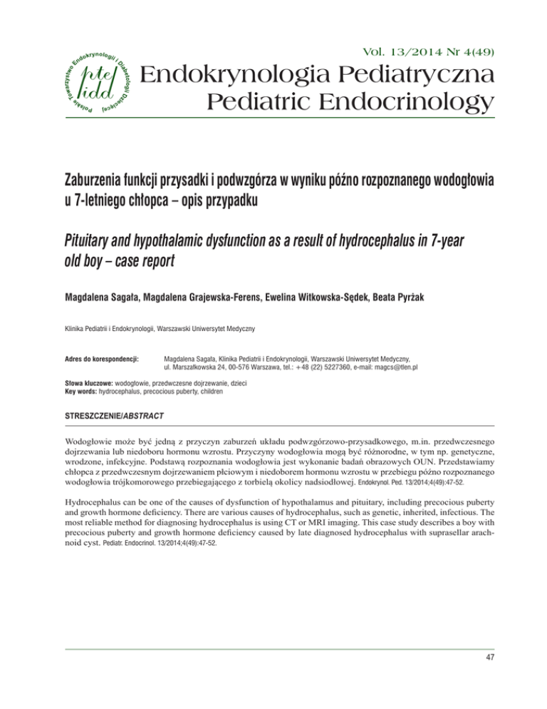 Sagała M. i inni: Zaburzenia funkcji przysadki i podwzgórza w wyniku późno rozpoznanego wodogłowia u 7-letniego chłopca – opis przypadku Vol. 13/2014 Nr 4(49) Endokrynologia Pediatryczna Pediatric Endocrinology Zaburzenia funkcji przysadki i podwzgórza w wyniku późno rozpoznanego wodogłowia u 7-letniego chłopca – opis przypadku Pituitary and hypothalamic dysfunction as a result of hydrocephalus in 7-year old boy – case report Magdalena Sagała, Magdalena Grajewska-Ferens, Ewelina Witkowska-Sędek, Beata Pyrżak Klinika Pediatrii i Endokrynologii, Warszawski Uniwersytet Medyczny Adres do korespondencji: Magdalena Sagała, Klinika Pediatrii i Endokrynologii, Warszawski Uniwersytet Medyczny, ul. Marszałkowska 24, 00-576 Warszawa, tel.: +48 (22) 5227360, e-mail: [email protected] Słowa kluczowe: wodogłowie, przedwczesne dojrzewanie, dzieci Key words: hydrocephalus, precocious puberty, children STRESZCZENIE/ABSTRACT Wodogłowie może być jedną z przyczyn zaburzeń układu podwzgórzowo-przysadkowego, m.in. przedwczesnego dojrzewania lub niedoboru hormonu wzrostu. Przyczyny wodogłowia mogą być różnorodne, w tym np. genetyczne, wrodzone, infekcyjne. Podstawą rozpoznania wodogłowia jest wykonanie badań obrazowych OUN. Przedstawiamy chłopca z przedwczesnym dojrzewaniem płciowym i niedoborem hormonu wzrostu w przebiegu późno rozpoznanego wodogłowia trójkomorowego przebiegającego z torbielą okolicy nadsiodłowej. Endokrynol. Ped. 13/2014;4(49):47-52. Hydrocephalus can be one of the causes of dysfunction of hypothalamus and pituitary, including precocious puberty and growth hormone deficiency. There are various causes of hydrocephalus, such as genetic, inherited, infectious. The most reliable method for diagnosing hydrocephalus is using CT or MRI imaging. This case study describes a boy with precocious puberty and growth hormone deficiency caused by late diagnosed hydrocephalus with suprasellar arachnoid cyst. Pediatr. Endocrinol. 13/2014;4(49):47-52. 47 Praca kazuistyczna Wstęp Wodogłowie może być jedną z przyczyn przedwczesnego dojrzewania. Do rozwoju wodogłowia może dojść już wewnątrzłonowo lub po urodzeniu się dziecka. Częstość występowania wrodzonego wodogłowia jest szacowana na 1:500–1:1000 żywych urodzeń [1,2]. W przybliżeniu połowa tych przypadków związana jest z przepukliną oponowo -rdzeniową [1,3]. Wśród przyczyn wrodzonych najczęstszą formą wodogłowia genetycznie uwarunkowanego jest wodogłowie sprzężone z chromosomem X, współistniejące ze stenozą wodociągu Sylwiusza, występujące z częstością do 25% wszystkich noworodków płci męskiej z wodogłowiem niebędącym częścią zespołów genetycznie uwarunkowanych. Wodogłowie to związane jest z mutacją genu zlokalizowanego na chromosomie X q28. Gen ten odpowiada za kodowanie cząsteczki adhezyjnej L1, która odgrywa rolę m. in. w prawidłowej migracji komórek nerwowych. Wodogłowie towarzyszy zespołom wad wrodzonych, takim jak: zespół Arnolda–Chiariego, zespół Dandy’ego–Walkera, zespół Dyka–Davidoffa–Massona [1,2]. Najczęstszymi zaburzeniami cytogenetycznymi związanymi z wodogłowiem są trisomie 13, 18, 9 i 9p [1,4,5]. Przyczyną wodogłowia mogą też być izolowane wady rozwojowe OUN, niebędące składową zespołów genetycznie uwarunkowanych, takie jak nadsiodłowe torbiele pajęczynówki, wady rozwojowe podwzgórza (np. hamartoma) lub dysplazja przegrodowo-wzrokowa [6–9]. Infekcje wewnątrzmaciczne, takie jak różyczka, cytomegalia i toksoplazmoza, także mogą powodować zaburzenia OUN prowadzące do rozwoju wodogłowia. Wykazano również szkodliwy wpływ czynników środowiskowych (głównie kwasu retinolowego) oraz niedoborów żywieniowych (zwłaszcza kawasu foliowego i witaminy A) [1,2]. Do czynników ryzyka wrodzonego wodogłowia możemy zaliczyć płeć męską, cukrzycę ciężarnych, leki przeciwdepresyjne, zwłaszcza przyjmowane w pierwszym trymestrze ciąży [14]. Wśród przyczyn wodogłowia nabytego wymienia się krwawienia śródczaszkowe, zapalenie opon mózgowo-rdzeniowych, zwłaszcza bakteryjne, guzy mózgu oraz urazy [1]. Na skutek tych zaburzeń może dochodzić do powstawania wad lub uszkodzeń OUN powodujących zaburzenia przepływu płynu mózgowo-rdzeniowego, które prowadzą do poszerzenia komór bocznych i komory trzeciej. Podejrzenie wodogłowia wysuwa się 48 Endokrynol. Ped., 13/2014;4(49):47-52 najczęściej na podstawie nieprawidłowego kształtu i zwiększonego obwodu głowy, a potwierdza się badaniami obrazowymi, takimi jak ultrasonografia przezciemieniowa, tomografia komputerowa lub rezonans magnetyczny. Prezentujemy pacjenta z przedwczesnym dojrzewaniem płciowym w przebiegu wodogłowia trójkomorowego, spowodowanego torbielą nadsiodłową pajęczynówki. Opis przypadku 7-letni chłopiec został skierowany do Kliniki Pediatrii i Endokrynologii Warszawskiego Uniwersytetu Medycznego celem diagnostyki przedwczesnego dojrzewania. W wywiadzie: od 6 roku życia objawy dojrzewania płciowego pod postacią owłosienia łonowego, powiększenia jąder, znacznego przyśpieszenia tempa wzrastania (zmiana toru wzrostowego z 3 na 75 centyl) oraz zmian proporcji ciała (wydłużenie tułowia). Chłopiec urodzony był z ciąży I, powikłanej przedwczesną czynnością skurczową macicy, rozwiązanej cięciem cesarskim z powodu braku postępu porodu w 41 tygodniu ciąży. W chwili urodzenia: masa ciała 3980 g, długość 59 cm, obwód głowy 37 cm, oceniony na 10 punktów w skali Apgar. Okres noworodkowy przebiegał bez powikłań. Przez pierwszy rok życia chłopiec był karmiony piersią. Rozwój fizyczny od okresu niemowlęcego przebiegał nieharmonijnie. Występowała wyraźna dysproporcja wzrostu (do około 5 roku życia krzywa wzrastania wzdłuż 3 centyla) i obwodu głowy (90 centyl). Przy przyjęciu do Kliniki Pediatrii i Endokrynologii w badaniu przedmiotowym stwierdzono: wysokość ciała 131,