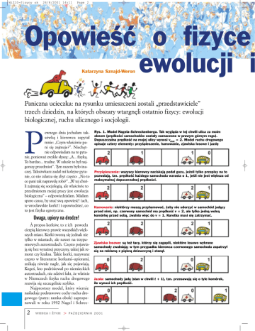 WiZ10-fizycy ok 24/8/2001 14:11 Page 2 OpowieÊç o fizyce ewolucji i Katarzyna Sznajd-Weron Paniczna ucieczka: na rysunku umieszczeni zostali „przedstawiciele” trzech dziedzin, na których obszary wtargn´li ostatnio fizycy: ewolucji biologicznej, ruchu ulicznego i socjologii. ewnego dnia jecha∏am taksówkà i kierowca zapyta∏ mnie: „Czym w∏aÊciwie pani si´ zajmuje?”. Niech´tnie odpowiadam na to pytanie, poniewa˝ zwykle s∏ysz´: „A... fizykà. To bardzo... trudne. W szkole to by∏ najgorszy przedmiot”. Tym razem by∏o inaczej. Taksówkarz zada∏ mi kolejne pytanie, co nie zdarza si´ zbyt cz´sto: „No to co pani tak naprawd´ robi?”. „W tej chwili zajmuj´ si´ socjologià, ale w∏aÊciwie to przedmiotem mojej pracy jest ewolucja biologiczna” – odpowiedzia∏am. Mia∏am sporo czasu, by snuç swà opowieÊç! (ach, te wroc∏awskie korki!) i opowiedzieç, co to jest fizyka egzotyczna. P Uwaga, upiory na drodze! À propos korków, to z ich powodu cierpià kierowcy prawie wszystkich wi´kszych miast. Korki tworzà si´ jednak nie tylko w miastach, ale nawet na trzypasmowych autostradach. Cz´sto pojawiajà si´ bez wyraênej przyczyny, takiej jak remont czy kraksa. Takie korki, nazywane cz´sto w literaturze korkami–upiorami, znikajà równie nagle, jak si´ pojawiajà. KogoÊ, kto podró˝owa∏ po niemieckich autostradach, nie zdziwi fakt, ˝e w∏aÊnie w Niemczech fizyka ruchu drogowego rozwija si´ szczególnie szybko. Najprostszy model, który wiernie naÊladuje podstawowe cechy ruchu drogowego (patrz: ramka obok) zaproponowali w roku 1992 Nagel i Schrec- 2 WIEDZA I ˚YCIE > Rys. 1. Model Nagela–Schreckenberga. Tak wyglàda w tej chwili ulica za moim oknem (pr´dkoÊci samochodów zosta∏y zaznaczone w prawym górnym rogu). Dopuszczalna pr´dkoÊç na mojej ulicy wynosi vmax = 2. Model ruchu drogowego opisuje cztery elementy: przyÊpieszenie, hamowanie, zjawiska losowe i jazd´ PrzyÊpieszenie: wszyscy kierowcy naciskajà peda∏ gazu, je˝eli tylko przepisy na to pozwalajà, tzn. pr´dkoÊç ka˝dego samochodu wzrasta o 1, jeÊli nie jest wi´ksza od maksymalnej dopuszczalnej pr´dkoÊci. Hamowanie: niektórzy muszà przyhamowaç, ˝eby nie uderzyç w samochód jadàcy przed nimi, np. czerwony samochód ma pr´dkoÊç v = 2, ale tylko jednà wolnà komórk´ przed sobà, zwalnia wi´c do v = 1. Karetka musi si´ zatrzymaç. Zjawiska losowe: sà te˝ tacy, którzy si´ zagapili, niektóre losowo wybrane samochody zwalniajà; w tym przypadku kierowca czerwonego samochodu zapatrzy∏ si´ na reklam´ z pi´knà dziewczynà i stanà∏. Jazda: samochody jadà (stan w chwili t + 1), tzn. przesuwajà si´ o tyle komórek, ile wynosi ich pr´dkoÊç. PA è D Z I E R N I K 2 0 0 1 WiZ10-fizycy ok 24/8/2001 14:11 Page 3 ce egzotycznej i rewolucji kenberg z Wydzia∏u Fizyki Uniwersytetu w Duisburgu. Model ten sk∏ada si´ z czterech elementów: przyÊpieszania, hamowania, zdarzeƒ losowych (tzn. wypadki uliczne, za∏amania pogody itd.) i swobodnej jazdy. Droga zastàpiona zosta∏a ∏aƒcuszkiem sk∏adajàcym si´ z jednakowych komórek (ryc. 1). W ka˝dej komórce mo˝e si´ znajdowaç samochód, który jest charakteryzowany jego aktualnà pr´dkoÊcià v = 0, 1, 2,..., vmax (np. v = 0, gdy samochód stoi, a v = 5, gdy jedzie z pr´dkoÊcià 135 km/h). W chwili poczàtkowej ka˝demu autu przypisujemy losowà pr´dkoÊç, tak jakbyÊmy nagle wyjrzeli za okno i zanotowali aktualny stan na drodze. Cztery regu∏y opisujàce ruch uliczny, wprowadzone w tym modelu, przedstawione zosta∏y na poprzedniej stronie. Prosz´ spojrzeç, prawda, ˝e proste? KtoÊ móg∏by nawet zarzuciç, ˝e zbyt proste. Przecie˝ nie wszyscy kierowcy przestrzegajà przepisów, szczególnie w czasie wakacji. Zgoda buduje, niezgoda rujnuje Skoro jesteÊmy ju˝ przy wakacjach... W zesz∏ym roku sp´dza∏am je z moimi rodzicami i synkiem nad morzem. Tam w∏aÊnie napisaliÊmy z Tatà niewàtpliwie najbardziej egzotycznà prac´ w naszym ˝yciu. Egzotyczny by∏ ju˝ sam fakt, ˝e pracowaliÊmy razem (nie sàdzi∏am, ˝e to kiedyÊ nastàpi!), ale przede wszystkim egzotyczny by∏ temat. Mój Tata jest bardzo powa˝nym fizykiem zajmujàcym si´ magnetyzmem, ale tak dzia∏a czar egzotyki, ˝e na chwil´ si´ zapomnia∏ i... napisaliÊmy prac´ o podejmowaniu decyzji w zamkni´tych spo∏eczeƒstwach. Pomys∏ by∏ niezmiernie prosty i mo˝na by go zawrzeç w znanym przys∏owiu „Zgoda buduje, niezgoda rujnuje”. Rys. 2. Interaktywna mapa Duisburga. Drogi sà pokolorowane zgodnie z nat´˝eniem ruchu: zielony kolor oznacza, ˝e droga jest prawie pusta, czerwony – pokrycie 20% i wi´cej www.traffic.uni– duisburg.de/OLSIM/ index.html) 2200 przep∏yw (liczba aut na godzin´) 2000 Inteligentny system transportu 1800 Ruch na autostradach i ulicach wielkich miast na ca∏ym Êwiecie jest coraz wi´kszy. Dane o ruchu drogowym zwykle zbierane sà za pomocà specjalnych detektorów. W miastach najcz´Êciej instaluje si´ je przy skrzy˝owaniach w celu optymalizacji sygnalizacji Êwietlnej. Mimo, ˝e przepisy i struktura dróg sà ró˝ne w ró˝nych miejscach, to jednak pewne cechy ruchu drogowego obserwowane sà wsz´dzie. Okazuje si´ (rys. 3), ˝e maksymalny przep∏yw wyst´puje przy mniej wi´cej dwudziestuprocentowym zag´szczeniu samochodów na drodze. Poni˝ej tej wartoÊci ruch samochodów jest zupe∏nie swobodny, ale ze wzgl´du na ma∏à liczb´ aut strumieƒ nie jest du˝y. Dla nat´˝enia ruchu powy˝ej 20% przep∏yw zmniejsza si´ z powodu zat∏oczenia. Najprostszy model (Nagel–Schreckenberg, 1992) odtwarzajàcy te cechy zosta∏ wykorzystany do symulowania na bie˝àco ruchu ulicznego w Duisburgu. Na terenie centrum, o powierzchni oko∏o 30 km2, zosta∏o umieszczonych 750 czujników. Co minut´ dane z detektorów przekazywane sà do komputera, który wykonuje na bie˝àco symulacje. Na ich podstawie okreÊlany jest ruch panujàcy na ulicach Duisb