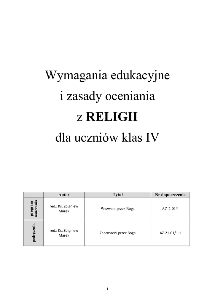Wymagania edukacyjne i zasady oceniania z RELIGII Autor Tytuł Nr dopuszczenia program nauczania red.: Ks. Zbigniew Marek Wezwani przez Boga AZ-2-01/1 podręcznik dla uczniów klas IV red.: Ks. Zbigniew Marek Zaproszeni przez Boga AZ-21-01/1-1 1 ZASADY OCENIANIA 1. ilośd i jakośd prezentowanych wiadomości 2. umiejętnośd zastosowania poznanych wiadomości w życiu, w teorii i w praktyce 3. zainteresowanie przedmiotem 4. stosunek do lekcji religii: zeszyt (oceniany raz w semestrze), aktywnośd (3 plusy przelicza się na ocenę bardzo dobrą, na życzenie ucznia – można zrezygnowad z piątki i zebrad jeszcze 2 plusy do oceny celującej) 5. uczeo ma prawo zgłosid w semestrze 3 nieprzygotowania (prace domowe ustne i pisemne) 6. uczeo, który ma ambicję mied wysoką koocową ocenę z religii, powinien jak najrzadziej korzystad z powyższego prawa 7. jeśli uczeo nie zgłosi np., a w trakcie zajęd okaże się, że jest nieprzygotowany otrzymuje ocenę niedostateczną 8. nieprzygotowania nie dotyczą ucznia nieobecnego na zajęciach, który w terminie uzgodnionym z nauczycielem, nadrobi zaległości 2 religia klasa IV WYMAGANIA EDUKACYJNE bardzo dobry celujący Skala ocen Kryteria oceniania wiedzy i umiejętności Uczeń spełnia wymagania na ocenę bardzo dobrą Wykazuje się wiadomościami wykraczającymi poza program religii swojego poziomu edukacji Samodzielnie rozwija swoje uzdolnienia Posługuje się zdobytymi wiadomościami w rozwiązywaniu problemów teoretycznych i praktycznych Uczestniczy w konkursach religijnych Wykonuje dodatkowe prace domowe Pomaga w organizacji uroczystości religijnych w szkole i parafii Poznane prawdy wiary stosuje w życiu Uczeń spełnia wymagania na ocenę dobra Opanował pełny zakres wiedzy i umiejętności określony programem Posiada pełną znajomość pacierza Wzorowo prowadzi zeszyt i odrabia prace domowe Aktywnie uczestniczy w lekcjach Stara się być świadkiem wyznawanej wiary Samodzielnie stosuje umiejętności wykorzystania wiadomości w teorii i praktyce 3 religia klasa IV dopuszczający dostateczny dobry WYMAGANIA EDUKACYJNE Uczeń spełnia wymagania na ocenę dostateczną Opanował wiedzę religijną określoną w programie na poziomie dobrym Wykazuje się dobrą znajomością pacierza W zeszycie posiada sporadyczne braki w zapisie lekcji i w pracach domowych Jest zainteresowany przedmiotem Wykazuje się dobrą umiejętnością zastosowania zdobytych wiadomości Potrafi wyjaśnić zjawiska przy inspiracji nauczyciela Stara się być aktywny w czasie lekcji Uczeń spełnia wymagania na ocenę dopuszczającą Odpowiada na pytania przy naprowadzeniu przez nauczyciela Uczeń opanował całkowicie niezbędne wiadomości i umiejętności Wykazuje podstawową znajomość pacierza W zeszycie występują braki zapisów z lekcji i w pracach domowych Jest przeciętnie pilny i zainteresowany przedmiotem Stosuje wiedzę w teorii i praktyce przy pomocy nauczyciela Wykazuje podstawowe wiadomości, połączone związkami logicznymi Uczeń opanował podstawowe pojęcia religijne Prezentuje mało zadowalający poziom umiejętności Posiada problemy ze znajomością pacierza Ma poprawny stosunek do przedmiotu Nieumiejętnie stosuje wiedzę, nawet przy pomocy nauczyciela Brak podstawowej umiejętności wyjaśniania zjawisk 4 religia klasa IV niedostateczny WYMAGANIA EDUKACYJNE Uczeń nie opanował podstawowych pojęć religijnych Odmawia wszelkiej współpracy z nauczycielem Ma lekceważący stosunek do przedmiotu Nie wykazuje się znajomością pacierza Nie posiada zeszytu lub często nie przynosi go na lekcję Opuszcza lekcje religii Wyraża lekceważący stosunek do wartości religijnych 5 religia klasa IV
