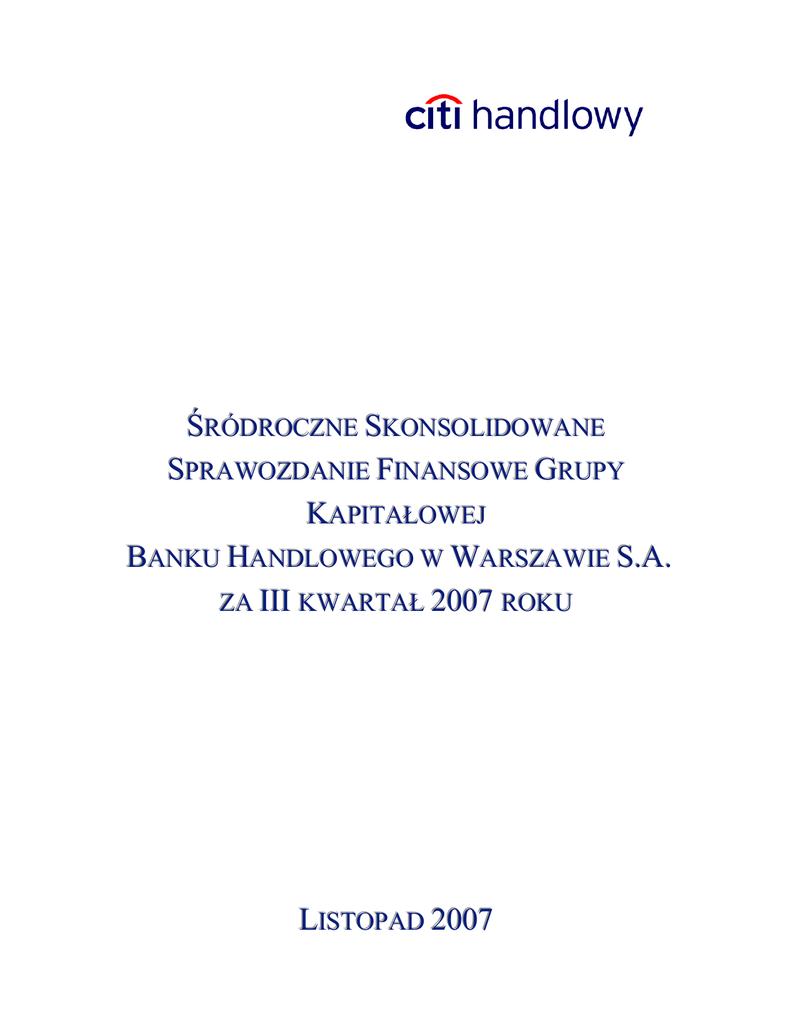 ŚRÓDROCZNE SKONSOLIDOWANE SPRAWOZDANIE FINANSOWE GRUPY KAPITAŁOWEJ BANKU HANDLOWEGO W WARSZAWIE S.A. ZA III KWARTAŁ 2007 ROKU LISTOPAD 2007 Grupa Kapitałowa Banku Handlowego w Warszawie S.A. WYBRANE DANE FINANSOWE w tys. zł III kwartał III kwartał narastająco narastająco okres od okres od 01/01/07 01/01/06 do 30/09/07 do 30/09/06 w tys. EUR*** III kwartał III kwartał narastająco narastająco okres od okres od 01/01/07 01/01/06 do 30/09/07 do 30/09/06 dane dotyczące skróconego skonsolidowanego sprawozdania finansowego Przychody z tytułu odsetek 1 450 322 1 209 999 378 536 308 902 Przychody z tytułu prowizji 698 013 566 720 182 182 144 678 Zysk (strata) brutto 778 774 627 895 203 261 160 296 Zysk (strata) netto 618 412 488 781 161 406 124 781 (122 229) (303 245) (32 357) (76 125) 40 873 073 35 990 735 10 820 138 9 394 115 - 250 113 - 65 283 29 376 133 25 991 136 7 776 607 6 784 072 5 432 495 5 186 087 1 438 119 1 301 892 Zmiana stanu środków pieniężnych Aktywa razem* Zobowiązania wobec Banku Centralnego* Zobowiązania finansowe wyceniane według zamortyzowanego kosztu* Kapitał własny Kapitał zakładowy 522 638 522 638 138 356 131 201 130 659 600 130 659 600 130 659 600 130 659 600 Wartość księgowa na jedną akcję (w zł / EUR) 41,58 39,69 11,01 9,96 Współczynnik wypłacalności (w %)* Współczynnik wypłacalności obliczony z uwzględnieniem funduszy podstawowych („tier 1 capital”) (w %)* Zysk (strata) na jedną akcję zwykłą (w zł / EUR) 12,36 14,10 12,36 14,10 12,55 14,79 12,55 14,79 4,73 3,74 1,24 0,96 4,73 3,74 1,24 0,96 Liczba akcji (w szt.) Rozwodniony zysk (strata) na jedną akcję (w zł / EUR) dane dotyczące skróconego jednostkowego sprawozdania finansowego Przychody z tytułu odsetek 1 423 673 1 184 271 371 580 302 334 Przychody z tytułu prowizji 639 172 513 532 166 825 131 100 Zysk (strata) brutto 769 377 609 816 200 808 155 680 Zysk (strata) netto 612 849 478 306 159 954 122 107 (105 882) (319 676) (28 030) (80 250) 40 161 355 35 095 894 10 631 729 9 160 549 - 250 113 - 65 283 29 056 183 25 529 437 7 691 908 6 663 562 5 309 037 5 099 509 1 405 437 1 280 158 522 638 522 638 138 356 131 201 130 659 600 130 659 600 130 659 600 130 659 600 Wartość księgowa na jedną akcję (w zł / EUR) 40,63 39,03 10,76 9,80 Współczynnik wypłacalności (w %)* Współczynnik wypłacalności obliczony z uwzględnieniem funduszy podstawowych („tier 1 capital”) (w %)* Zysk (strata) na jedną akcję zwykłą (w zł / EUR) 11,46 13,40 11,46 13,40 12,98 14,92 12,98 14,92 4,69 3,66 1,22 0,93 Zmiana stanu środków pieniężnych Aktywa razem* Zobowiązania wobec Banku Centralnego* Zobowiązania finansowe wyceniane według zamortyzowanego kosztu* Kapitał własny Kapitał zakładowy Liczba akcji (w szt.) Rozwodniony zysk (strata) na jedną akcję (w zł / EUR) 4,69 3,66 1,22 0,93 Zadeklarowana lub wypłacona dywidenda na jedną akcję (w 4,10 3,60 1,09 0,90 zł / EUR)** *Porównywalne dane bilansowe według stanu na dzień 31 grudnia 2006 roku. **Przedstawione wskaźniki dotyczą odpowiednio: wypłaconej w 2007 roku dywidendy z podziału zysku za 2006 rok oraz wypłaconej dywidendy w 2006 roku z podziału zysku za 2005 rok. ***Kursy użyte do przeliczenia złotych na euro: pozycje bilansowe wg średniego kursu NBP na dzień 30 września 2007 roku – 3,7775 zł (na dzień 31 grudnia 2006 roku: 3,8312 zł; na dzień 30 września 2006 roku: 3,9835 zł); pozycje rachunku zysków i strat wg kursu stanowiącego średnią arytmetyczną kursów NBP na koniec każdego miesiąca I, II i III kwartału 2007 roku – 3,8314 zł (I, II i III kwartału 2006 roku: 3,9171 zł). 2 Grupa Kapitałowa Banku Handlowego w Warszawie S.A. SPIS TREŚCI Skonsolidowany rachunek zysków i strat _________________________________________ 4 Skonsolidowany bilans __________________________________________________________ 5 Skonsolidowane zestawienie zmian w kapitale własnym __________________________ 6 Skrócony skonsolidowany rachunek przepływów pieniężnych _____________________ 7 Noty objaśniające do skonsolidowanego sprawozdania finansowego ______________ 7 1. Informacje ogólne o Banku i Grupie Kapitałowej Banku _________________ 7 2. Zasady przyjęte przy sporządzeniu raportu ______________________________ 8 3. Sytuacja makroekonomiczna oraz sytuacja na rynku pieniężnym, walutowym i kapitałowym _______________________________________________ 9 4. Sytuacja w sektorze bankowym _________________________________________ 10 5. Analiza finansowa wyników Grupy Kapitałowej Banku _________________ 10 6. Sprawozdawczość dotycząca segmentów działalności ____________________ 15 7. Działalność Grupy ______________________________________________________ 18 8. Sezonowość lub cykliczność działalności ________________________________ 30 9. Emisje, wykup i spłaty dłużnych i kapitałowych papierów wartościowych __________________________________________________________ 30 10. Wypłacone (lub zadeklarowane) dywidendy_____________________________ 30 11. Zmiany w strukturze Grupy Kapitałowej Banku ________________________ 31 12. Znaczące zdarzenia po dniu bilansowym nieujęte w sprawozdaniu finansowym _____________________________________________________________ 31 13. Zmiany zobowiązań pozabilansowych ___________________________________ 31 14. Realizacja prognozy wyników na 2007 rok ______________________________ 32 15. Informacja o akcjonariuszach __________________________________________ 32 16. Akcje emitenta będące w posiadaniu osób zarządzających i nadzorujących _________________________________________________________ 32 17. Informacja o toczących się postępowaniach _____________________________ 32 18. Informacja o znaczących transakcjach z podmiotami powiązanymi _____ 35 19. Informacja o znaczących umowach poręczeń kredytu, pożyczki lub udzieleniu gwarancji ____________________________________________________ 35 20. Opis czynników i zdarzeń