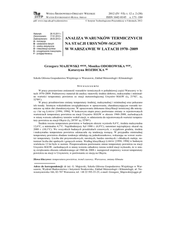 WODA-ŚRODOWISKO-OBSZARY WIEJSKIE WATER-ENVIRONMENT-RURAL AREAS pdf: www.itep.edu.pl/wydawnictwo Wpłynęło 28.10.2011 r. Zrecenzowano 17.01.2012 r. Zaakceptowano 28.03.2012 r. A – koncepcja B – zestawienie danych C – analizy statystyczne D – interpretacja wyników E – przygotowanie maszynopisu F – przegląd literatury 2012 (IV–VI): t. 12 z. 2 (38) ISSN 1642-8145 s. 171–184 © Instytut Technologiczno-Przyrodniczy w Falentach, 2012 ANALIZA WARUNKÓW TERMICZNYCH NA STACJI URSYNÓW-SGGW W WARSZAWIE W LATACH 1970–2009 Grzegorz MAJEWSKI ABCDE, Monika ODOROWSKA BCDF, Katarzyna ROZBICKA DE Szkoła Główna Gospodarstwa Wiejskiego w Warszawie, Zakład Meteorologii i Klimatologii Streszczenie W pracy przestawiono zmienność warunków termicznych w południowej części Warszawy w latach 1970–2009. Podstawowy materiał do analizy stanowiły średnie dobowe, maksymalne i minimalne wartości temperatury powietrza ze stacji meteorologicznej Ursynów–SGGW (λE 21º02’, φN 52º09’). W pracy przedstawiono zmiany temperatury średniej, maksymalnej i minimalnej oraz pokazano ich trendy. Istotnym wskaźnikiem uwzględnionym w opracowaniu, charakteryzującym warunki termiczne są także dni charakterystyczne. W opracowaniu dokonano klasyfikacji termicznej dla miesięcy i lat wg LORENC [1994; 1996]. W końcowym etapie pracy porównano zmiany w rejestrowanych wartościach temperatury powietrza na stacji Ursynów–SGGW w okresie 1960–2008, zachodzących w miarę wzrostu zabudowy terenów wokół stacji, w odniesieniu do rejestrowanych wartości temperatury powietrza na stacji Okęcie (λE 20º59’ φN 52º09’). Średnia roczna temperatura powietrza w badanym okresie wyniosła 8,6°C, średnia maksymalna 12,6°C, a minimalna 4,7°C. Najchłodniejszy był 1980 r. (6,9°C), natomiast najcieplejszy okazał się 2008 r. (10,1°C). We wszystkich badanych przedziałach czasowych, z wyjątkiem grudnia, średnia i maksymalna temperatura powietrza odznaczała się tendencją rosnącą. W przypadku minimalnej temperatury powietrza zbadane tendencje układają się jednokierunkowo, wskazując na wzrost wartości temperatury. Liczba dni przymrozkowych, mroźnych, bardzo mroźnych i chłodnych maleje, natomiast liczba dni upalnych i gorących rośnie. Według klasyfikacji LORENC [1994; 1996] w badanym wieloleciu 13 lat było w normie. Przeprowadzone porównanie zmian temperatury powietrza na stacji Ursynów-SGGW, zachodzących w miarę wzrostu zabudowy terenu wokół stacji wykazało, że w miarę zwiększania obszaru zabudowanego od 1960 do 2008 r. następował stopniowy wzrost temperatury powietrza na stacji w Ursynowie, w porównaniu ze stacją na Okęciu. Słowa kluczowe: temperatura powietrza, trend czasowy, Warszawa, zmiany klimatu Adres do korespondencji: dr inż. G. Majewski, Szkoła Główna Gospodarstwa Wiejskiego w Warszawie, Wydział Budownictwa i Inżynierii Środowiska, Zakład Meteorologii i Klimatologii, ul. Nowoursynowska 166, 02-787 Warszawa; tel. +48 22 593-53-25, e-mail: [email protected] 172 Woda-Środowisko-Obszary Wiejskie t. 12 z. 2 (38) WSTĘP Temperatura powietrza jest oceniana jako najważniejsza charakterystyka fizycznego stanu klimatycznego systemu i najbardziej znacząca dla praktycznej działalności człowieka. Rozkład jej w przestrzeni i czasie oraz wszelkie zmiany stanowią istotną cechę każdego klimatu; nie tylko kierunek zmian (ocieplenie, ochłodzenie), lecz także ich intensywność nie pozostają bez wpływu na zachowanie innych elementów. W badaniach nad zmianami klimatu, istotne dla określania tła zmienności temperatury powietrza są jej wartości ekstremalne (maksymalna i minimalna) [TREPIŃSKA 2005]. Ocieplenie klimatu w Polsce jest wyraźne. Na szczególną uwagę zasługuje ostatnie 20-lecie XX w. oraz początek XXI w., w którym nastąpiło wyraźne zwiększenie tempa ocieplenia [KOŻUCHOWSKI, ŻMUDZKA 2001; ŻMUDZKA 2009]. Wyjaśnienie przyczyny postępującego ocieplenia wyraźnie dzieli opinie naukowców; IPCC (Intergovernmental Panel on Climate Change) przyjmuje 90-procentowe prawdopodobieństwo, że przyczyną wzrostu temperatury na Ziemi jest emisja dwutlenku węgla wskutek spalania kopalin. Niektórzy badacze dowodzą jednak, że ocieplenie ma naturalne przyczyny, związane np. z aktywnością Słońca [ŁYKOWSKI 2007; MADEYSKA, MARKS 2008]. Nie wiadomo jednak, jaka część postępującego ocieplenia klimatu jest efektem oddziaływania czynników naturalnych, a jaka – czynników antropogenicznych. Celem niniejszego opracowania jest analiza zmian warunków termicznych w Warszawie na podstawie danych meteorologicznych pochodzących ze stacji Ursynów-SGGW, zlokalizowanej w południowej części Warszawy. Teren badań, na którym znajduje się stacja pomiarowa do 1975 r. był użytkowany rolniczo. W latach 1975–2002 wybudowano w otoczeniu stacji zespół osiedli mieszkaniowych o łącznej powierzchni 1 tys. ha. Budowę zwartych osiedli mieszkaniowych, położonych najbliżej stacji zakończono w 1980 r. W latach 2001–2008 nastąpiła znaczna rozbudowa miasteczka akademickiego SGGW (wybudowano 11 obiektów 2–5-kondygnacyjnych). Otoczenie stacji stanowi luźna zabudowa niska i średnia, położona na południowy wschód, południe, południowy zachód i zachód od stacji meteorologicznej Ursynów-SGGW. Na północny zachód, północ i północny wschód występuje rzadka zabudowa niska, a najbardziej zwarta zabudowa znajduje się w odległości 1,5–3 km od stacji. Jedynie masy powietrza napływające ze wschodu nie napotykają na swojej drodze większych osiedli mieszkaniowych [ROZBICKI i in. 2005]. Wieloletnie dane meteorologiczne uzyskane ze stacji Ursynów-SGGW stanowią oryginalny materiał pomiarowy, umożliwiający analizę zmian klimatu lokalnego analizowanego obszaru. © ITP Woda Środ. Obsz. Wiej. 2012 (IV–VI), t. 12 z. 2 (38) G. Majewski i in.: Analiza warunków termicznych na stacji Ursynów-SGGW… 173 MATERI