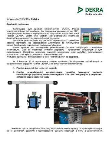 On the safe side Szkolenia DEKRA Polska Spotkania regionalne Kontynuując cykl spotkań szkoleniowych, DEKRA Polska organizuje kolejne już spotkania dla diagnostów pracujących na SKP, które podpisały umowę o współpracy oraz diagnostów spoza sieci stacji Partner DEKRA. Celem tych spotkań jest podniesienie kwalifikacji diagnostów pracujących na stacjach kontroli pojazdów. Spotkania przeznaczone są dla osób wykonujących zawodowo badania techniczne lub posiadających uprawnienia do wykonywania badań. Spotkania te mają typowo „techniczny” charakter. Celem spotkań jest szczegółowe przećwiczenie procedur związanych z badaniami technicznymi. Daje to możliwość wymiany poglądów i spostrzeżeń związanych z tymi zagadnieniami. Uczestnicy otrzymują materiały szkoleniowe oraz certyfikat potwierdzający uczestnictwo oraz wpis do Książeczki Szkoleń Diagnosty. Wszystkie spotkania, dla diagnostów z sieci Partner DEKRA są bezpłatne. W II kwartale 2010 organizujemy kolejne spotkania dla diagnostów zatrudnionych w stacjach kontroli pojazdów Partner DEKRA, i nie tylko, których tematami będą: 1. Pomiar geometrii kół jezdnych pojazdu 2. Pomiar prawidłowości rozmieszczenia punktów bazowych nadwozia samonośnego pojazdów samochodowych do 3,5 t DMC, związanych z zespołami i układami bezpieczeństwa jazdy Szkolenie będzie przeprowadzone przy współudziale wiodącej firmy na rynku specjalizującej się w pomiarach geometrii i rozmieszczenia punktów bazowych z firmy z zastosowaniem On the safe side najnowszych urządzeń przeznaczonych do tego typu badań. Podczas szkolenia postaramy się przypomnieć i wyjaśnić podstawy pomiaru geometrii i rozmieszczenia punktów bazowych. Uczestnicy otrzymują komplet materiałów szkoleniowych oraz zaświadczenie potwierdzające udział w szkoleniu organizowanym przez DEKRA Polska. Serdecznie zapraszam Krzysztof Cieślak Kierownik ds. szkoleń i badań technicznych pojazdów DEKRA Polska Sp. z o.o. Dział Stacji Kontroli Pojazdów Aleja Krakowska 2a, 02-284 Warszawa --------------------------------------------------------------------tel: +48.22.5773 629, fax: +48.22.5773 636 Mobile: +48 662 76 86 25 [email protected], [email protected], http://www.dekra.pl Miejsca oraz terminy spotkań regionalnych: I Spotkanie: 18.05.2010, godz. 10.00 – Rzeszów, MULTIMOTO Sp. z o.o., ul. Handlowa 4, 35-103 Rzeszów II Spotkanie: 19.05.2010, godz. 10.00 – Lublin SABAT Sp. z o.o. ul. Budowlana 24 20-496 Lublin III Spotkanie: 21.05.2010, godz. 10.00 – Białystok, TOP AUTO, Krupniki 25, 15-641 Białystok IV Spotkanie: 25.05.2010, godz. 10.00 – Olsztyn, EUROPOL Sp. Z o.o. , 10-409 Olsztyn, ul. Lubelska 48 V Spotkanie: 26.05.2010, godz. 10.00 – Bydgoszcz, Poczta Polska , ul. Gajowa 99, 85-700 Bydgoszcz VI Spotkanie: 27.05.2010, godz. 9.00 – Warszawa Mercedes-Benz, ul. Gottlieba Daimlera 1 , 02-460 Warszawa VII Spotkanie: 28.05.2010, godz. 9.00 – Łódź, "ACM" Sp. z o.o., 91-211 Łódź, ul. Szparagowa 4 VIII Spotkanie: 08.06.2010 godz. 11.00 – Police, „Trans-Net” S.A. ul. Tanowska 8 72-010 Police IX Spotkanie: 09.06.2010, godz. 10.00 - Słupsk PKS Słupsk S.A., ul. Piłsudskiego 74, 76-200 Słupsk X Spotkanie: 11.06.2010, godz. 10.00 – Poznań Przedsiębiorstwo Motoryzacyjne POL – CAR, 61 – 057 Poznań, ul. Gorzysława 9 XI Spotkanie: 15.06.2010, godz. 11.00 – Jelcz Laskowice, TACHPOL, 55-221 Jelcz-Laskowice, ul. Techników 33 XII Spotkanie: 16.06.2010, godz. 10.00 – Przylep k/ Zielonej Góry Autoservice Sp. z o.o. ul. 22 Lipca 86b, 66-015 Przylep k/ Zielonej Góry XIII Spotkanie 18.06.2010, godz. 10. Ruda Śląska Cracow Truck Center Sp. z o.o., ul. Radoszowska 1A, 41-707 Ruda Śląska