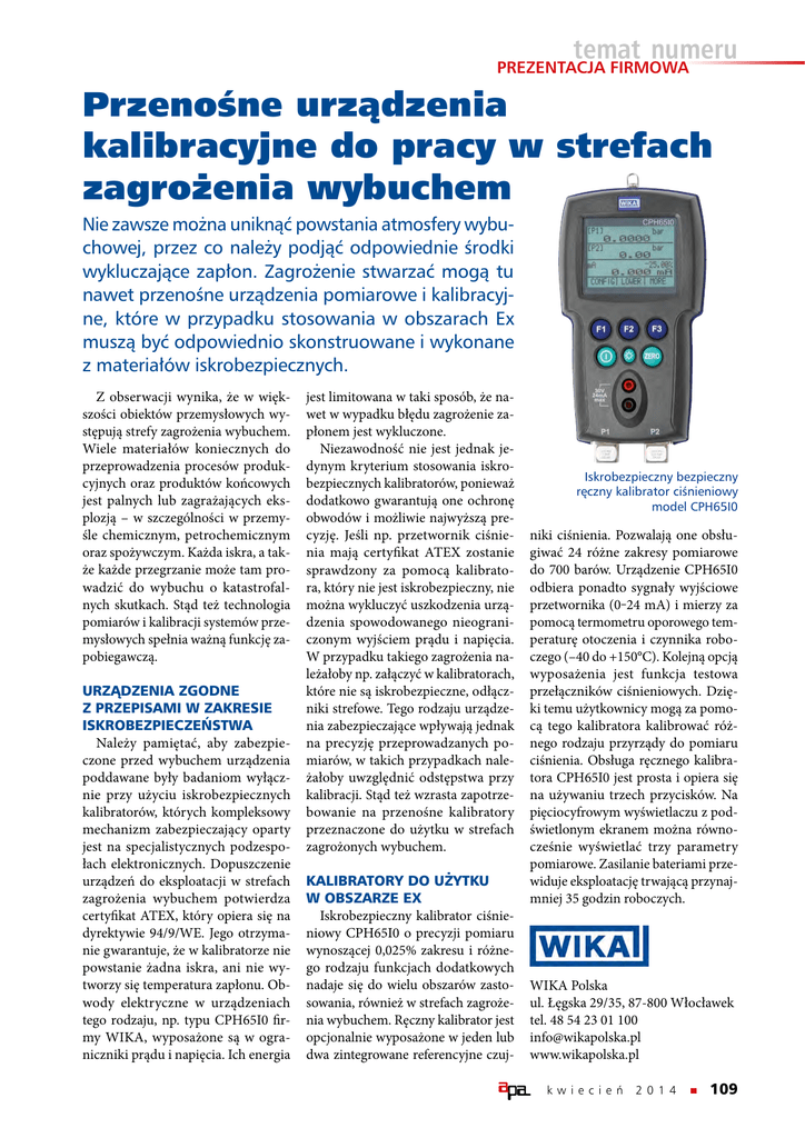 temat numeru PREZENTACJA FIRMOWA Przenośne urządzenia kalibracyjne do pracy w strefach zagrożenia wybuchem Nie zawsze można uniknąć powstania atmosfery wybuchowej, przez co należy podjąć odpowiednie środki wykluczające zapłon. Zagrożenie stwarzać mogą tu nawet przenośne urządzenia pomiarowe i kalibracyjne, które w przypadku stosowania w obszarach Ex muszą być odpowiednio skonstruowane i wykonane z materiałów iskrobezpiecznych. Z obserwacji wynika, że w większości obiektów przemysłowych występują strefy zagrożenia wybuchem. Wiele materiałów koniecznych do przeprowadzenia procesów produkcyjnych oraz produktów końcowych jest palnych lub zagrażających eksplozją – w szczególności w przemyśle chemicznym, petrochemicznym oraz spożywczym. Każda iskra, a także każde przegrzanie może tam prowadzić do wybuchu o katastrofalnych skutkach. Stąd też technologia pomiarów i kalibracji systemów przemysłowych spełnia ważną funkcję zapobiegawczą. URZĄDZENIA ZGODNE Z PRZEPISAMI W ZAKRESIE ISKROBEZPIECZEŃSTWA Należy pamiętać, aby zabezpieczone przed wybuchem urządzenia poddawane były badaniom wyłącznie przy użyciu iskrobezpiecznych kalibratorów, których kompleksowy mechanizm zabezpieczający oparty jest na specjalistycznych podzespołach elektronicznych. Dopuszczenie urządzeń do eksploatacji w strefach zagrożenia wybuchem potwierdza certyfikat ATEX, który opiera się na dyrektywie 94/9/WE. Jego otrzymanie gwarantuje, że w kalibratorze nie powstanie żadna iskra, ani nie wytworzy się temperatura zapłonu. Obwody elektryczne w urządzeniach tego rodzaju, np. typu CPH65I0 firmy W IKA, wyposażone są w ograniczniki prądu i napięcia. Ich energia jest limitowana w taki sposób, że nawet w wypadku błędu zagrożenie zapłonem jest wykluczone. Niezawodność nie jest jednak jedynym kryterium stosowania iskrobezpiecznych kalibratorów, ponieważ dodatkowo gwarantują one ochronę obwodów i możliwie najwyższą precyzję. Jeśli np. przetwornik ciśnie TEX zostanie nia mają certyfikat A sprawdzony za pomocą kalibratora, który nie jest iskrobezpieczny, nie można wykluczyć uszkodzenia urządzenia spowodowanego nieograniczonym wyjściem prądu i napięcia. W przypadku takiego zagrożenia należałoby np. załączyć w kalibratorach, które nie są iskrobezpieczne, odłączniki strefowe. Tego rodzaju urządzenia zabezpieczające wpływają jednak na precyzję przeprowadzanych pomiarów, w takich przypadkach należałoby uwzględnić odstępstwa przy kalibracji. Stąd też wzrasta zapotrzebowanie na przenośne kalibratory przeznaczone do użytku w strefach zagrożonych wybuchem. KALIBRATORY DO UŻYTKU W OBSZARZE EX Iskrobezpieczny kalibrator ciśnieniowy CPH65I0 o precyzji pomiaru wynoszącej 0,025% zakresu i różnego rodzaju funkcjach dodatkowych nadaje się do wielu obszarów zastosowania, również w strefach zagrożenia wybuchem. Ręczny kalibrator jest opcjonalnie wyposażone w jeden lub dwa zintegrowane referencyjne czuj- Iskrobezpieczny bezpieczny ręczny kalibrator ciśnieniowy model CPH65I0 niki ciśnienia. Pozwalają one obsługiwać 24 różne zakresy pomiarowe do 700 barów. Urządzenie CPH65I0 odbiera ponadto sygnały wyjściowe przetwornika (0‒24 mA) i mierzy za pomocą termometru oporowego temperaturę otoczenia i czynnika roboczego (–40 do +150°C). Kolejną opcją wyposażenia jest funkcja testowa przełączników ciśnieniowych. Dzięki temu użytkownicy mogą za pomocą tego kalibratora kalibrować różnego rodzaju przyrządy do pomiaru ciśnienia. Obsługa ręcznego kalibratora CPH65I0 jest prosta i opiera się na używaniu trzech przycisków. Na pięciocyfrowym wyświetlaczu z podświetlonym ekranem można równocześnie wyświetlać trzy parametry pomiarowe. Zasilanie bateriami przewiduje eksploatację trwającą przynajmniej 35 godzin roboczych. WIKA Polska ul. Łęgska 29/35, 87-800 Włocławek tel. 48 54 23 01 100 [email protected] www.wikapolska.pl kw ie cie ń 2 0 1 4 109