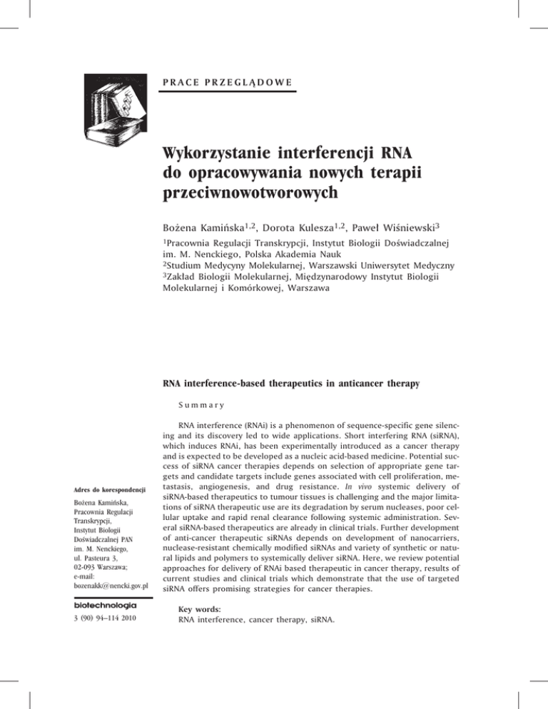 PRACE PRZEGL¥DOWE Wykorzystanie interferencji RNA do opracowywania nowych terapii przeciwnowotworowych Bo¿ena Kamiñska1,2, Dorota Kulesza1,2, Pawe³ Wiœniewski3 1Pracownia Regulacji Transkrypcji, Instytut Biologii Doœwiadczalnej im. M. Nenckiego, Polska Akademia Nauk 2Studium Medycyny Molekularnej, Warszawski Uniwersytet Medyczny 3Zak³ad Biologii Molekularnej, Miêdzynarodowy Instytut Biologii Molekularnej i Komórkowej, Warszawa RNA interference-based therapeutics in anticancer therapy Summary Adres do korespondencji Bo¿ena Kamiñska, Pracownia Regulacji Transkrypcji, Instytut Biologii Doœwiadczalnej PAN im. M. Nenckiego, ul. Pasteura 3, 02-093 Warszawa; e-mail: [email protected] 3 (90) 94–114 2010 RNA interference (RNAi) is a phenomenon of sequence-specific gene silencing and its discovery led to wide applications. Short interfering RNA (siRNA), which induces RNAi, has been experimentally introduced as a cancer therapy and is expected to be developed as a nucleic acid-based medicine. Potential success of siRNA cancer therapies depends on selection of appropriate gene targets and candidate targets include genes associated with cell proliferation, metastasis, angiogenesis, and drug resistance. In vivo systemic delivery of siRNA-based therapeutics to tumour tissues is challenging and the major limitations of siRNA therapeutic use are its degradation by serum nucleases, poor cellular uptake and rapid renal clearance following systemic administration. Several siRNA-based therapeutics are already in clinical trials. Further development of anti-cancer therapeutic siRNAs depends on development of nanocarriers, nuclease-resistant chemically modified siRNAs and variety of synthetic or natural lipids and polymers to systemically deliver siRNA. Here, we review potential approaches for delivery of RNAi based therapeutic in cancer therapy, results of current studies and clinical trials which demonstrate that the use of targeted siRNA offers promising strategies for cancer therapies. Key words: RNA interference, cancer therapy, siRNA. Wykorzystanie interferencji RNA do opracowywania nowych terapii przeciwnowotworowych 1. Wprowadzenie Kiedy w 1998 r. ukaza³a siê w „Nature” publikacja Andrew Fire’a i wsp. (1), ¿aden z nich nie przypuszcza³ zapewne, ¿e opisane przez nich zjawisko interferencji RNA jest uniwersalne i doprowadzi do powstania niezwykle skutecznych narzêdzi do modulowania ekspresji genów in vitro i in vivo. W latach osiemdziesi¹tych i dziewiêædziesi¹tych ubieg³ego wieku bardzo popularne by³o wykorzystanie antysensowych RNA do modulowania ekspresji genów i powszechnie uwa¿ano, ¿e jest to wynikiem dzia³ania prostego mechanizmu wynikaj¹cego z hybrydyzacji miêdzy wprowadzonym antysensowym RNA i endogennym mRNA, prowadz¹cego do degradacji przez RNazy, blokowania obróbki transkryptu lub blokowania translacji mRNA. Fire’a i wsp. wprowadzaj¹c jedno- lub dwuniciowe (ds) antysensowe RNA do komórek nicienia Caenorhabditis elegans pokazali, ¿e dsRNA by³o bardziej efektywne ni¿ jednoniciowe RNA w blokowaniu transkrypcji genów (1). Wielka intuicja autorów poleg³a jednak¿e nie tylko na stwierdzeniu, ¿e kilka cz¹steczek dwuniciowego RNA na komórkê wystarczy, aby specyficznie interferowaæ z ekspresj¹ genów. Autorzy zaproponowali, ¿e u pod³o¿a procesu musi istnieæ mechanizm katalityczny lub odpowiadaj¹cy za zwielokrotnienie zjawiska wyciszania ekspresji genów. S³usznoœci ich tezy dowiedziono wkrótce w badaniach innych zespo³ów dokumentuj¹cych wystêpowanie zjawiska interferencji RNA i obecnoœci 25 nt RNA komplementarnych zarówno do mRNA jak i antysensowego RNA w komórkach roœlin (2) i 21-23 nt RNA komplementarnych do mRNA w komórkach owadów Drosophila melanogaster (3-6), komórkach ssaczych (7) i roœlinnych (8). Zjawisko i mechanizm molekularny interferencji RNA by³y przedmiotem licznych badañ i publikacji. Wysoka wydajnoœæ i specyficznoœæ wyciszania poprzez mechanizm interferencji zale¿nej od RNA (RNAi) przyspieszy³y rozwój badañ tego zjawiska i doprowadzi³y do dobrego poznania mechanizmów komórkowych le¿¹cych u podstaw tego procesu (8). Pierwsze wyniki dotycz¹ce „maszynerii komórkowej” odpowiedzialnej za zjawisko RNAi pochodzi³y z badañ nad organizmem modelowym Drosophila melanogaster i wskazywa³y, ¿e RNAi jest inicjowane przez d³ugie fragmenty dwuniciowego RNA (dsRNA), które ulega pofragmentowaniu przez enzym zwany Dicer. Dicer ma dwie domeny o aktywnoœci RNazy III oraz domeny: wi¹¿¹c¹ dwuniciowe RNA, helikazow¹ oraz PAZ – odpowiedzialn¹ za interakcje z innymi bia³kami. Dicer degraduje d³ugie fragmenty dwuniciowego RNA do krótkich, 21-nukleotydowych fragmentów zawieraj¹cych 19 sparowanych nukleotydów i 2 wolne nukleotydy na koñcach 3’. Powsta³e 21-nukleotydowe, dwuniciowe RNA nazywane s¹ siRNA (ang. short interfering RNA) (9,10). Dwuniciowe siRNA asocjuj¹ z kompleksem bia³ek zwanym RISC (ang. RNA-Induced Silencing Complex), który jest du¿ym kompleksem (160 kDa) o z³o¿onej aktywnoœci enzymatycznej wykazuj¹cym aktywnoœæ helikazy oraz endo- i egzonukleazy. Centrum katalityczne kompleksu stanowi¹ bia³ka Argonaute (Ago) zawieraj¹ce domeny: PAZ (ang. Piwi/Argonaute/Zwille) rozpoznaj¹c¹ 3’koniec RNA i PIWI (ang. P-eleBIOTECHNOLOGIA 3 (90) 94-114 2010 95 Bo¿ena Kamiñska, Dorota Kulesza, Pawe³ Wiœniewski ment Induced Wimpy Testis) o aktywnoœci endonukleolitycznej (10). Bia³ka TRBP (ang. TAR RNA Binding Protein) i PACT (ang. Protein Activator of Protein Kinase PKR) u³atwiaj¹ przekazanie siRNA do kompleksu bia³ka Ago2 i RISC (11-13). W obrêbie kompleksu RISC siRNA jest rozwijane, RISC wi¹¿e preferencyjnie niæ wiod¹c¹ (ang. guide strand), a niæ towarzysz¹ca (ang. passenger strand) jest degradowana przez nukleazy. Zwi¹zany z kompleksem RISC, jednoniciowy, antysensowy RNA rozpoznaje komplementarne sekwencje w mRNA, hybrydyzuje z nim, co umo¿liwia degradacjê rozpoz