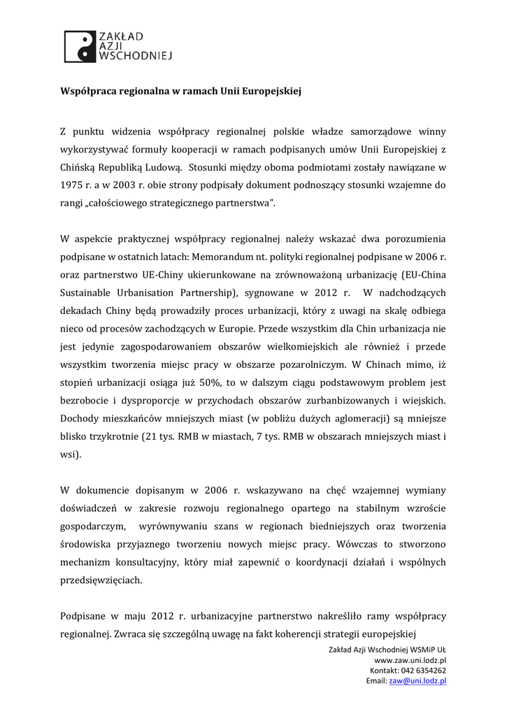 Współpraca regionalna w ramach Unii Europejskiej Z punktu widzenia współpracy regionalnej polskie władze samorządowe winny wykorzystywać formuły kooperacji w ramach podpisanych umów Unii Europejskiej z Chińską Republiką Ludową. Stosunki między oboma podmiotami zostały nawiązane w 1975 r. a w 2003 r. obie strony podpisały dokument podnoszący stosunki wzajemne do rangi „całościowego strategicznego partnerstwa”. W aspekcie praktycznej współpracy regionalnej należy wskazać dwa porozumienia podpisane w ostatnich latach: Memorandum nt. polityki regionalnej podpisane w 2006 r. oraz partnerstwo UE-Chiny ukierunkowane na zrównoważoną urbanizację (EU-China Sustainable Urbanisation Partnership), sygnowane w 2012 r. W nadchodzących dekadach Chiny będą prowadziły proces urbanizacji, który z uwagi na skalę odbiega nieco od procesów zachodzących w Europie. Przede wszystkim dla Chin urbanizacja nie jest jedynie zagospodarowaniem obszarów wielkomiejskich ale również i przede wszystkim tworzenia miejsc pracy w obszarze pozarolniczym. W Chinach mimo, iż stopień urbanizacji osiąga już 50%, to w dalszym ciągu podstawowym problem jest bezrobocie i dysproporcje w przychodach obszarów zurbanbizowanych i wiejskich. Dochody mieszkańców mniejszych miast (w pobliżu dużych aglomeracji) są mniejsze blisko trzykrotnie (21 tys. RMB w miastach, 7 tys. RMB w obszarach mniejszych miast i wsi). W dokumencie dopisanym w 2006 r. wskazywano na chęć wzajemnej wymiany doświadczeń w zakresie rozwoju regionalnego opartego na stabilnym wzroście gospodarczym, wyrównywaniu szans w regionach biedniejszych oraz tworzenia środowiska przyjaznego tworzeniu nowych miejsc pracy. Wówczas to stworzono mechanizm konsultacyjny, który miał zapewnić o koordynacji działań i wspólnych przedsięwzięciach. Podpisane w maju 2012 r. urbanizacyjne partnerstwo nakreśliło ramy współpracy regionalnej. Zwraca się szczególną uwagę na fakt koherencji strategii europejskiej Zakład Azji Wschodniej WSMiP UŁ www.zaw.uni.lodz.pl Kontakt: 042 6354262 Email: [email protected] „Europa 2020” z 12 Planem 5-letnim realizowanym w Chinach. W dokumencie przedstawiono 12 głównych obszarów współpracy: planowanie rozbudowy miast i gospodarki przestrzennej, rozbudowy usług publicznych na obszarach miejskich, rozwój infrastruktury miejskiej oraz sposobów jej finansowania, bezpieczeństwo energetyczne obszarów miejskich, rozwój transportu miejskiego, energooszczędnego budownictwa, ekologiczny rozwój miast, ochrona zabytków i rewitalizacja, zarządzanie miastem, rozwój obszarów wiejsko-miejskich oraz wymiana pracowników szczebla administracyjnego. Strona polska powinna aktywnie włączyć się w prowadzone warsztaty, konferencje i spotkania takie jak: Forum Merów Miast UE-Chiny, EC Link Project, EU-China Emissions Trading Scheme, EU-China Social Protection Reform Project, EU-China DisasterRiskManagment Project, Satelite Cities oraz Metropolitan Governance Project. Ponadto w oparciu o formułę partnerstwa urbanizacyjnego polskie samorządy mogą, poprzez uczestnictwo w różnego rodzaju targach np. EU-China Exhibition on Urban Development, które odbyły się w 2013 r. w Pekinie czy warsztatach dotyczących innowacyjności w przestrzeni miejskiej które odbyły się w Foshan (prowincja Guangdong) w maju 2013 r., promować współpracę małych i średnich firm a także przedstawiać własną ofertę inwestycyjną. Forum Merów Miast UE-Chiny jest flagowym forum mającym na celu wspieranie współpracy w ramach moderowania procesów urbanizacyjnych. Takie spotkania odbyły się w Brukseli (wrzesień 2012 r.). Kluczowym dokumentem podpisanym w trakcie spotkanie była Karta Prezydentów Unii Europejskiej i Chin w którym zapewniono, iż celem nadrzędnym jest rozbudowa i zarządzanie procesami urbanizacyjnymi przyjaznych środowisku (Eco-city). Obie strony zobowiązały się również do wymiany doświadczeń z zakresu zarządzania przestrzeniami miejskimi, wspieraniu rozwoju przemysłu i tworzeniu miejsc pracy w obszarach ułatwianiu zurbanizowanych, kontaktów w tworzenia zakresie środowiska planowania przyjaznego przestrzennego inwestycjom, w postaci organizowanych konferencji, szkoleń oraz misji gospodarczych. Zakład Azji Wschodniej WSMiP UŁ www.zaw.uni.lodz.pl Kontakt: 042 6354262 Email: [email protected] Władze samorządowe powinny wykorzystywać zapisy przyjętego Plan strategiczny współpracy Unia Europejska-Chiny 2020 (EU-China 2020 Strategic Agenda for Cooperation) podpisanego na 16 szczycie UE-Chiny w listopadzie 2013 r.. Głównie w aspektach rolnictwa, transportu i logistyki, wymiany międzyludzkiej oraz rozwoju obszarów miejskich. W przypadku rolnictwa na co wskazuje agenda 2020 istotne będą polskie doświadczenia z zakresu kontroli jakości żywności oraz bezpieczeństwa sanitarno-epidemiologicznego. W aspekcie transportu i logistyki wskazuje się na konieczność rozwoju transportu morskiego, kołowego i kolejowego. Z punktu widzenia chińskiej koncepcji "mostu euro-azjatyckiego" perspektywicznym będzie transport lądowy, w tym funkcjonujące połączenie kolejowe z Chengdu do Łodzi. Ponadto władze samorządowe mogą brać aktywny udział w promocji polskiej transformacji na szczeblu lokalnym w odniesieniu m.in. do efektywnego wykonywania budżetu czy też budżetów obywatelskich. Agenda 2020 wspiera rozwój partnerskich relacji między miastami europejskimi a chińskimi. Przykładem dla polskich samorządów winno być partnerstwo Bonn i Chengdu, które nawiązane zostało w 2013 r. Również współpraca regionalna przedstawiana jest przez UE i Chiny jako priorytetowa. i ujęta w formule EU-China High Level Dialogue and Seminar on Regional Policy. Zwraca się uwagę na wymianę personelu administracyjnego szczebla regionalnego oraz wspólne planowanie przyszłego rozwoju na szczeblu lokalnym. Istotnym punktem jest również podkreślenie ważności wym